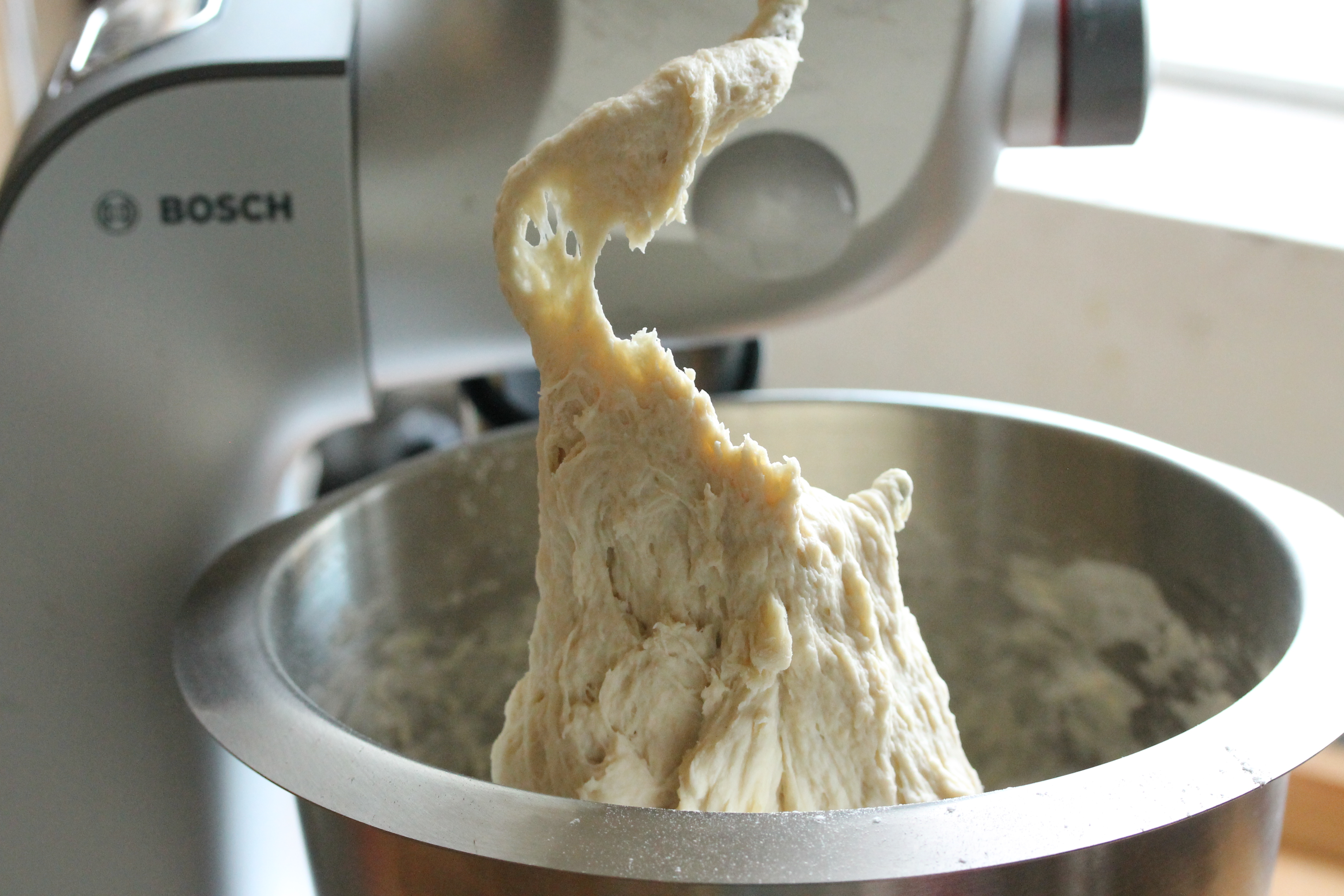 Ég hélt bara áfram að bæta við hveiti þar til deigið var þykkt og seigt og seig mjög hægt undan eigin þunga af deigkróknum þegar honum var lyft. Eða nánar til tekið þar til það var lint og klesstist við hendur svo ekki var hægt að hnoða það en þó hægt að taka aðeins á því með hveitistráðum höndum.