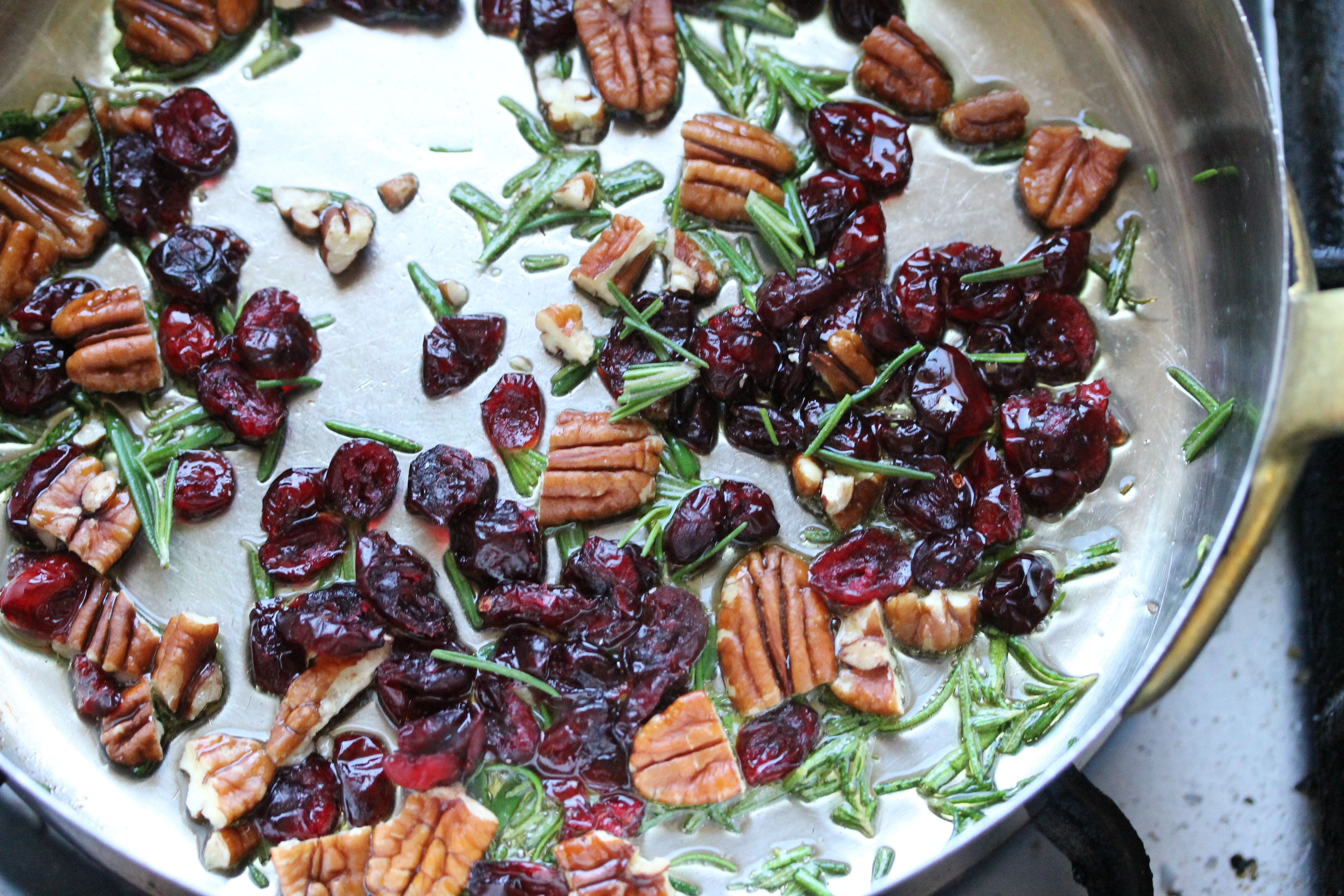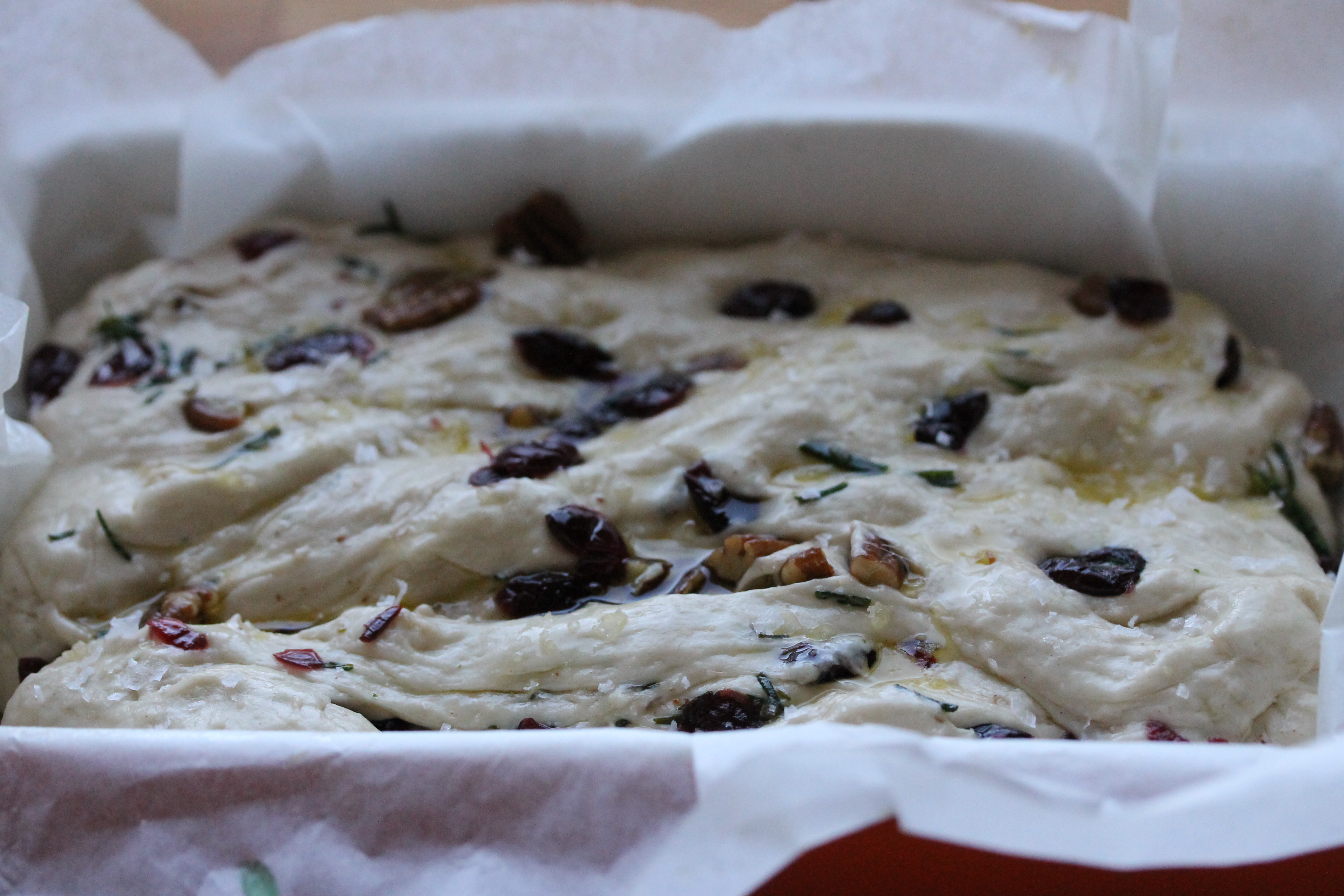 Þá tók ég deigkrukkuna úr kæli. Hitaði 1 msk af ólífuolíu á pönnu, setti á hana 2-3 msk af trönuberjum (mega líka vera rúsínur), 2-3 msk af gröfsöxuðum pekanhnetum (eða valhnetum) og svona 1 msk af söxuðum rósmarínnálum og lét krauma í nokkrar mínútur án þess að brenna. Lét þetta svo kólna aðeins.