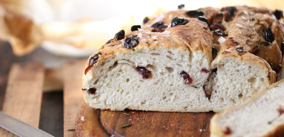 Sem var einmitt það sem ég gerði; ég bakaði baguettebrauð með matnum í gærkvöldi en geymdi tæplega helminginn af deiginu og bakaði í morgun brauð með trönuberjum, pekanhnetum og rósmaríni.