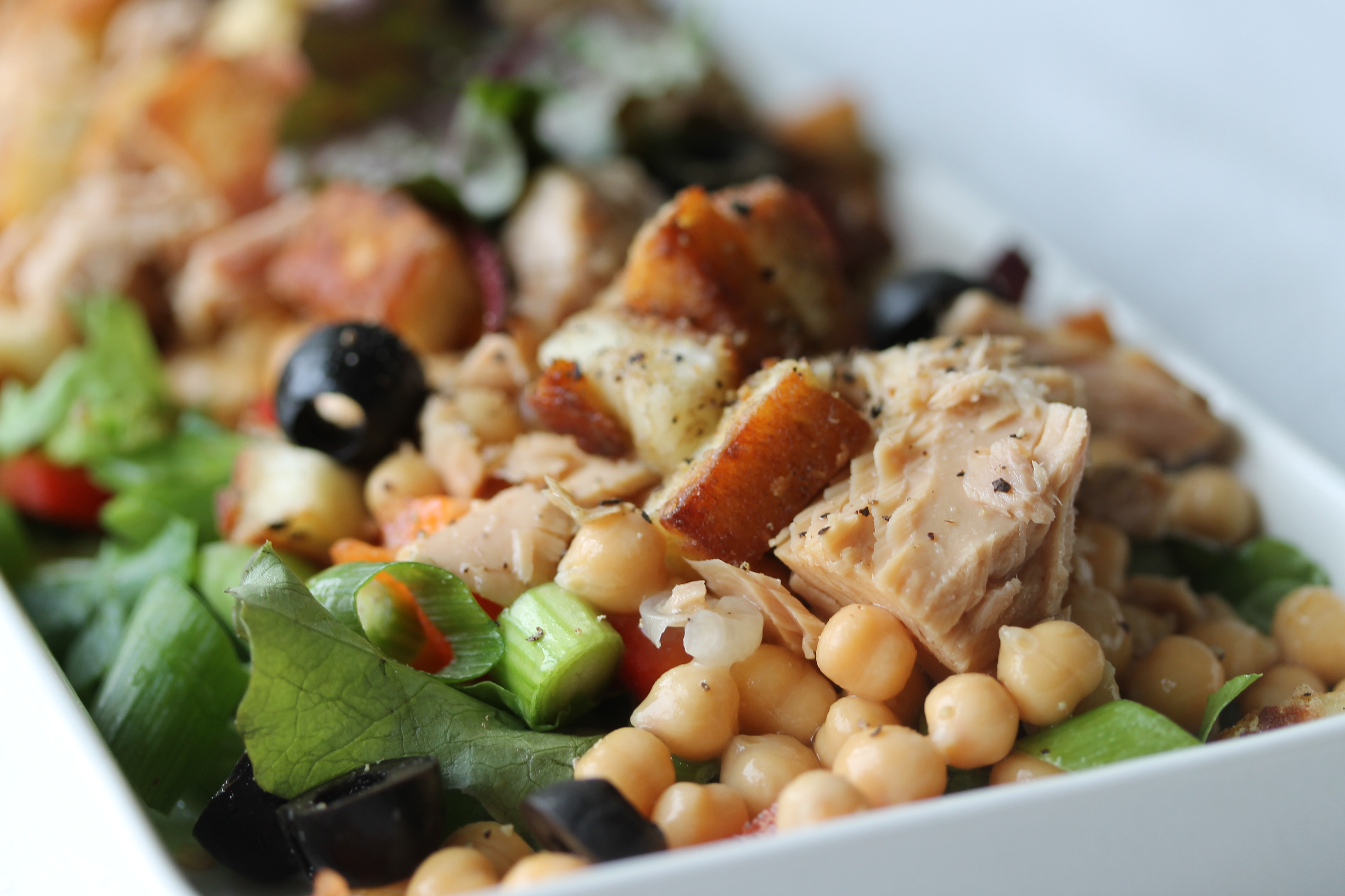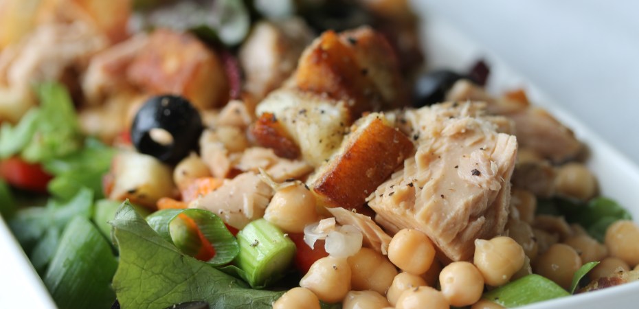 Það sem ég átti var túnfiskur í olíu (má vera í vatni en þá þarf aðeins meiri olíu til að steikja ostinn ), kjúklingabaunir í dós, halloumi-ostur (ég notaði svona 100 gramma bita), 1 msk af hveiti til að velta honum upp úr – það er ekki bráðnauðsynlegt ef maður vill sleppa hveiti en mér finnst það betra – 1 lítil rauð paprika, 2 vorlaukar, salatblaðablanda, fáeinar ólífur, 1/2 sítróna, 2 msk af ólífuolíu, pipar og svolítið salt.