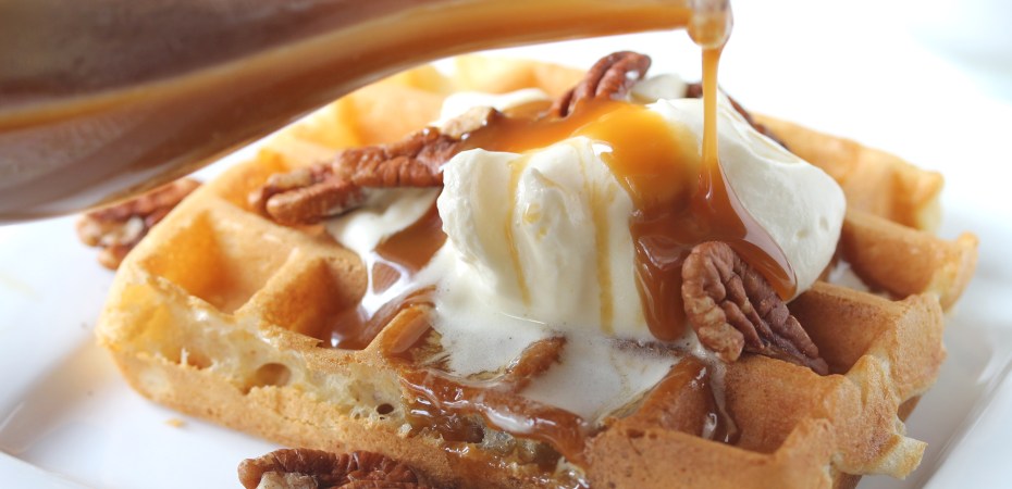 Ég hellti svo volgri sósunni í flösku og bar hana fram með vöfflunum, ásamt þeyttum rjóma og pekanhnetum. Hún er líka ansi góð til dæmis með ís.
