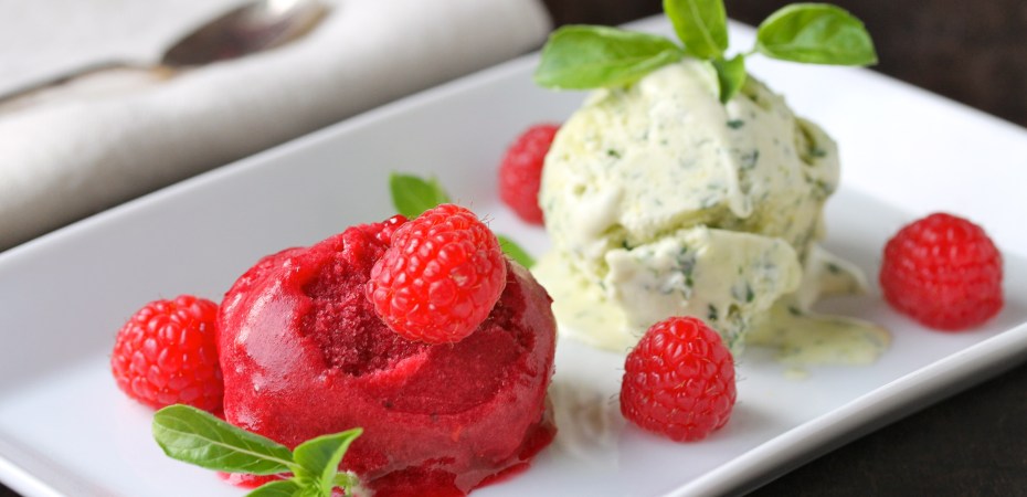 Ég tók bæði basilíkuísinn og sorbetið úr frysti nokkru áður en ég bar það fram til að láta það mýkjast dálítið svo hægt væri að skafa það upp með skeið (ísskeið ef hún er til, annars matskeið). Setti eina vel kúfaða skeið á hvern disk og skreytti með ferskum hindberjum og litlum basilíkulaufum af því að ég átti þetta til en það má líka sleppa því eða skreyta með einhverju öðru.