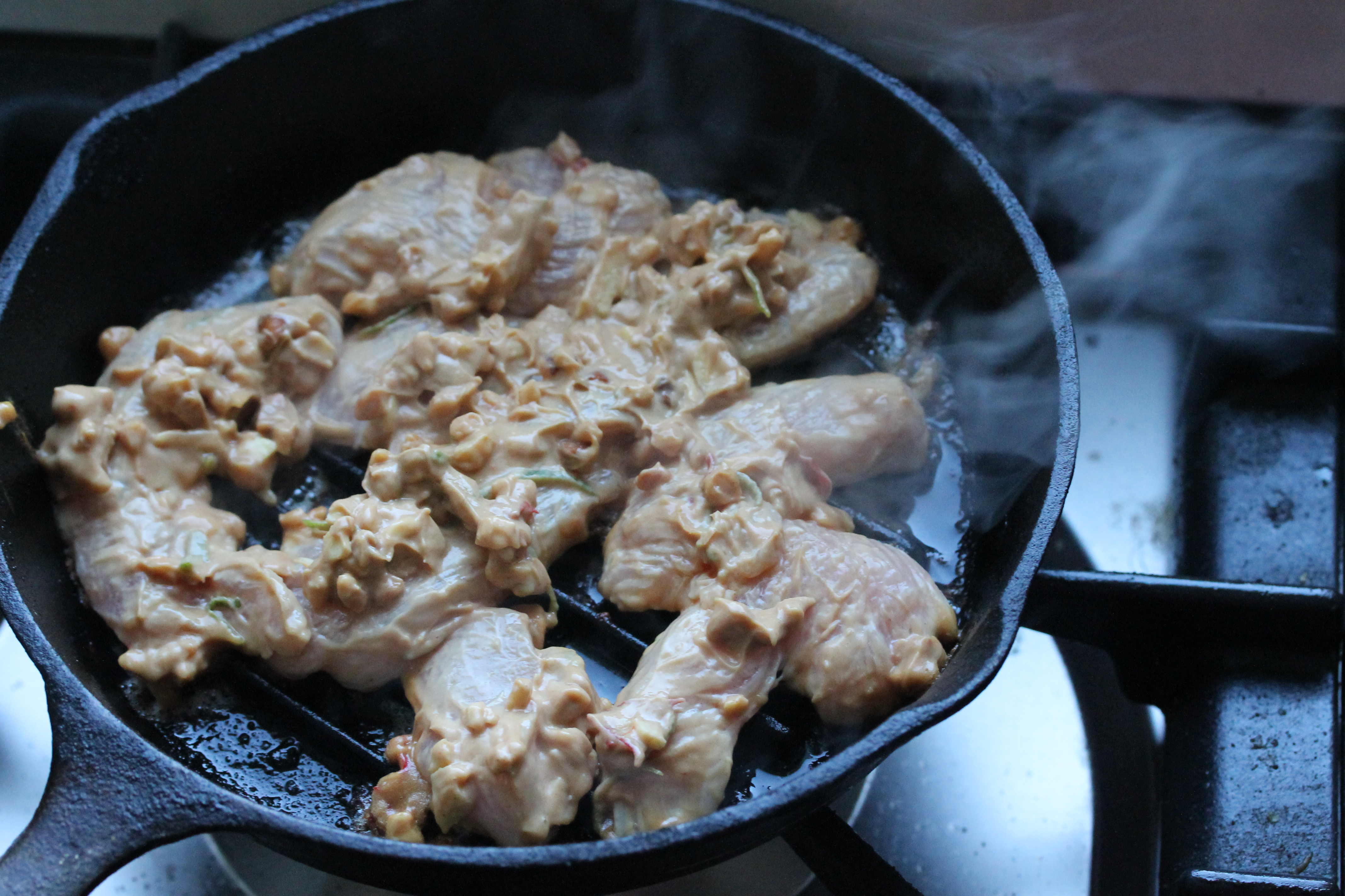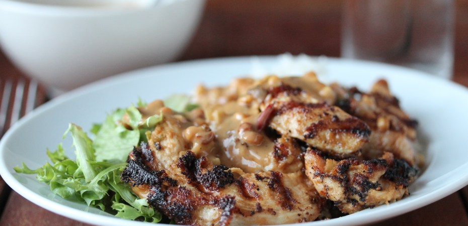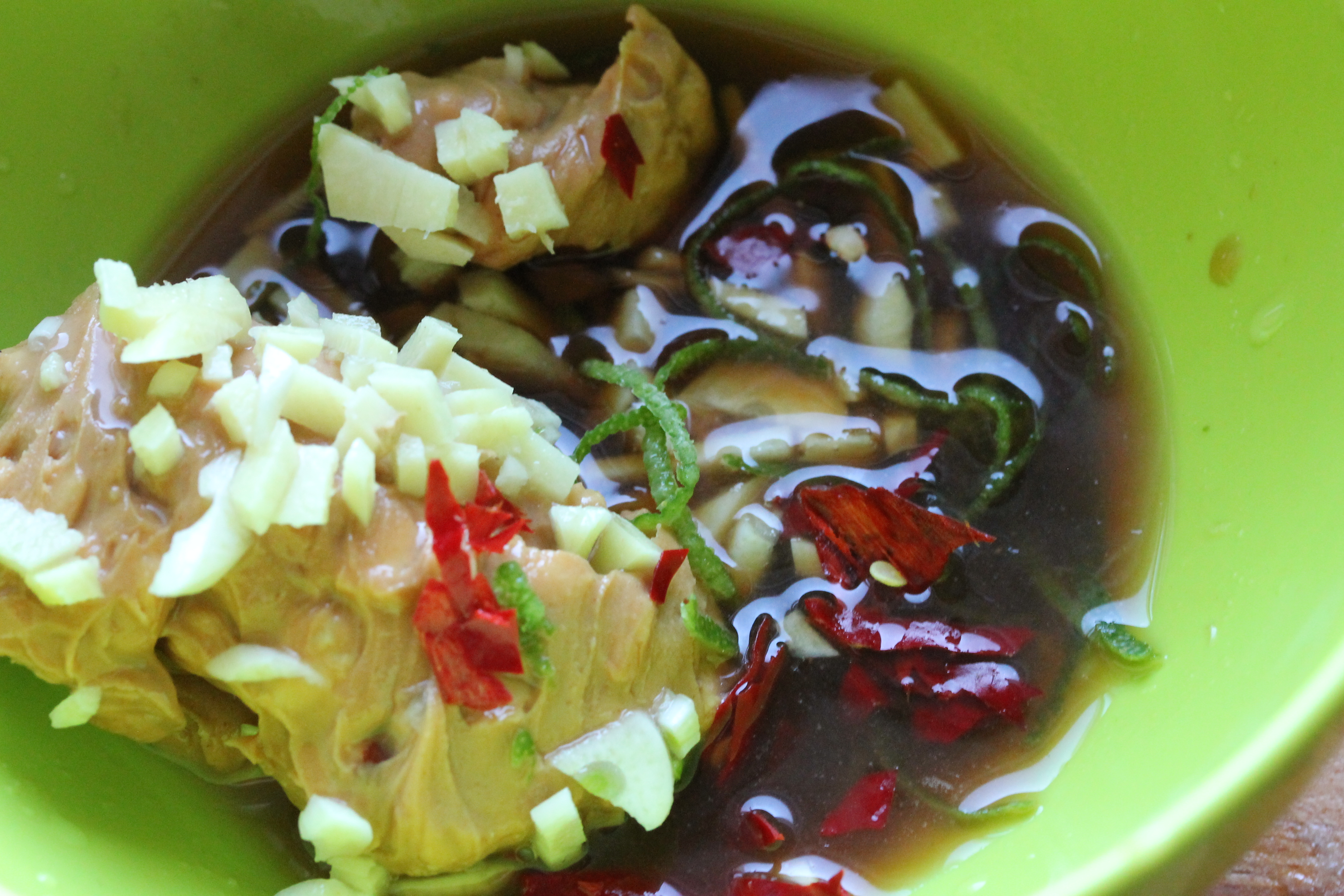 Í maríneringuna fór sirka þriðjungurinn af hnetusmjörinu, helmingurinn af sojasósunni og edikinu (en ekki hunagið), annar hvítlauksgeirinn, helmingurinn af engifernum og hálft chilialdin. Rifinn börkur af límónunni og helmingurinn af safanum.
