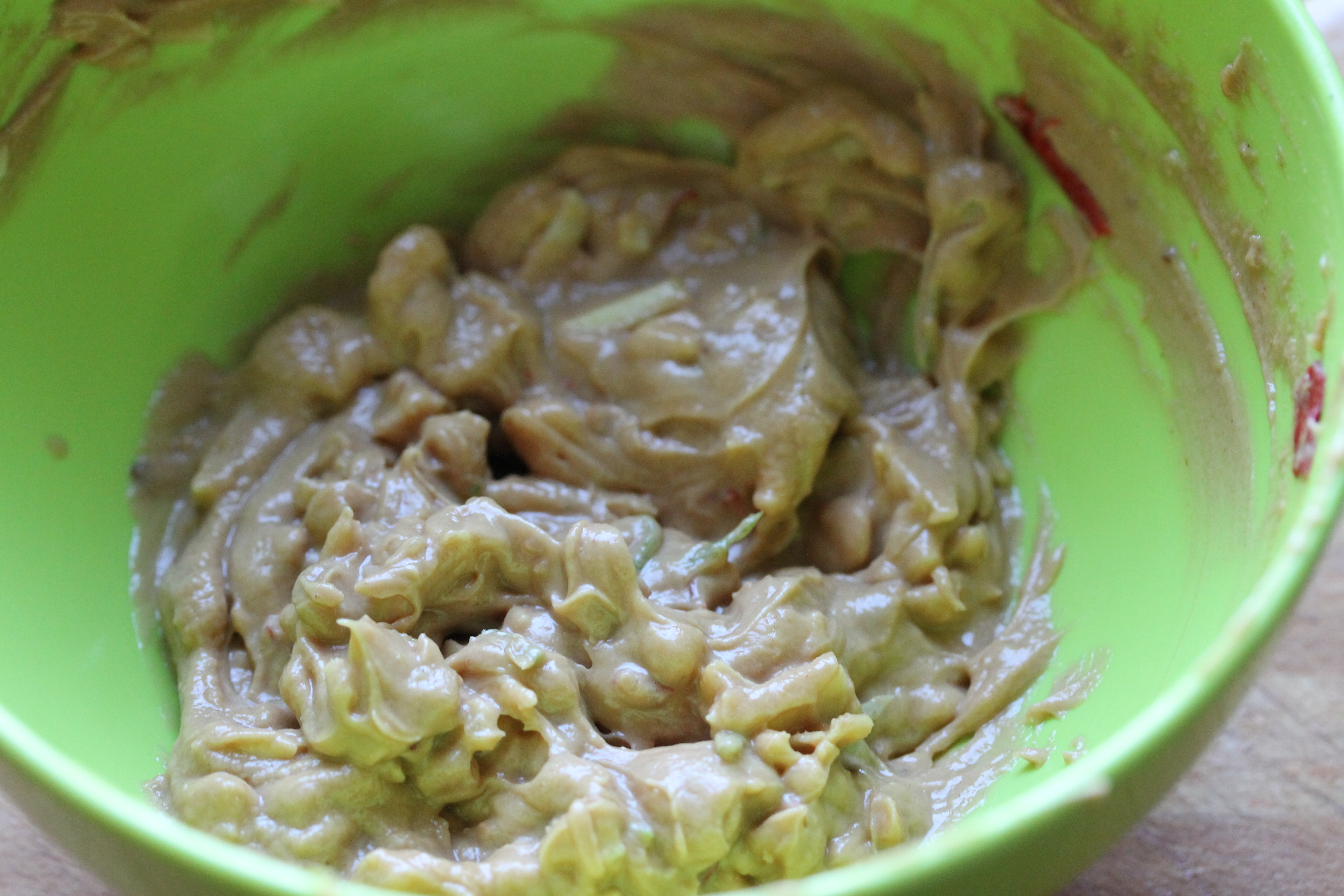 Á meðan setti ég afganginn af hnetusmjörinu í lítinn pott ásamt smáskvettu af vatni. Bætti við afganginum af sojasósunni og edikinu ásamt hunanginu og saxaði svo það sem eftir var af hvítlauk, engifer og chili smátt og setti út í. Kreisti safa úr hálfri límónu saman við, hitaði að suðu, hrærði vel og lét malla í nokkar mínútur við mjög hægan hita; þynnti aðeins með vatni eftir þörfum, smakkaði og bragðbætti aðeins.
