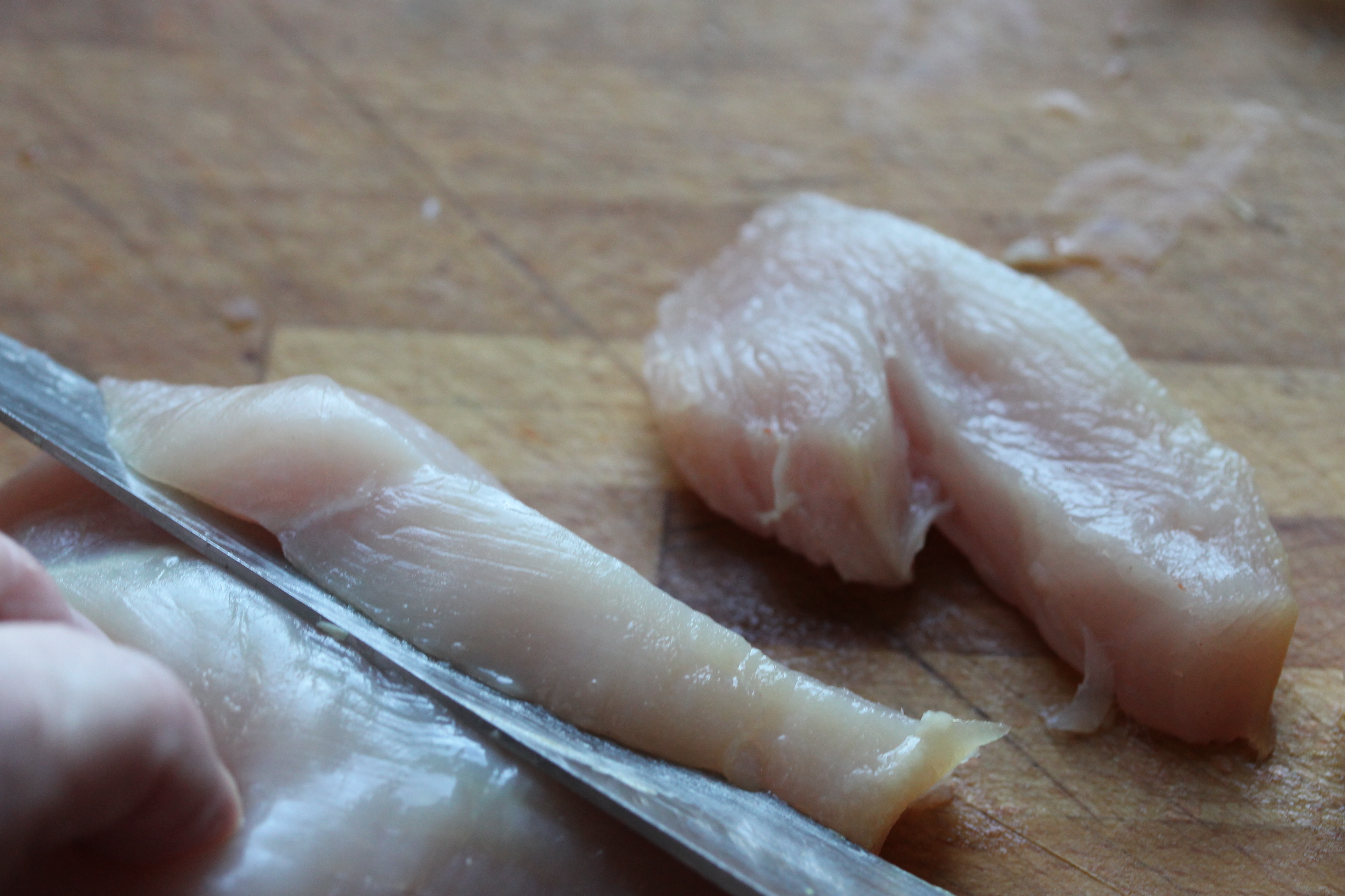 Ég tók kjúklingabringuna og skar hana þvert yfir í svona sentímeters breiða strimla.