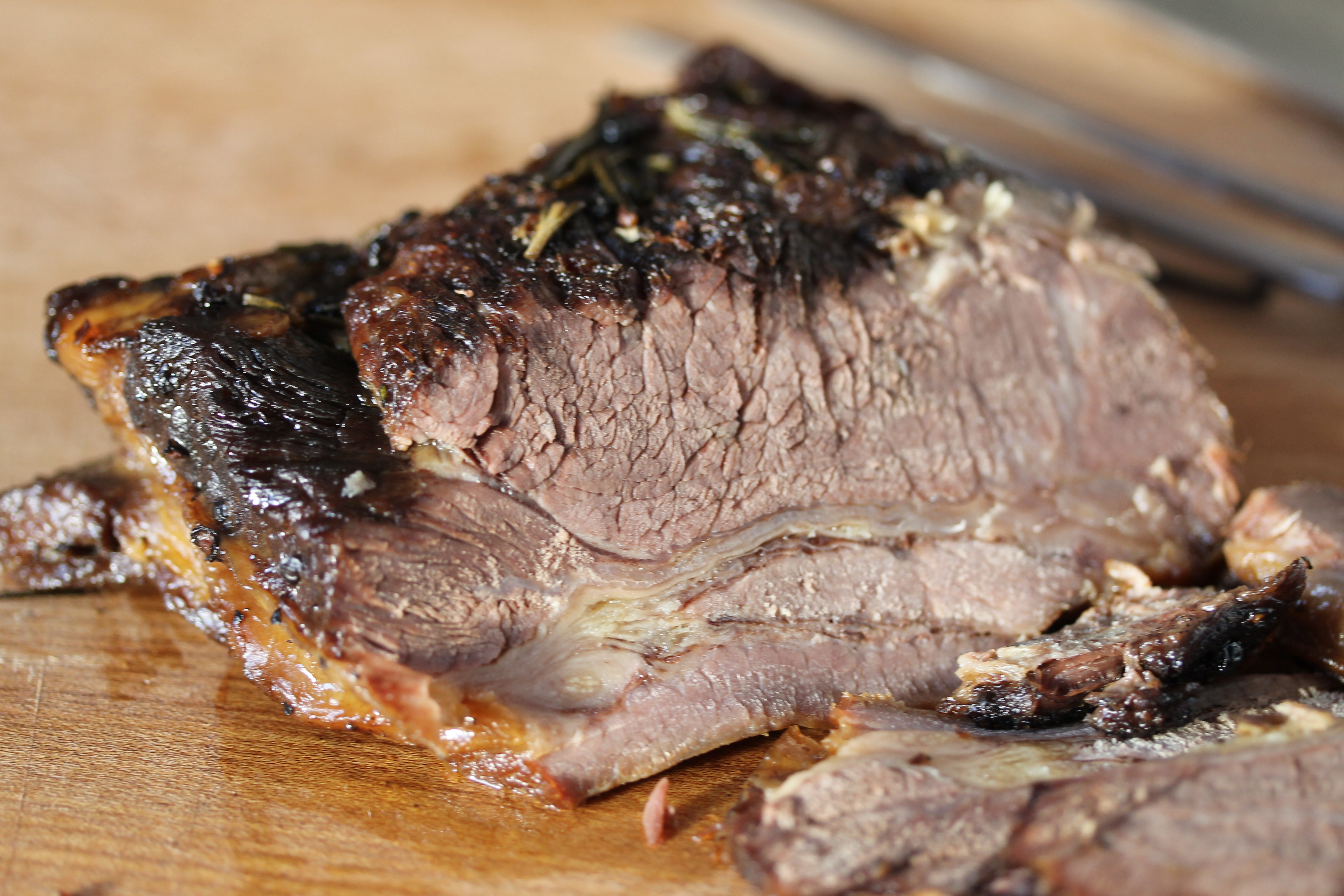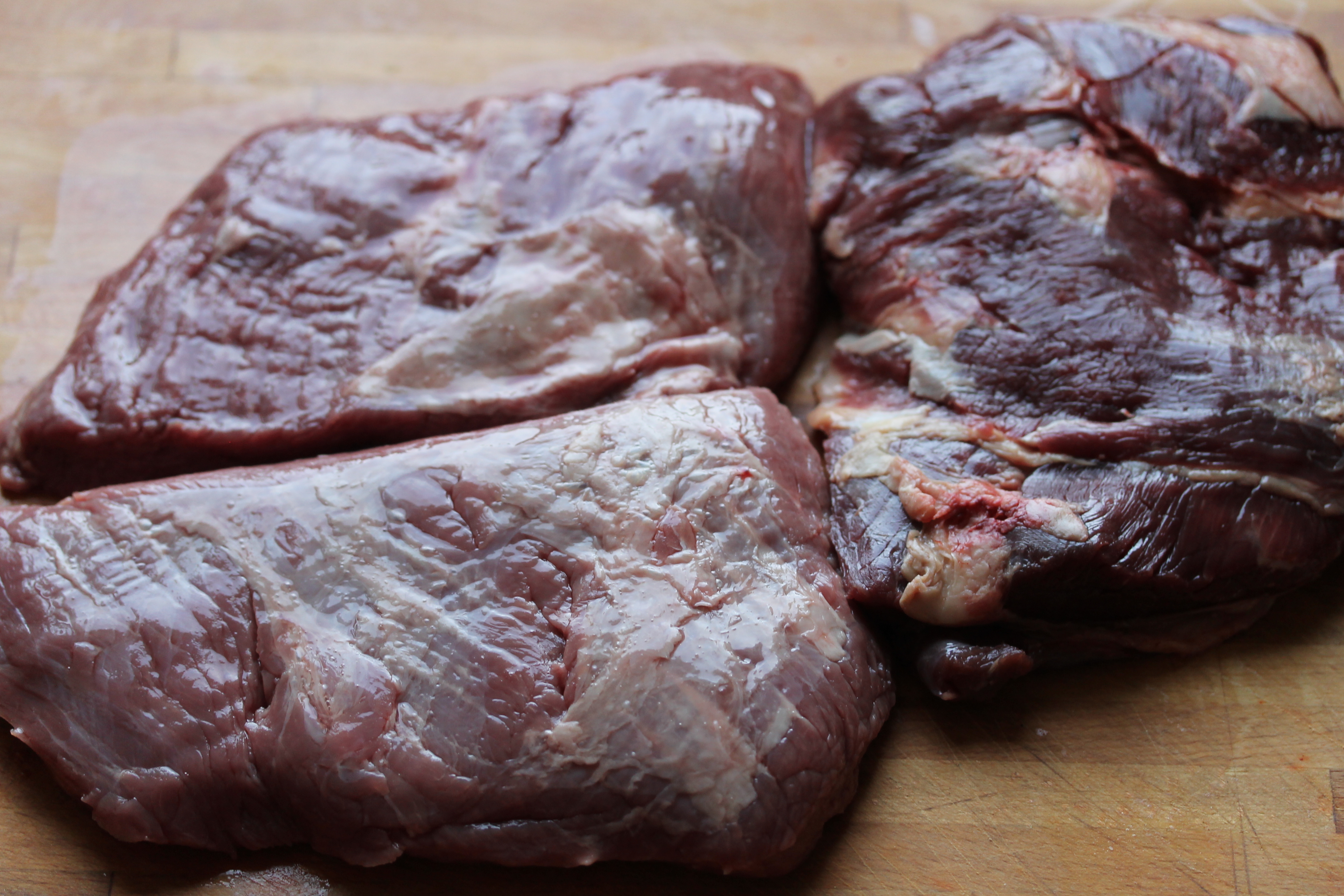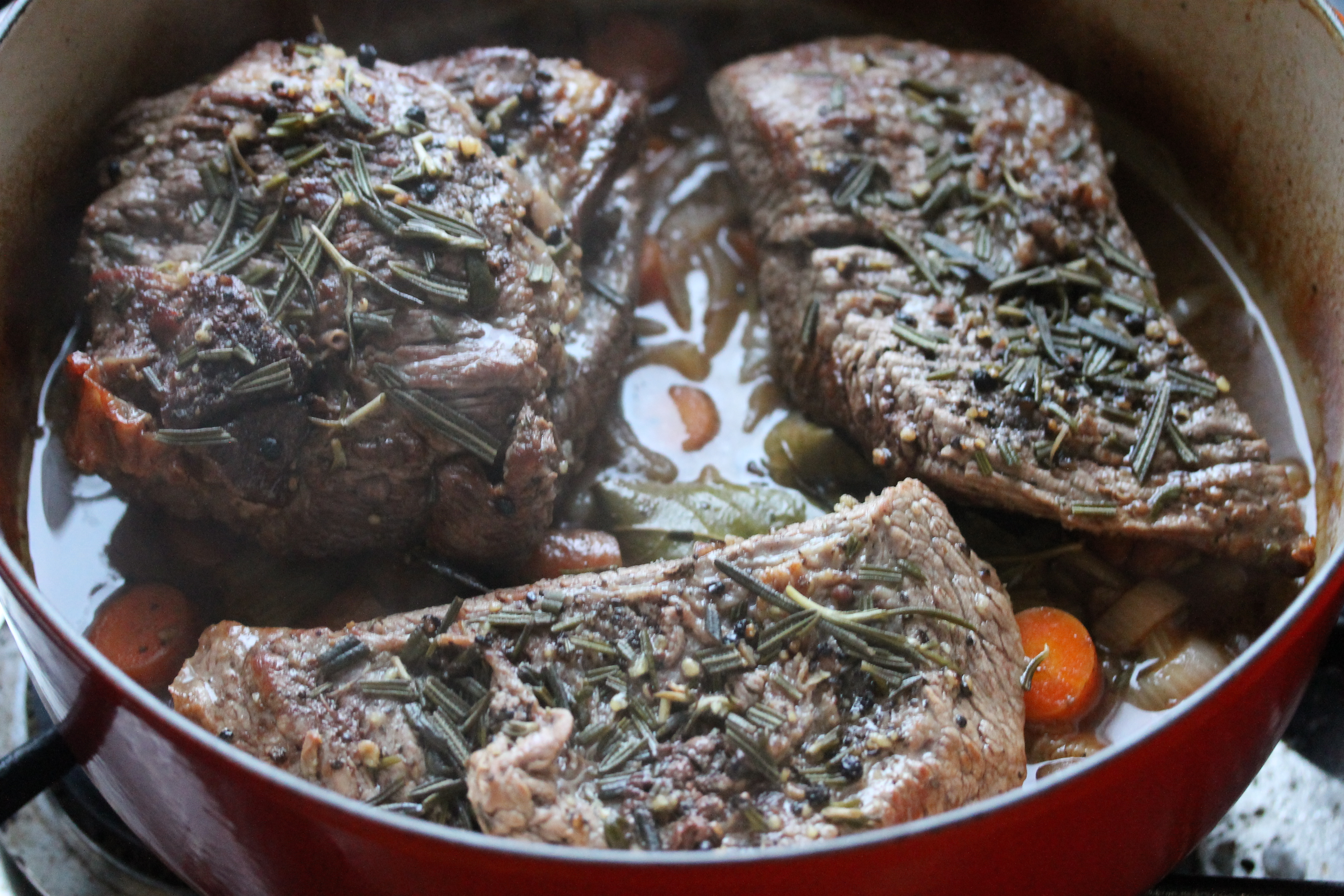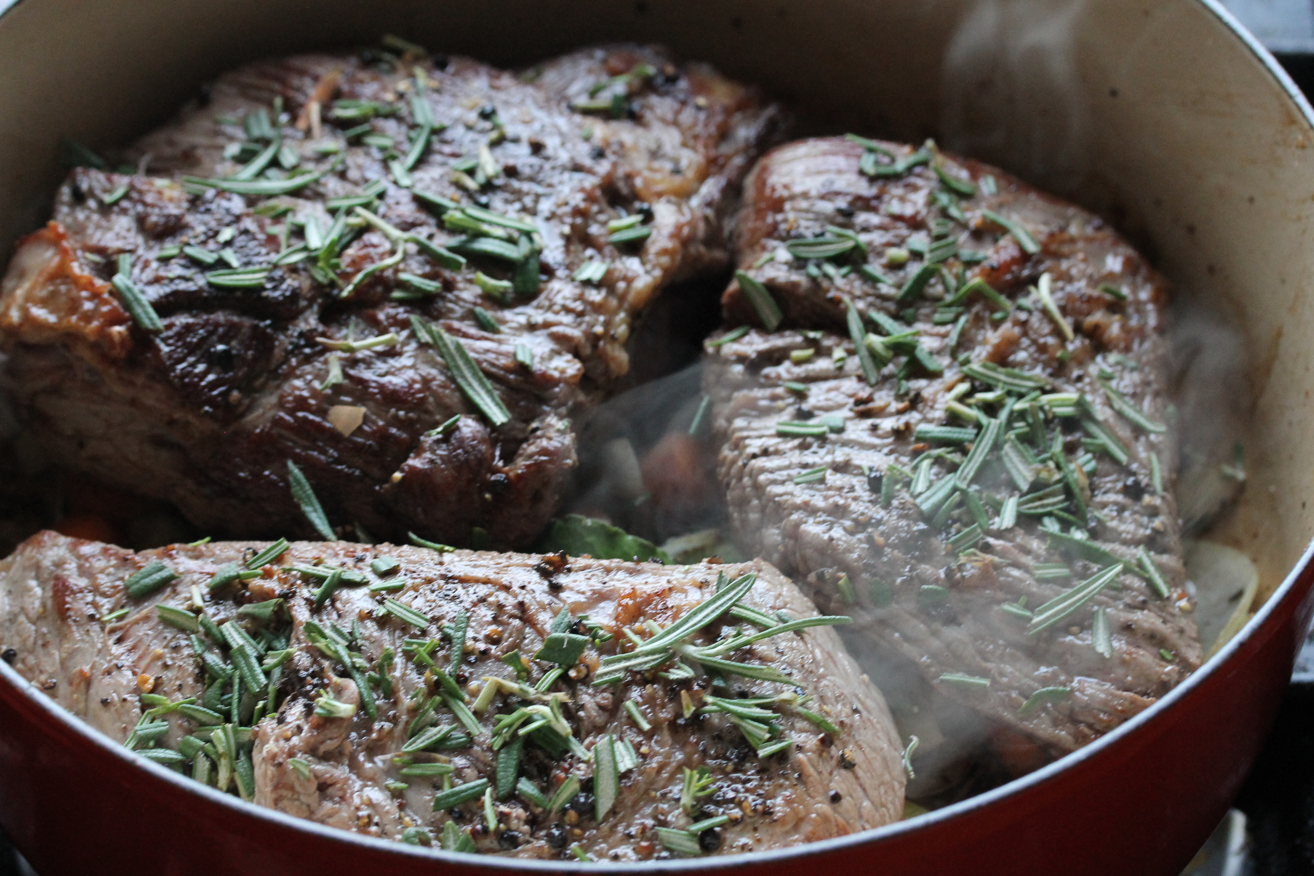 Þetta er gróft kjöt með miklum bandvef og afar langt frá því að vera meyrt svo að það þarf langa, hæga, raka steikingu við vægan hita. Ég byrjaði matseldina um eða upp úr klukkan þrjú.
