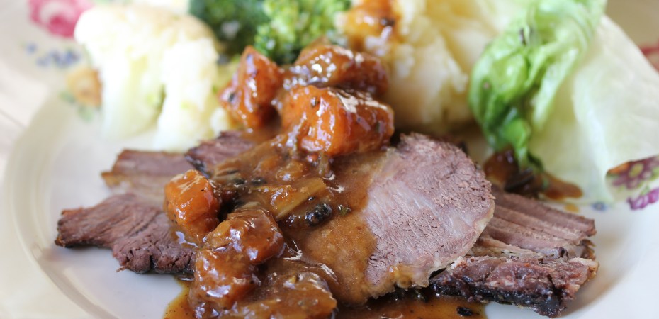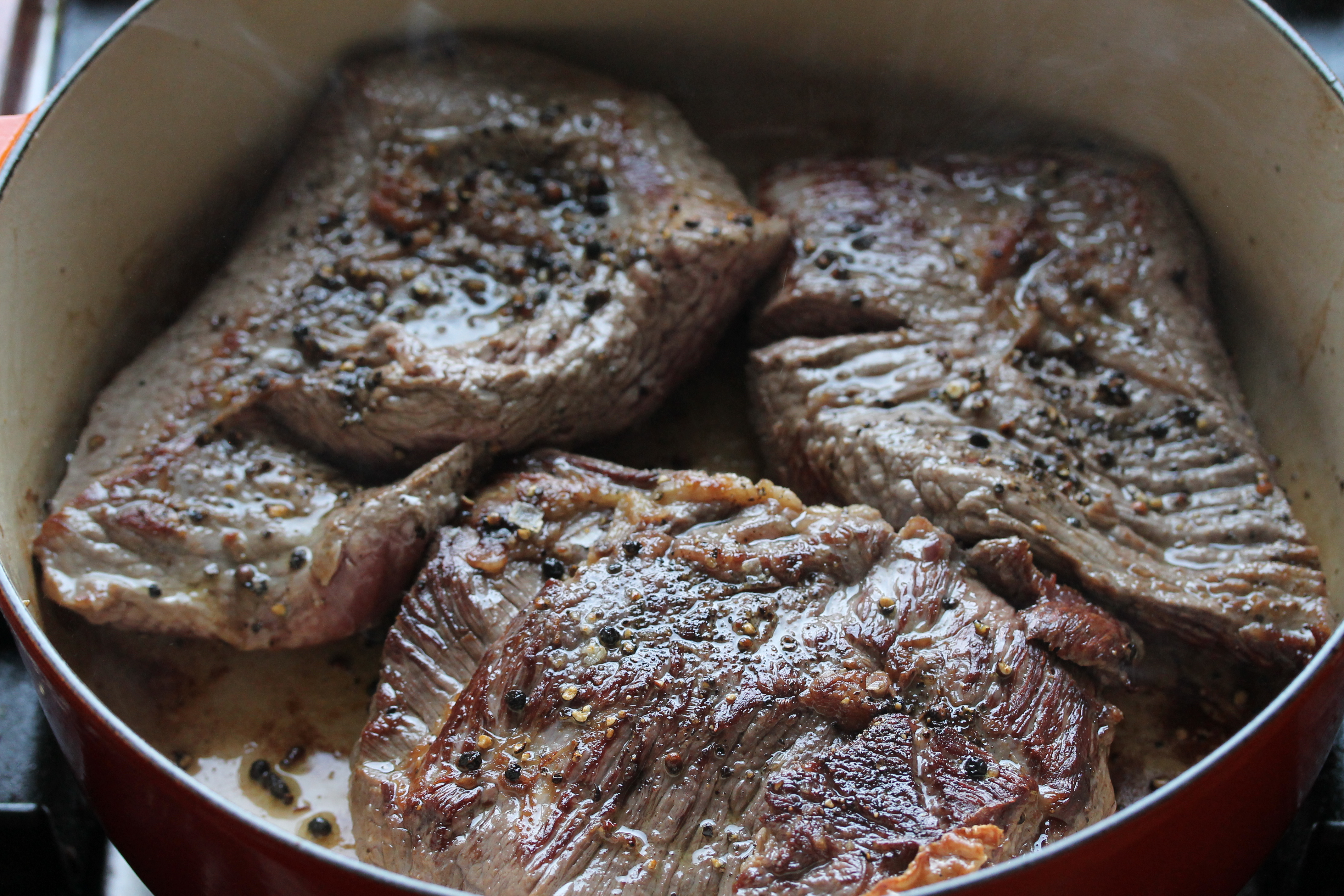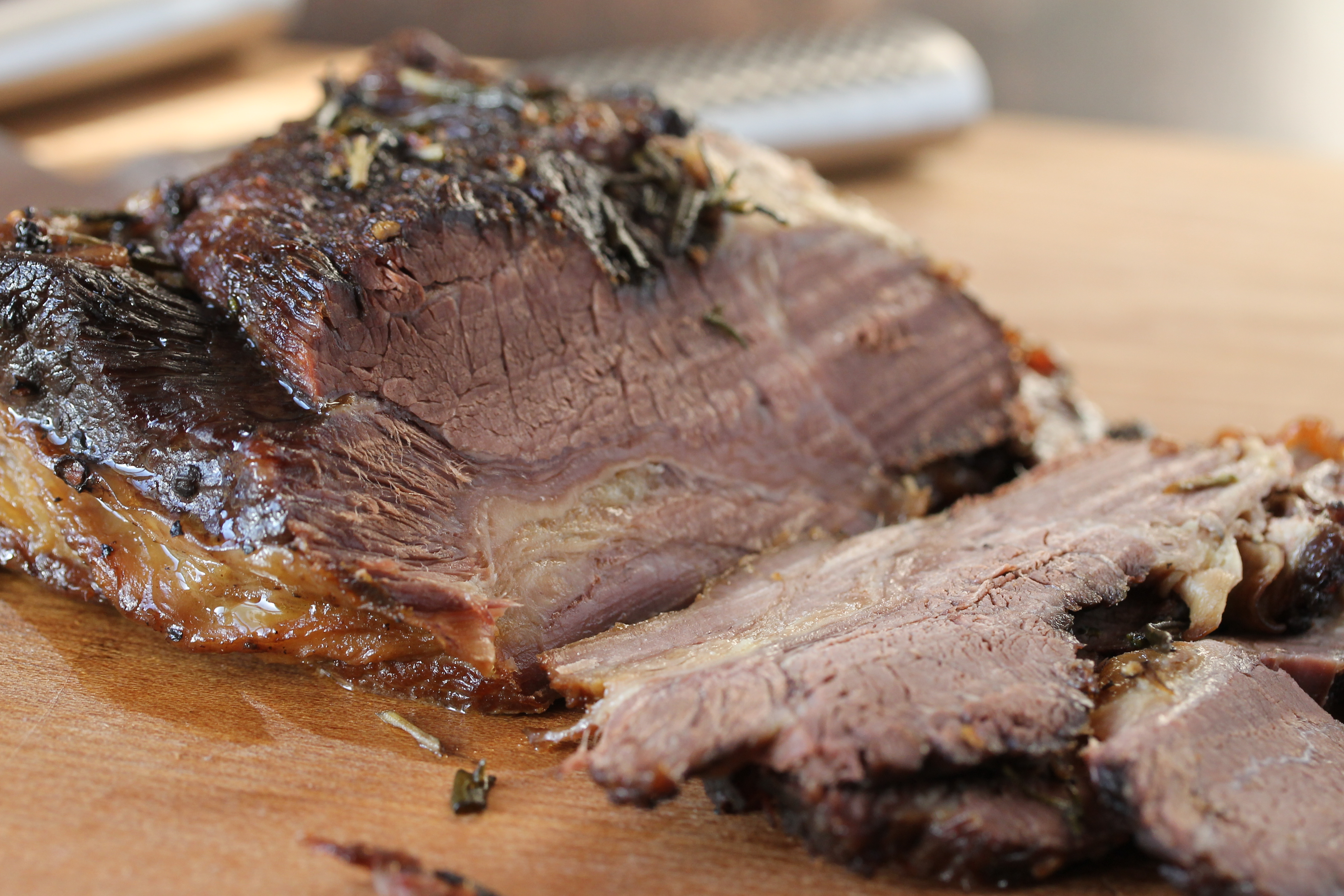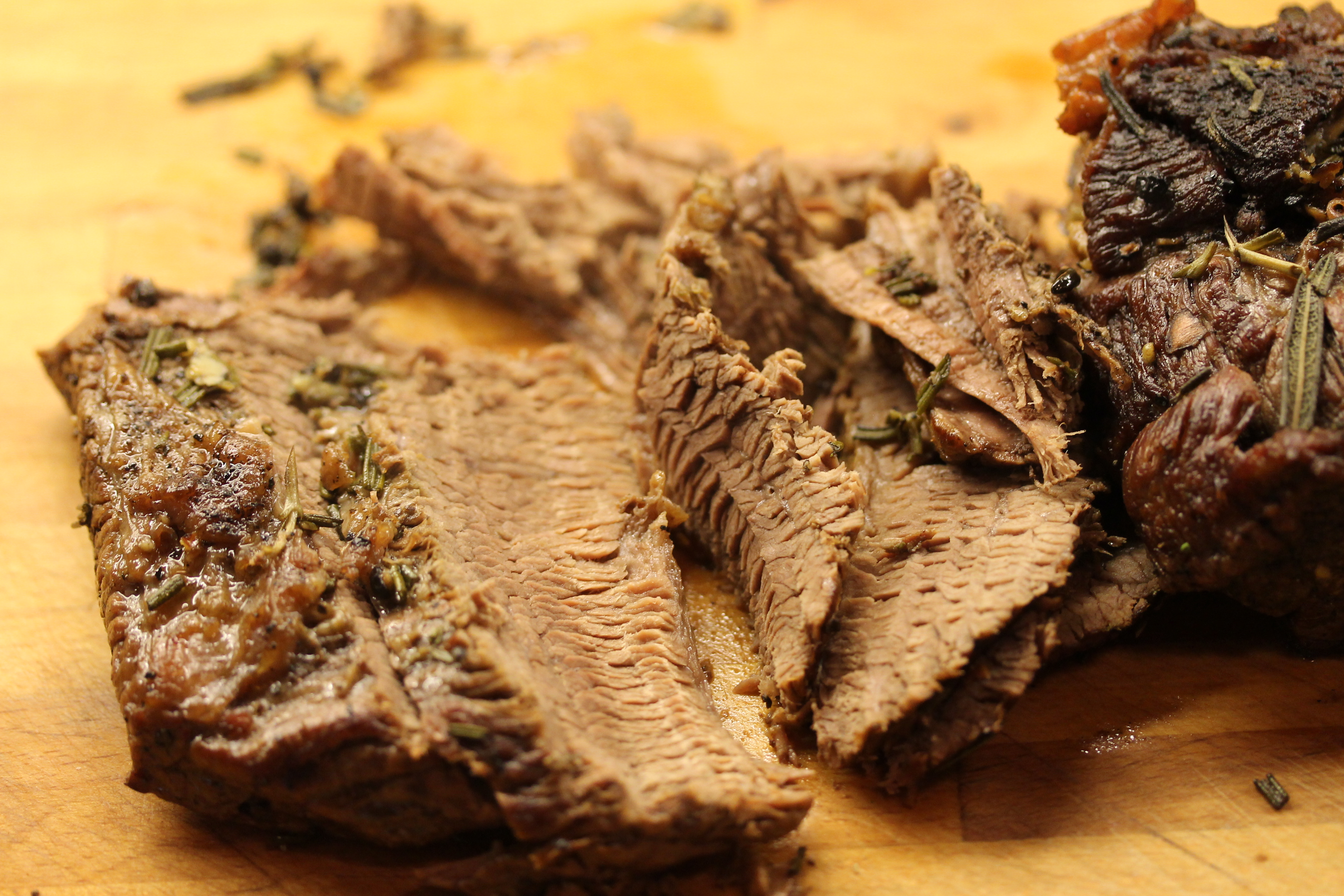 Þetta er gróft kjöt með miklum bandvef og afar langt frá því að vera meyrt svo að það þarf langa, hæga, raka steikingu við vægan hita. Ég byrjaði matseldina um eða upp úr klukkan þrjú.