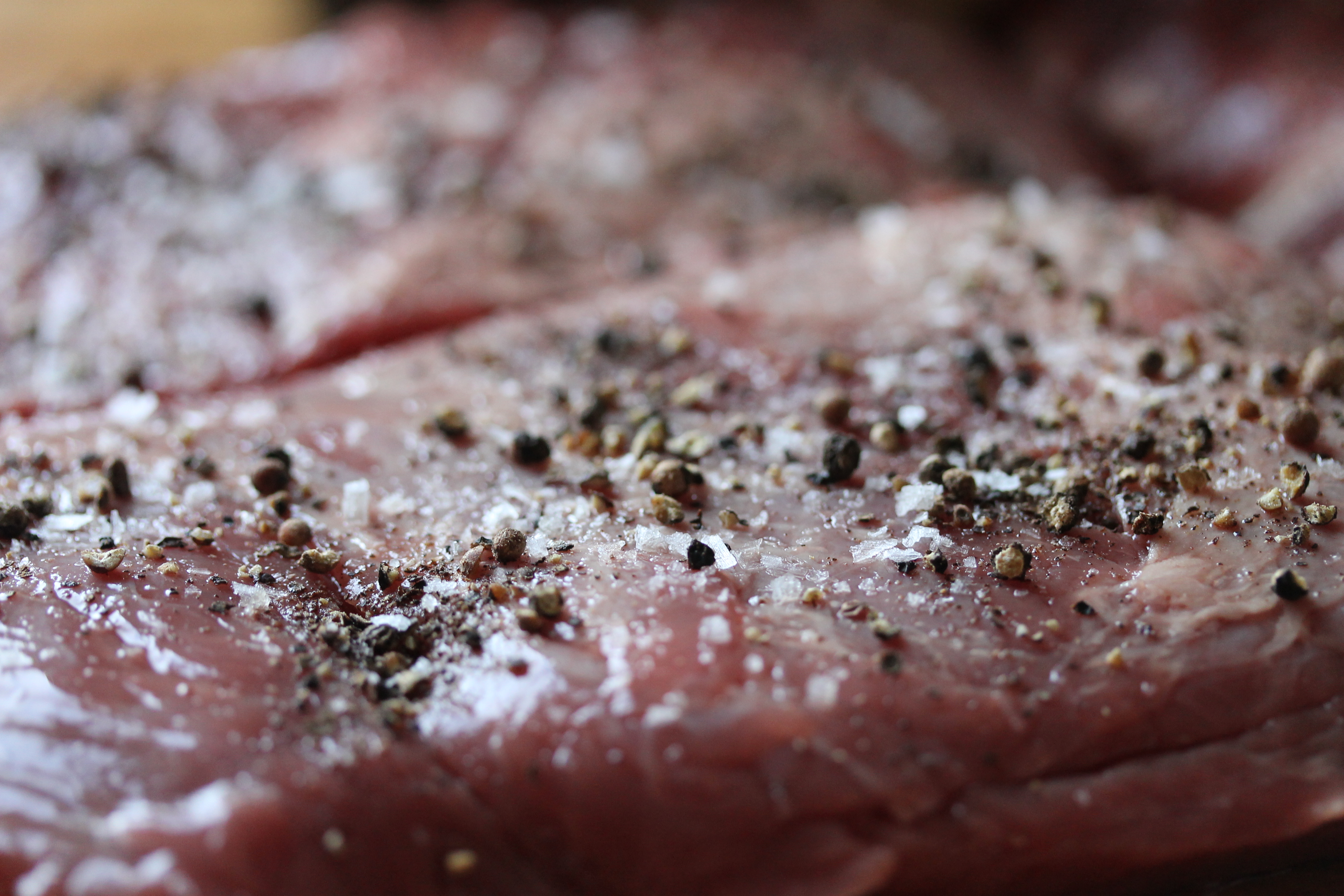 Ég byrjaði á að krydda kjötið á báðum hliðum með nokkuð miklum, grófsteyttum svörtum pipar og flögusalti. Kveikti um leið á ofninum og stillti hann á 140°C.