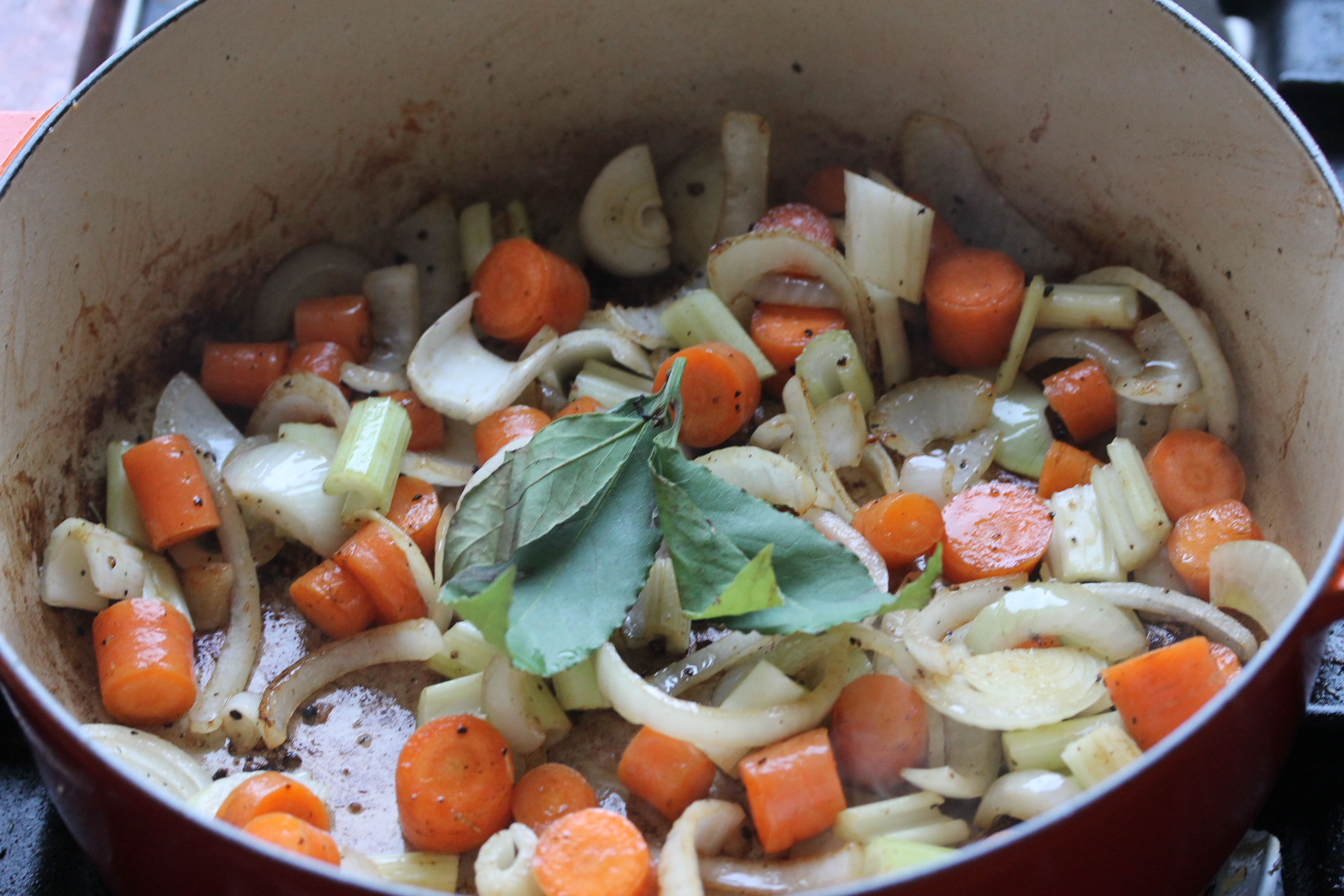 Ég var búin að skera niður tvo lauka og setti þá í pottinn og lét krauma við meðalhita í nokkrar mínútur. Á meðan skar ég 250 g af gulrótum og 2-3 sellerístöngla í bita og setti þá svo út í, ásamt nokkrum lárviðarlaufum (má sleppa ef maður á ekki lárviðarlauf en þau er til bóta) og lét krauma í 2-3 mínútur í viðbót.