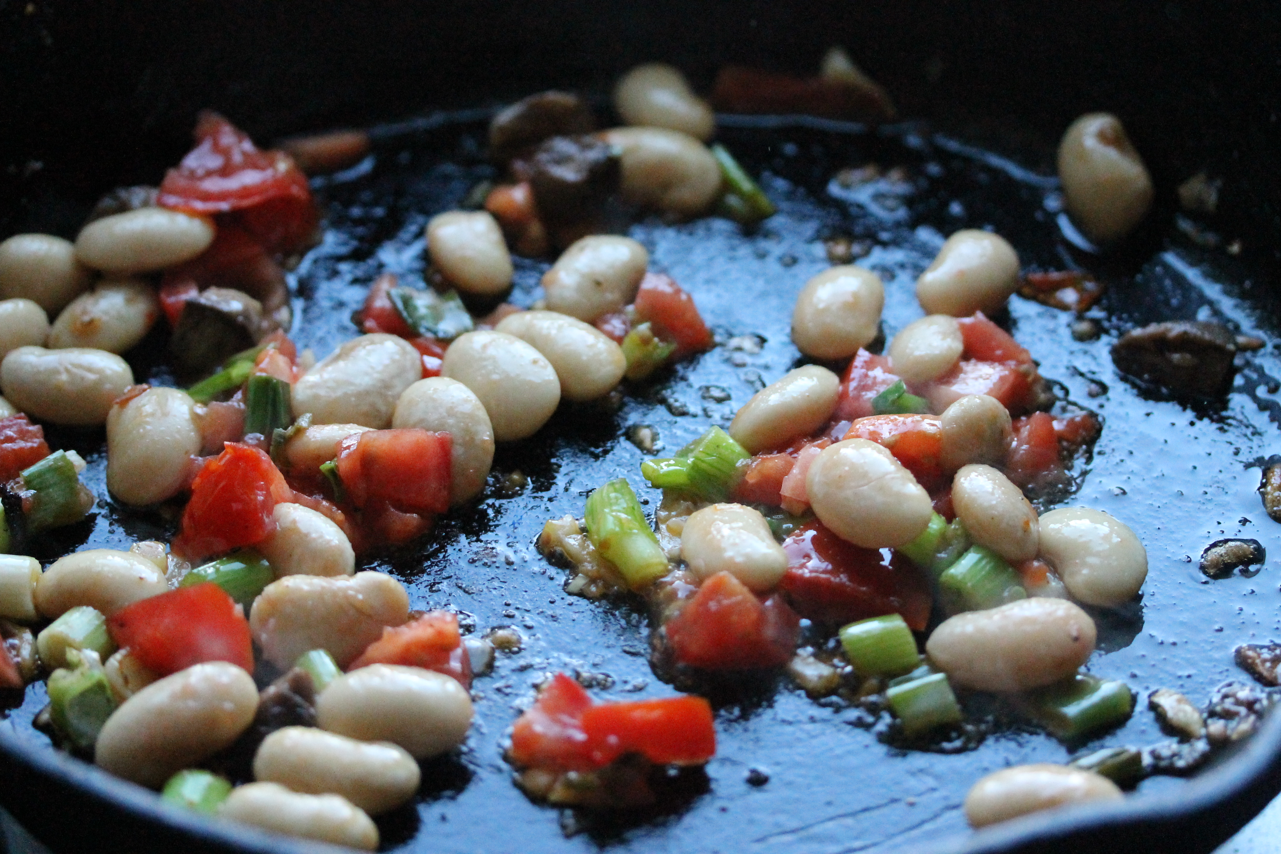 Síðan hitaði ég afganginn af olíunni á pönnu og lét tómata, sveppaleggi, vorlauk og hvítlauk krauma í henni við nokkrar mínútur.