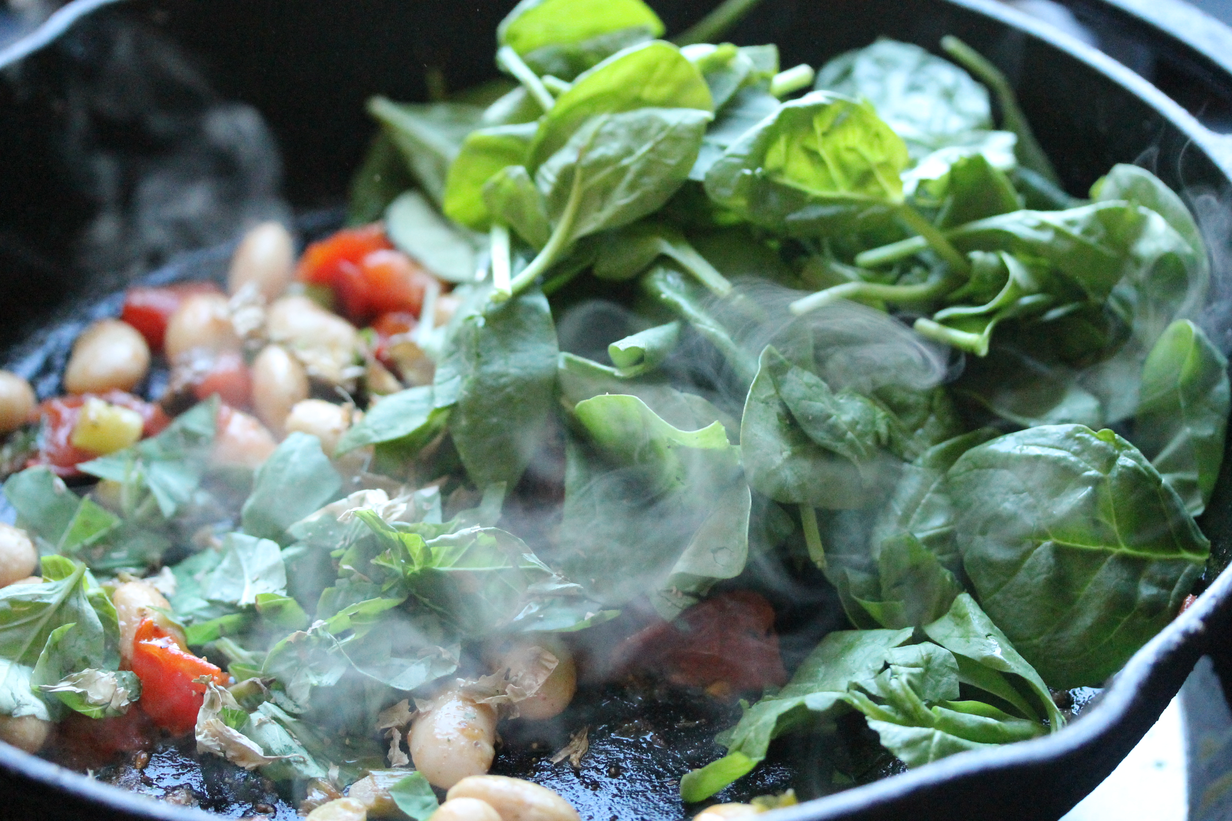 Hellti baununum í sigti, lét renna af þeim og setti þær svo á pönnuna ásamt spínatinu og basilíkunni, ef hún er notuð. Kryddaði með pipar og salti og lét krauma í 1-2 mínútur.