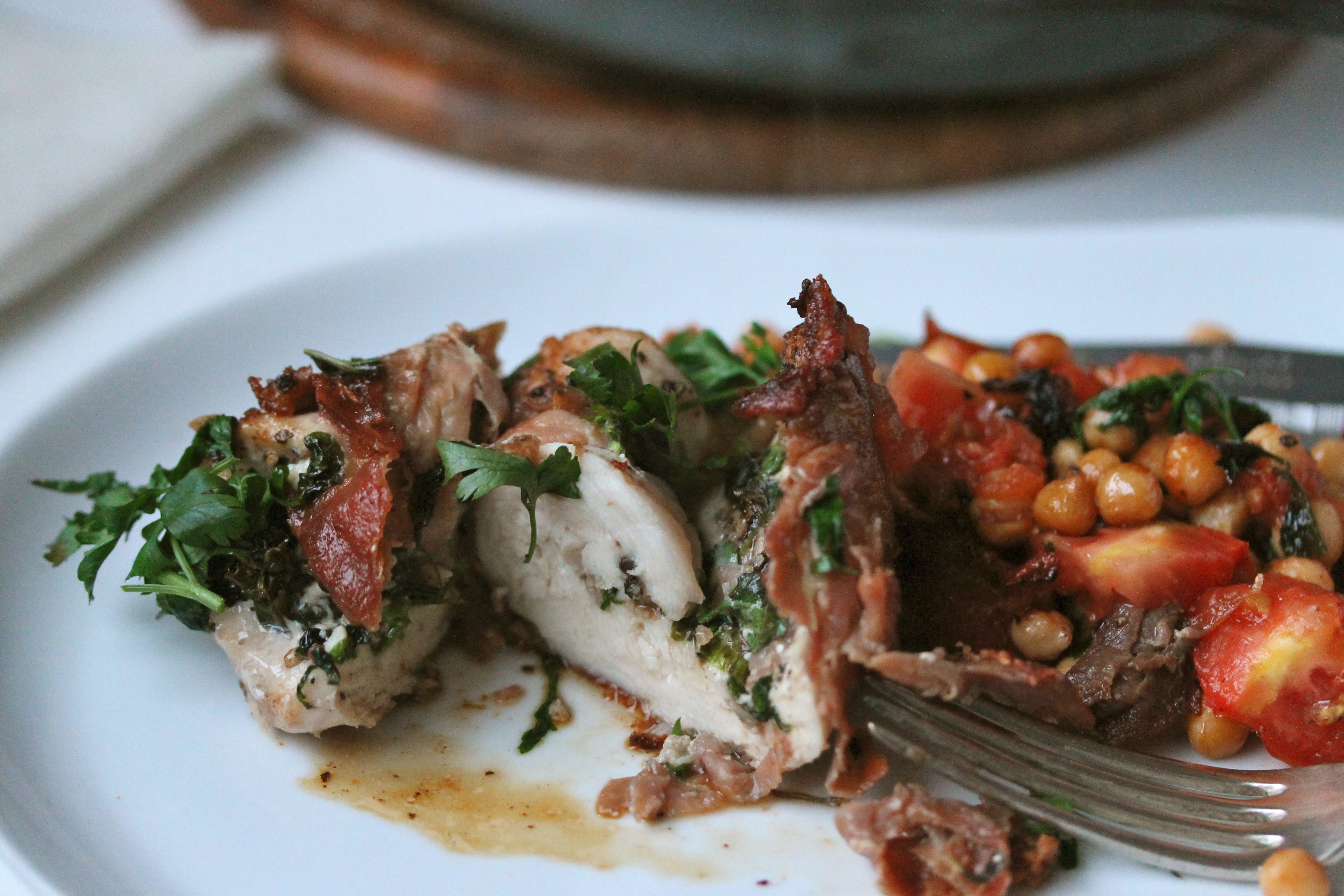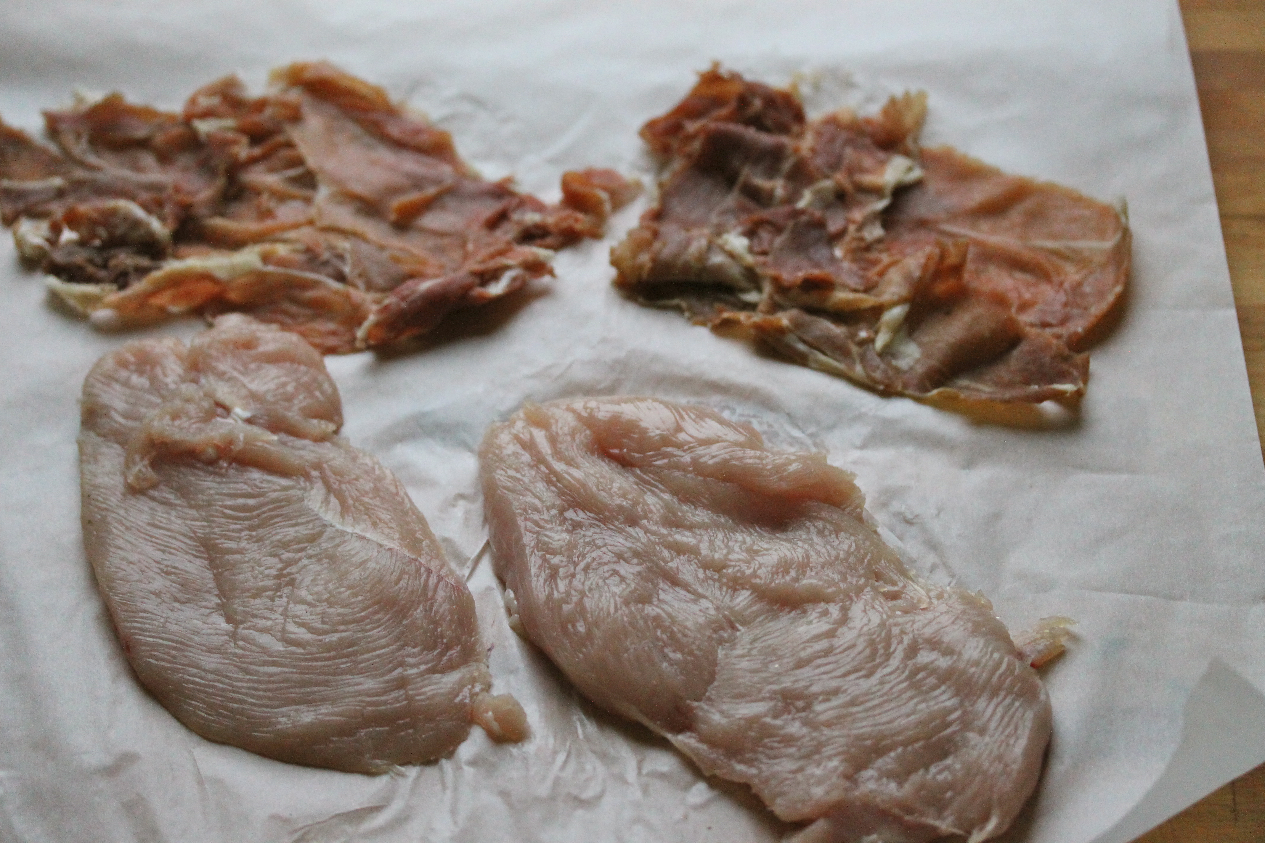 Þegar ég var að gera þetta í vor var ég með hráskinku úr pakka, næfurþunnar og reglulegar sneiðar. Núna átti ég fjórar – eða voru þær sex? – sneiðar af parmaskinku sem ég hafði keypt í kjötborði fyrir nokkrum dögum og sneiðarnar klesstust dálítið saman – sem mér fannst nú ekkert verra því þá var þetta bara þykkari og meiri hráskinka. Ég lagði þær á pappírinn hjá bringunum – þær rifnuðu töluvert þegar ég tók þær úr pappírnum sem þær voru vafðar í en ég lagði þær bara saman aftur í rétthyrninga, álíka stóra og skinkuhelmingarnir voru.
