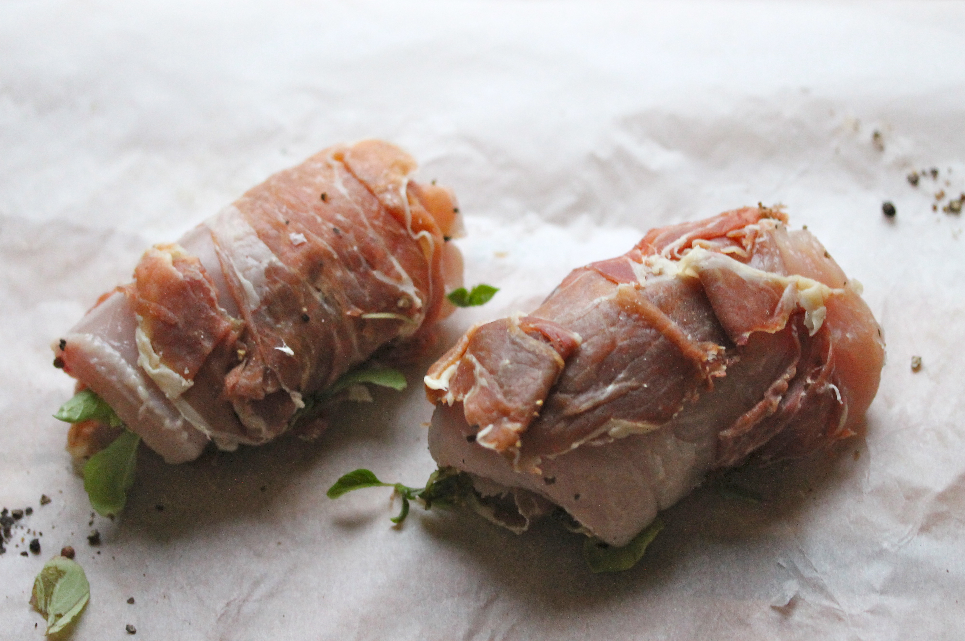 Ég lagði bringuhelmingana ofan á skinkuna og kryddaði með pipar og salti. Í vor þegar ég var að elda þetta var basilíkan í vatnsræktargarðinum mínum í miklum blóma og sum blöðin voru svo stór að mér dugðu tvö eða í mesta lagi þrjú í hverja rúllu. Núna er hún alveg búin að vera og ég tíndi öll smáblöðin sem eftir voru og stráði þeim yfir (og þarf svo að kaupa ný fræ og sá þeim um helgina til að eiga basilíku eftir nokkrar vikur),