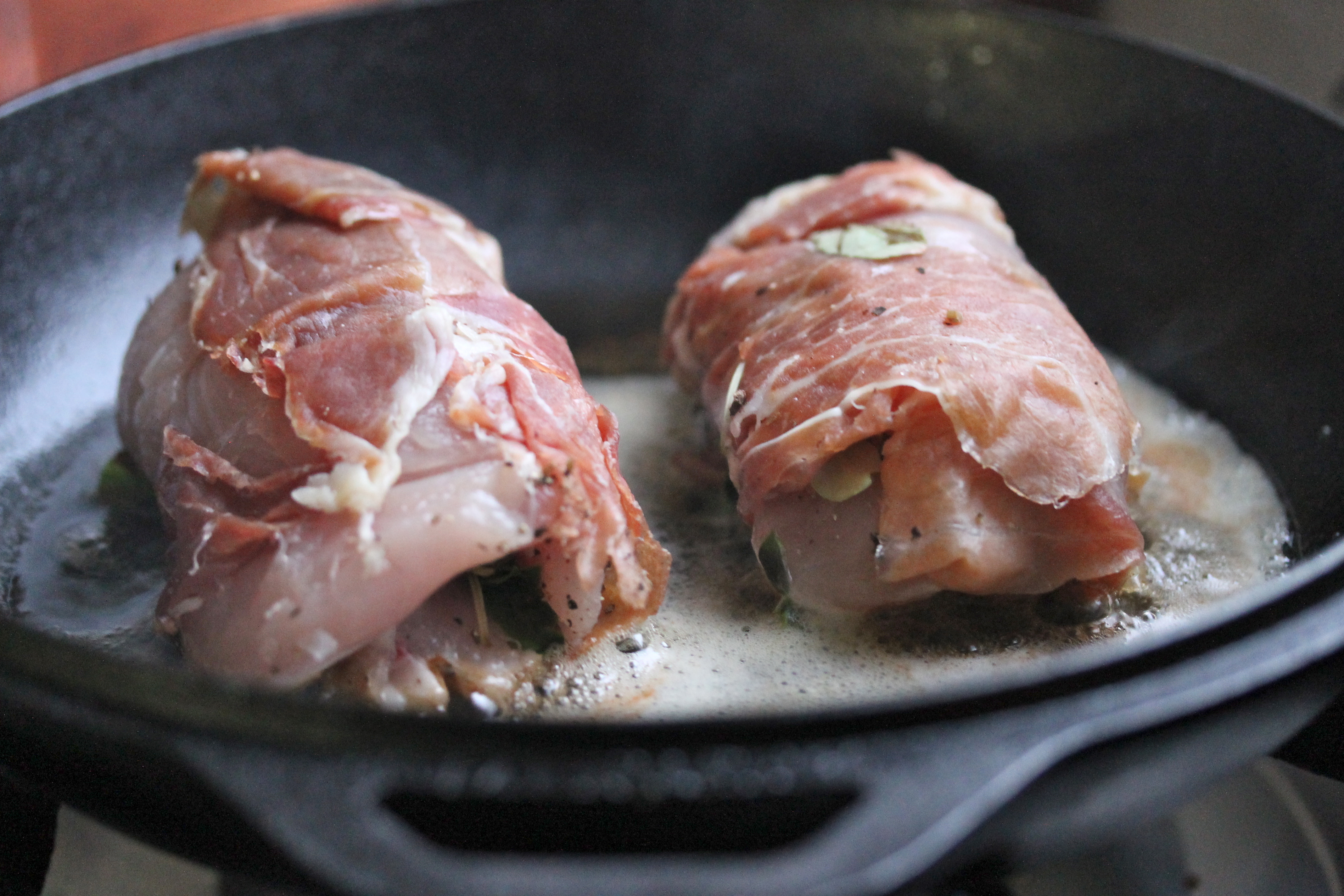 Svo vafði ég bringunum upp í rúllur. Það á ekkert að þurfa að festa þær með tannstöngli eða neinu slíku, skinkan og kjúklingurinn loða alveg saman, en það er best að láta samskeytin snúa niður þegar þær eru settar á pönnuna. – Þessar rúllur urðu töluvert stærri en þær sem eru í bókinni og ekki eins reglulegar, af því að bringurnar voru þykkari og ég notaði meiri skinku.