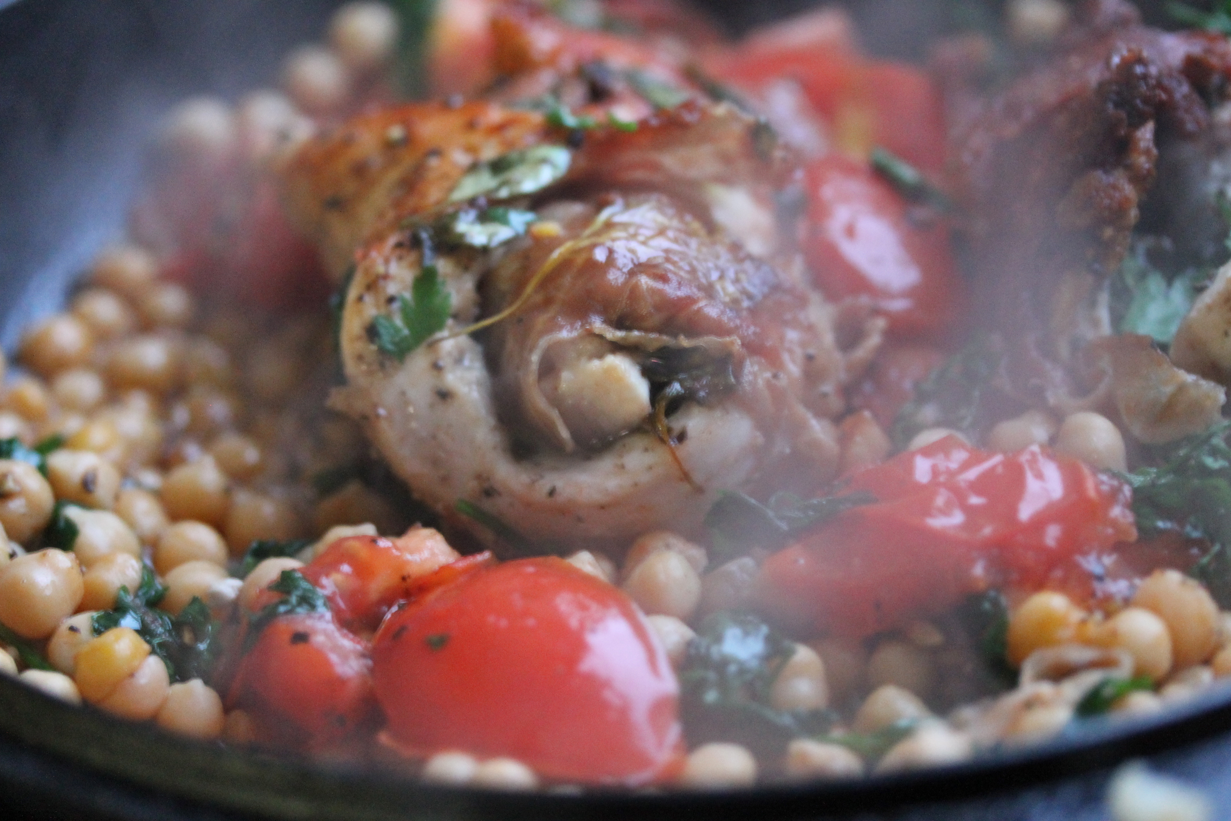 En það rann allt í einu upp fyrir mér að nú var tími fyrir eitthvað vetrarlegra og matarmeira. Það var of seint að fara að sjóða hrisgrjón eða kartöflur eða eitthvað slíkt. En ég skar niður tvo vel þroskaða tómata og opnaði dós af kjúklingabaunum og lét renna af þeim í sigti. Og þegar ég var rétt búin að snúa vefjunum á þriðju hliðina setti ég tómatana á pönnuna, hækkaði hitann aðeins og steikti í 1-2 mínútur og bætti svo við baununum og lófafylli af saxaðri steinselju af því að ég átti hana. Kryddaði með pipar og salti og lét krauma þar til kjúklingurinn var tilbúinn.