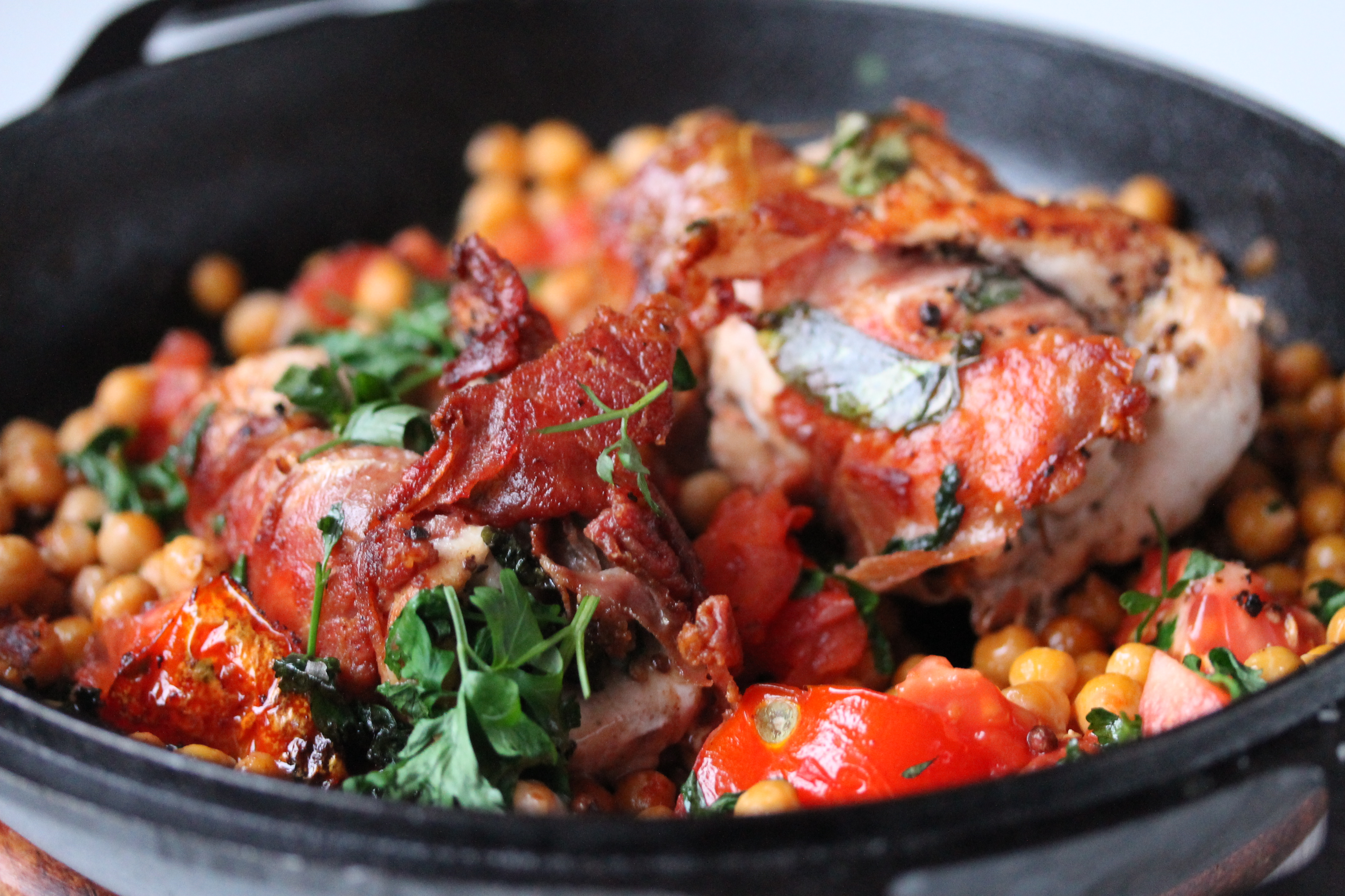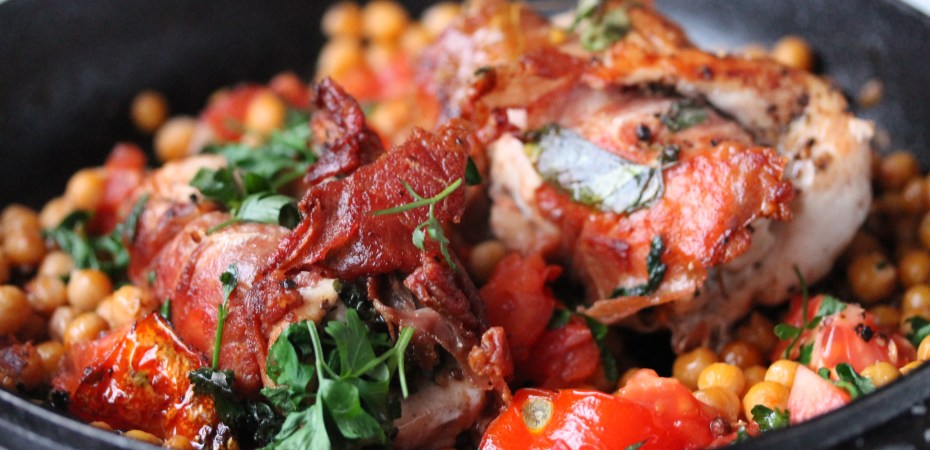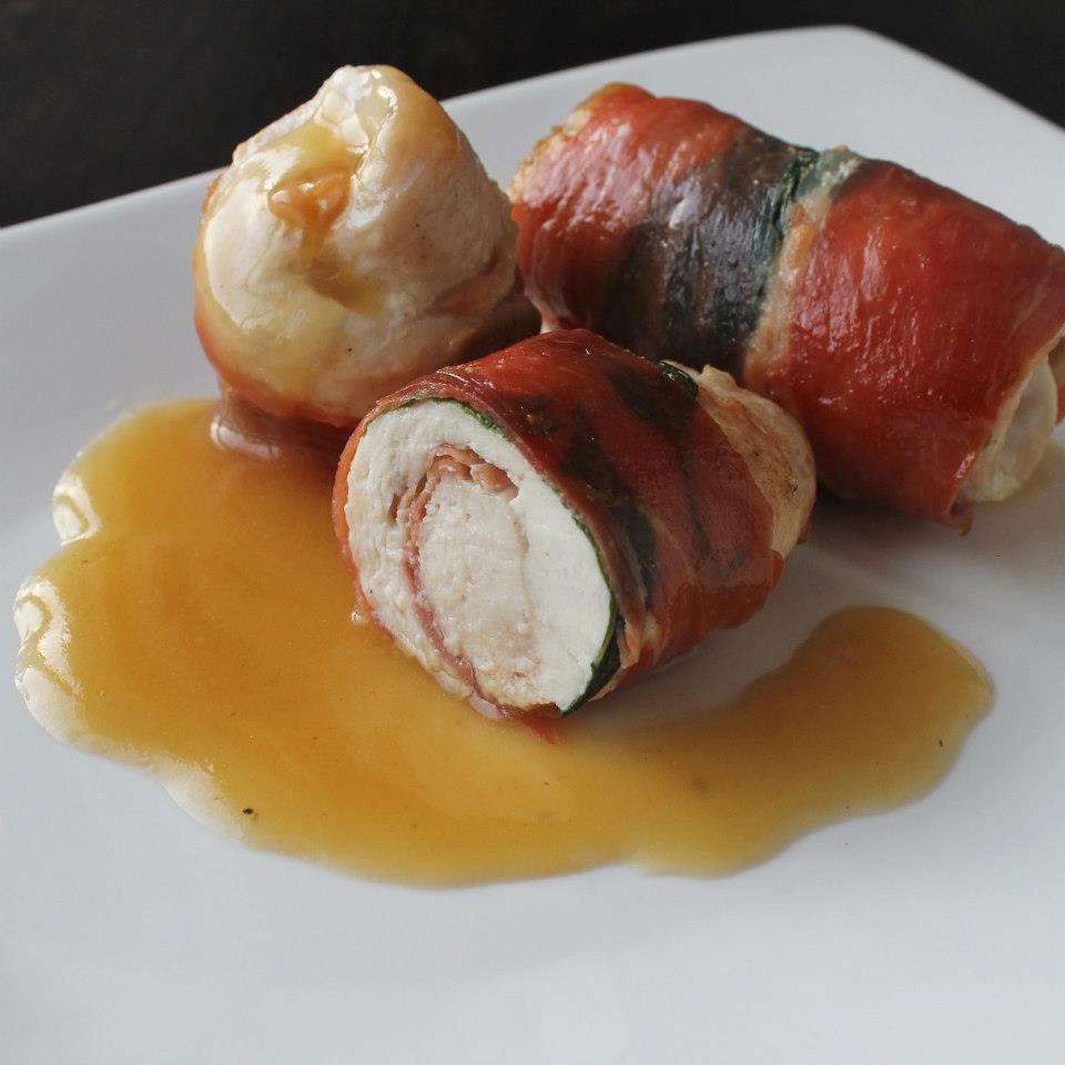 Þessi mynd er reyndar ekki í bókinni, þar er mynd af rúllunum heilum á pönnunni. En þetta var semsagt uppskriftin sem ég ætlaði að fara eftir. Bringurúllur með basilíku og hráskinku í sítrónusósu.