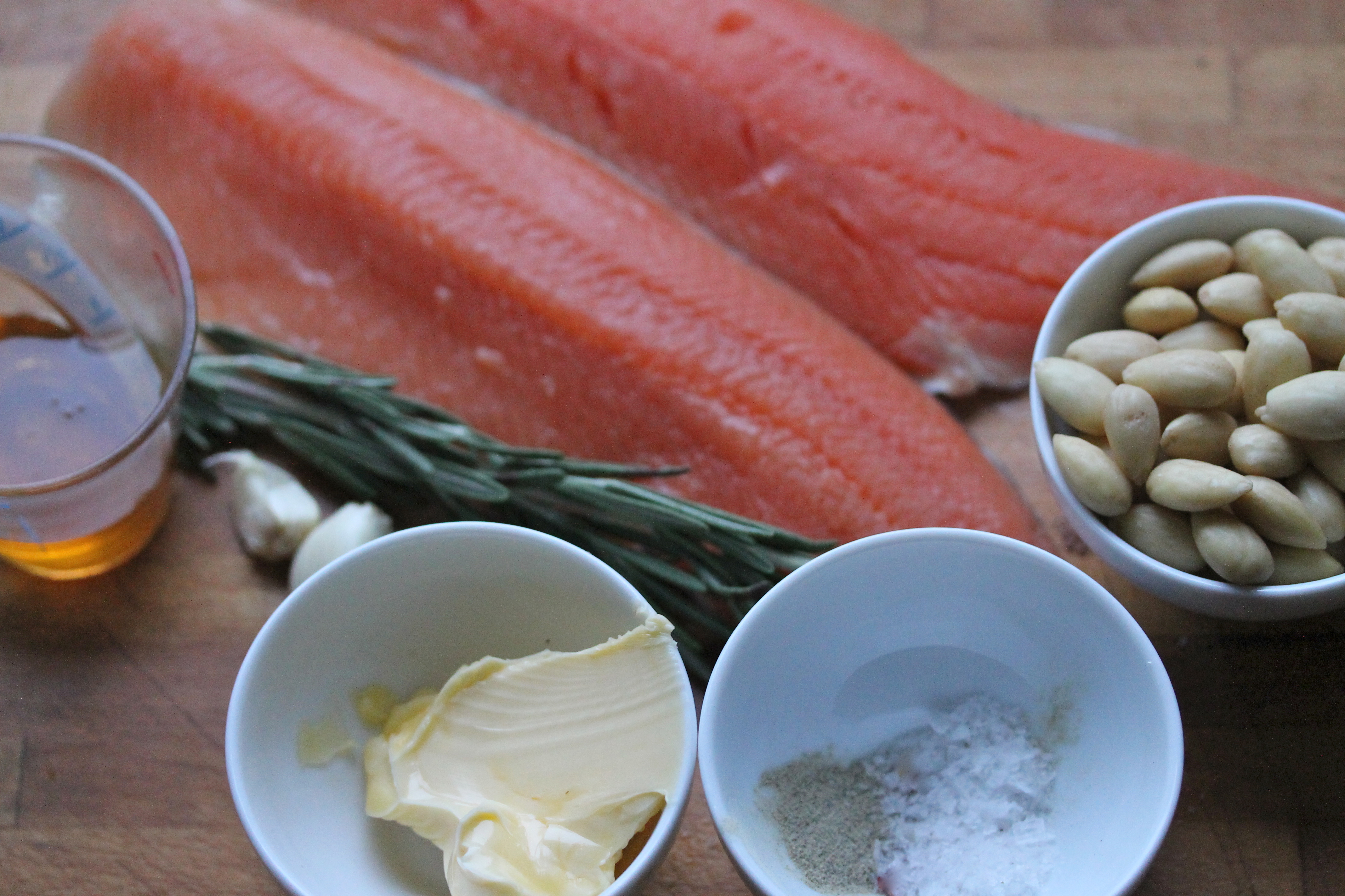Ég byrjaði á að setja upp kartöflur og svo náði ég í bleikjuna – þetta voru tvö flök, um 340 g – 75 g af möndlum og 2 msk af þunnu hunangi. Svo átti ég rósmaríngrein og tvo litla hvítlauksgeira, hvorttveggja gerir nú flesta hluti betri. Ég tók líka til 2 1/2 msk af smjöri, pipar og salt. Ég notaði svo fleira en var semsagt ekki búin að ákveða það þegar myndin var tekin.