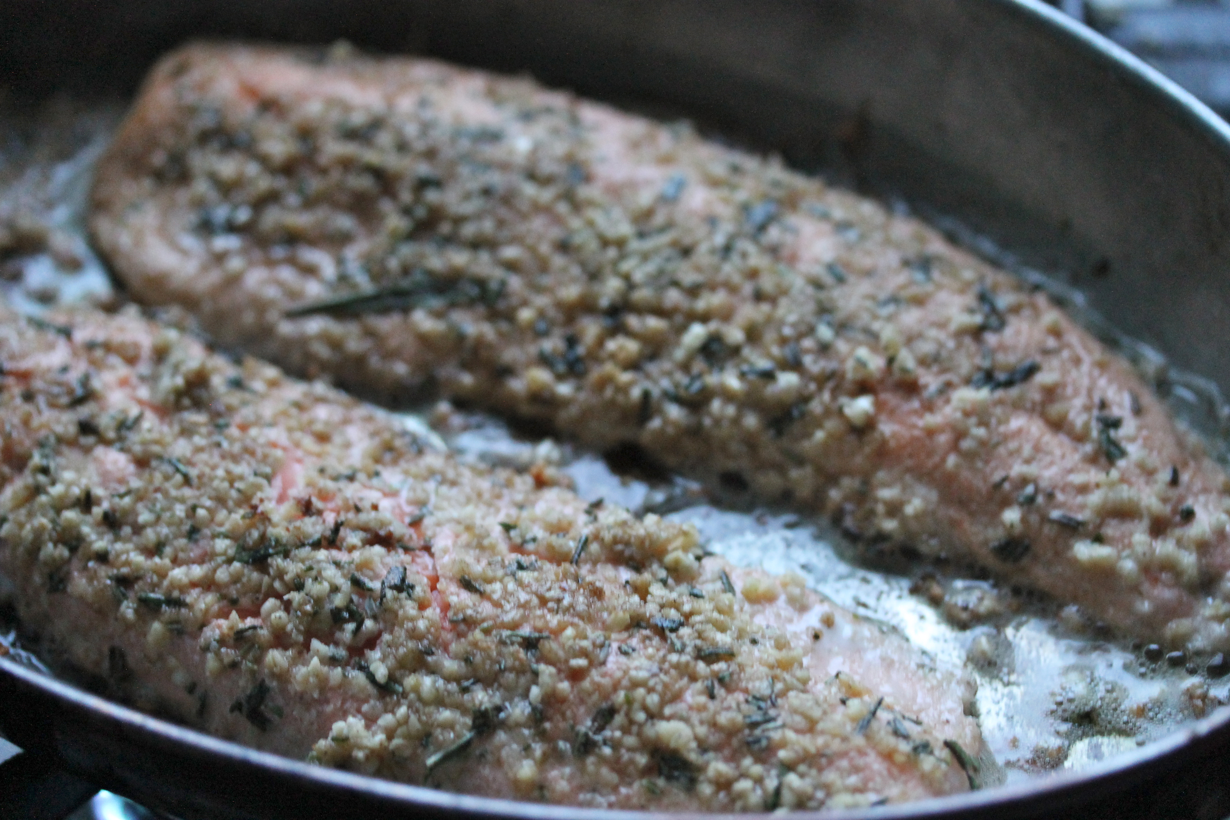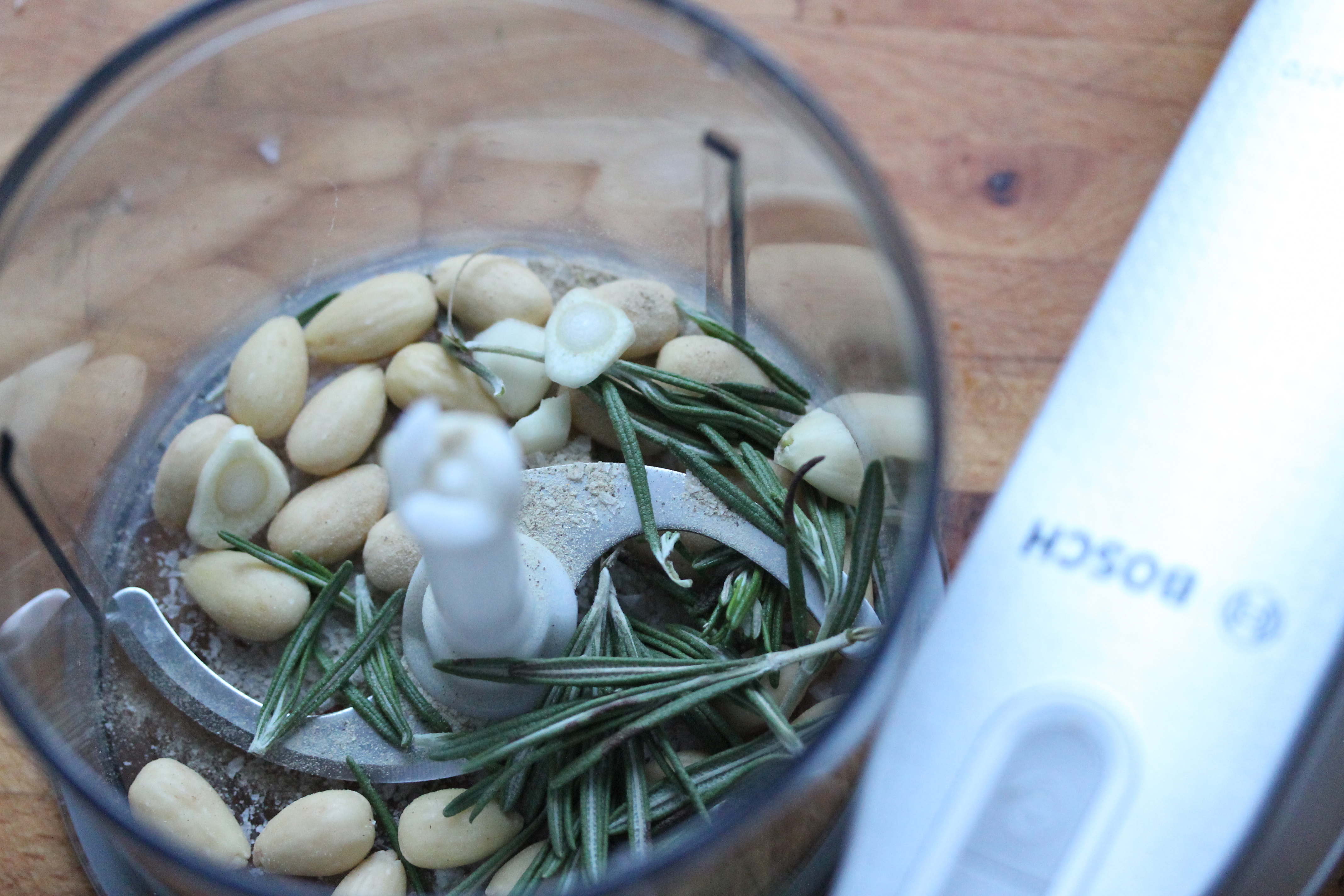 Ég tók míní-matvinnsluvélina (eða hakkarann, veit ekki alveg hvað á að kalla það, en afskaplega hentugt hjálpartæki allavega) og setti þriðjunginn af möndlunum (25 g) í skálina ásamt nálunum af rósmaríngreininni, hvítlauksgeirunum (skornum í bita), pipar og salti. Hakkaði þetta í grófa mylsnu og setti hana svo á disk og velti silungsflökunum upp úr henni og þrýsti henni vel inn í þau (þ.e. fiskhliðinni, það tollir minna við roðhliðina).