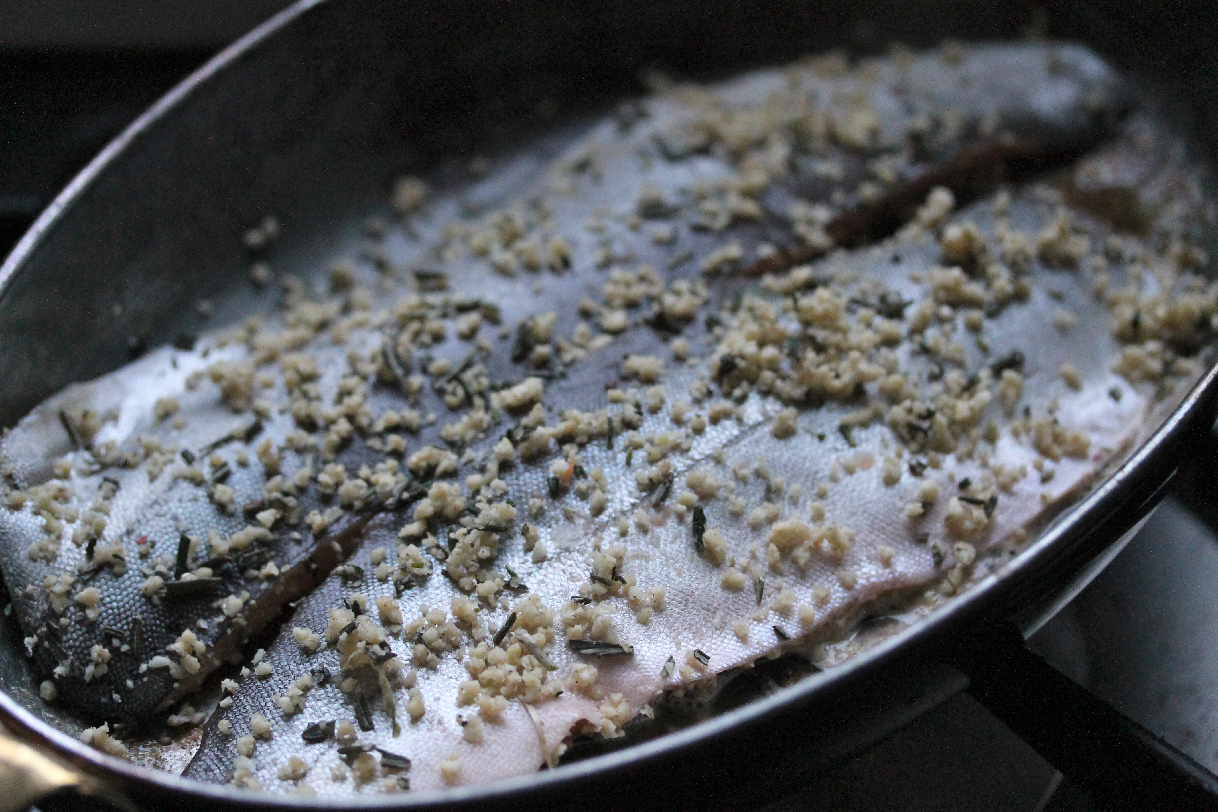 Hinsvegar átti ég tvö bleikjufkök sem ég þurfti að gera eitthvað úr. Og þótt fátt sé í rauninni sumarlegra en silungur með frísklegu salati eða einhverju slíku, þá getur hann verið býsna vel viðeigandi á veturna líka.