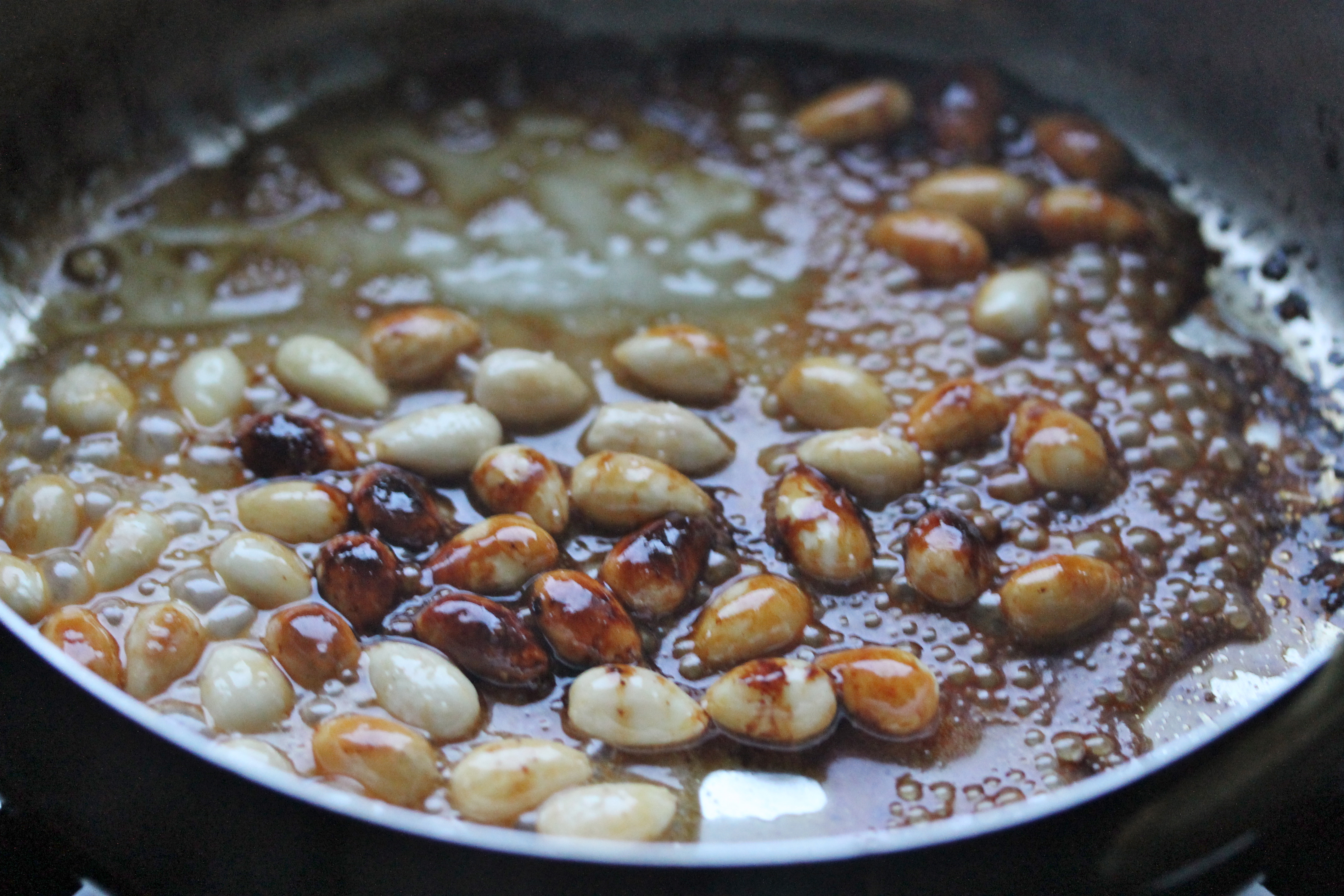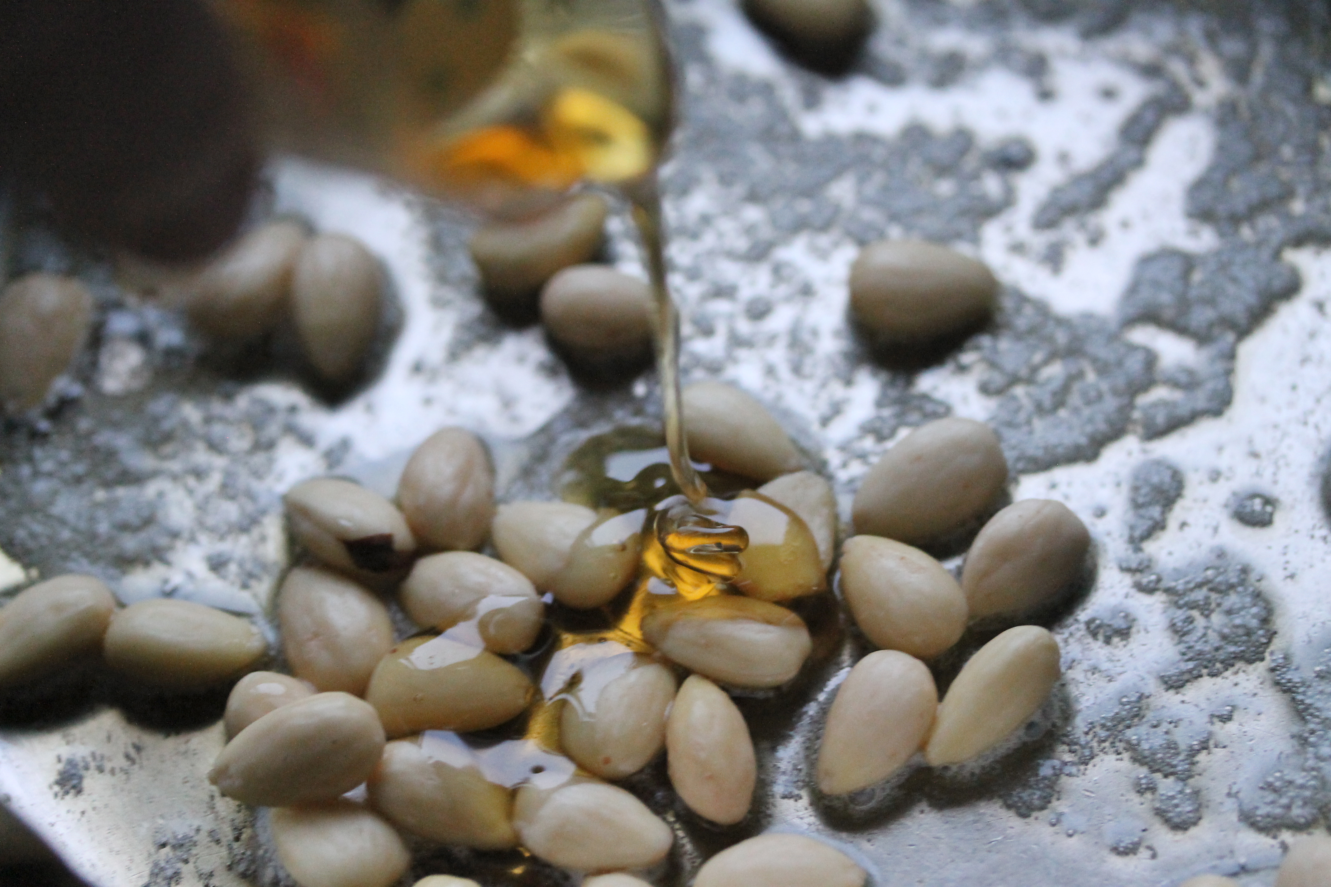 Á meðan bræddi ég afganginn af smjörinu á lítilli pönnu, setti afganginn af möndlunum (50 g) á hana og steikti þær í 2-3 mínútur. Þá hellti ég hunanginu yfir og hrærði vel.