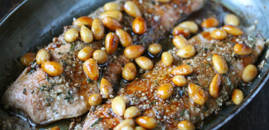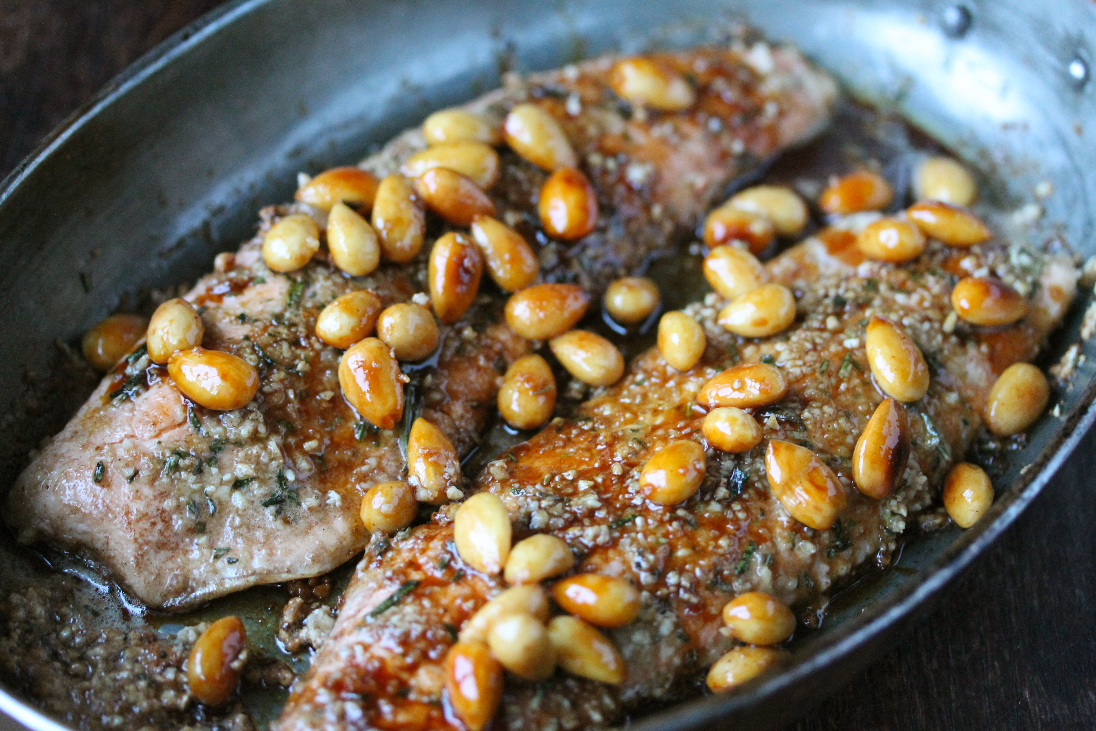 Ég hellti möndlunum og sósunni yfir bleikjuflökin og bar þau fram á pönnunni. – Þetta er nú svolítið hlýlegt, er það ekki? og passar vel á köldum vetrardegi.