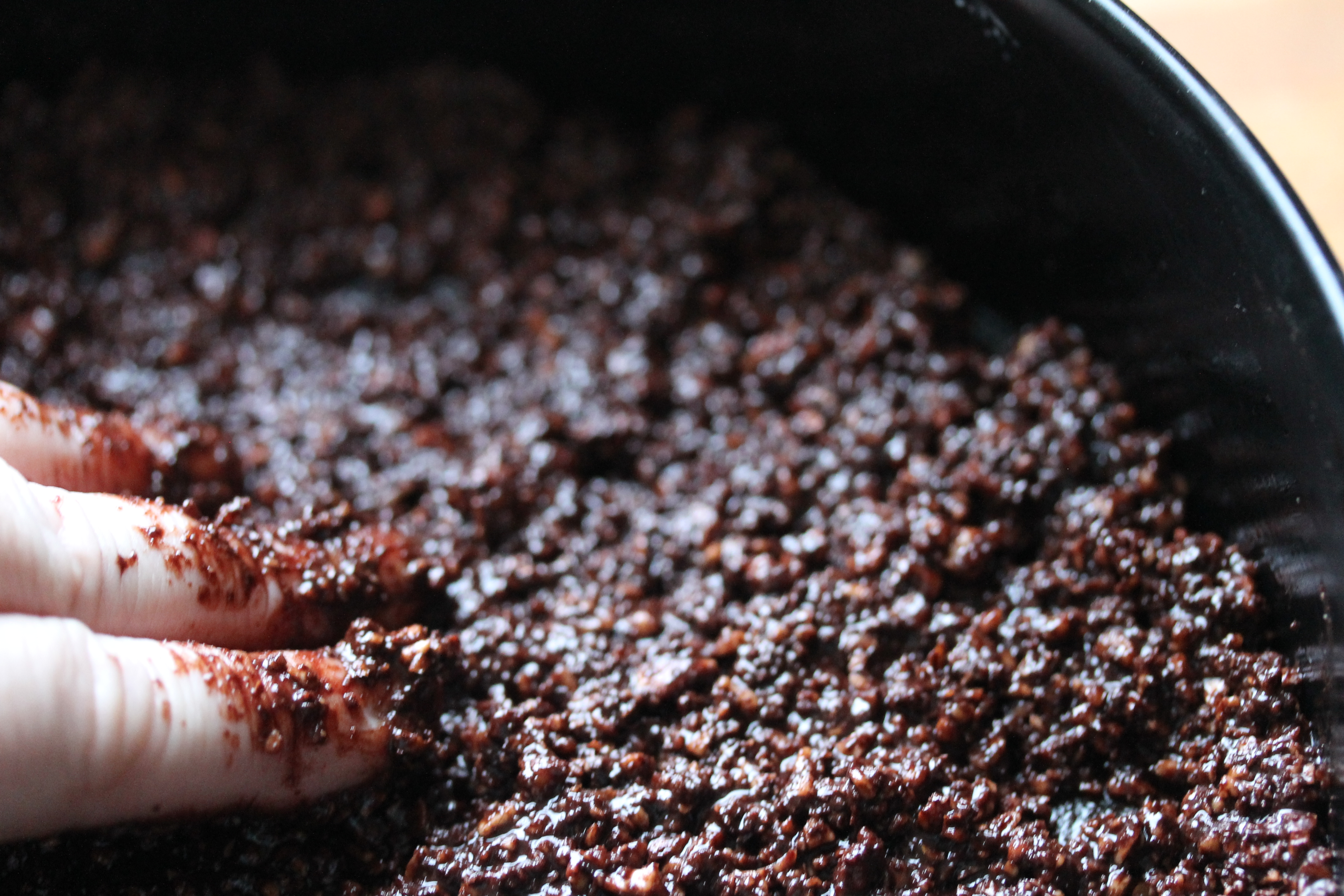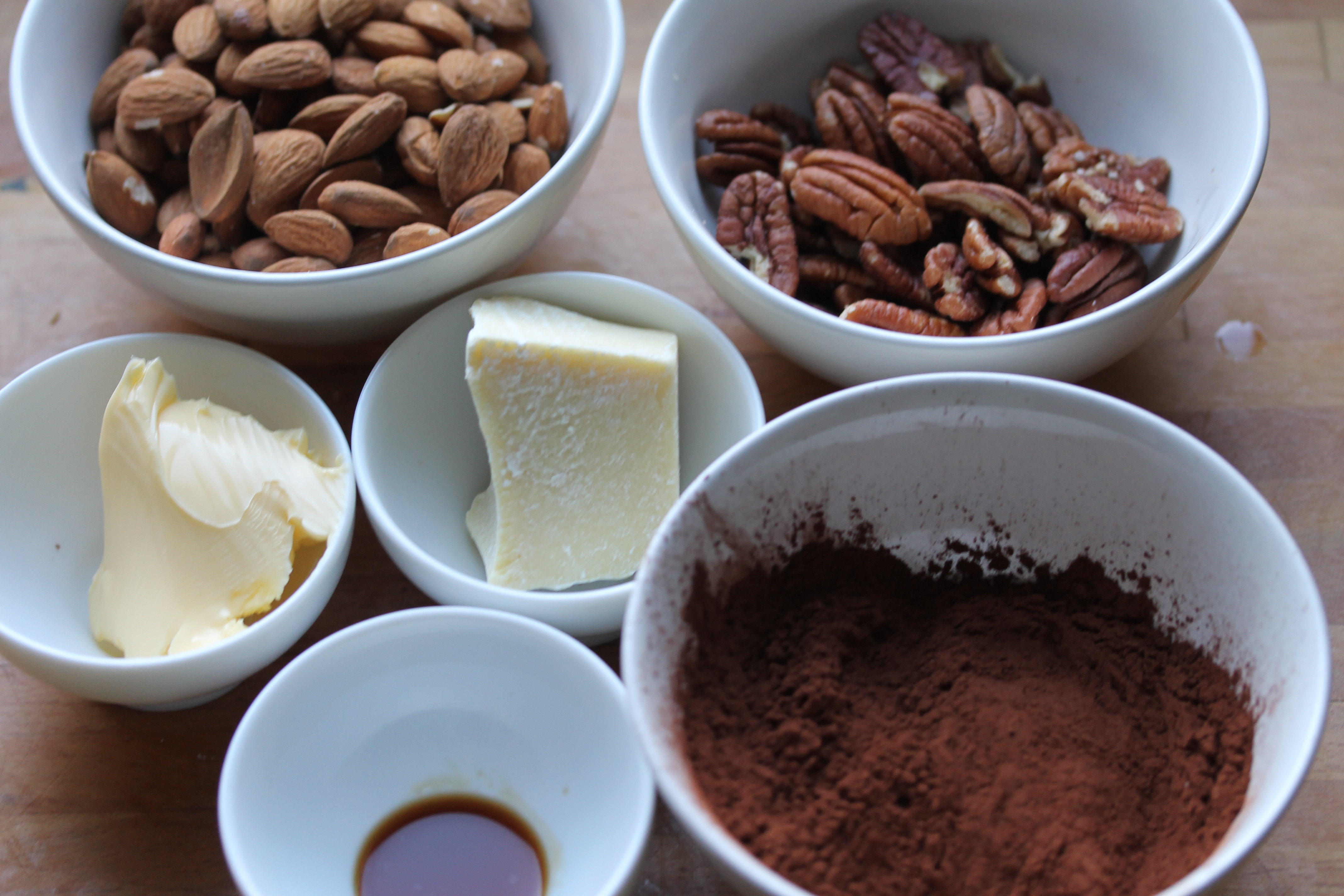 Fyrst gerði ég botninn og notaði í hann 75 g af pekanhnetum og 150 g af möndlum (með eða án hýðis, skiptir ekki máli). En það mætti í sjálfu sér vera ýmiss konar tegundir og samsetningar af hnetum og möndlum. 40 g af kakódufti, 30 g af smjöri og 50 g af kakósmjöri af því að ég átti það til, en það má alveg eins nota palmín eða kókosolíu, og 1/2 tsk af vanilluessens.