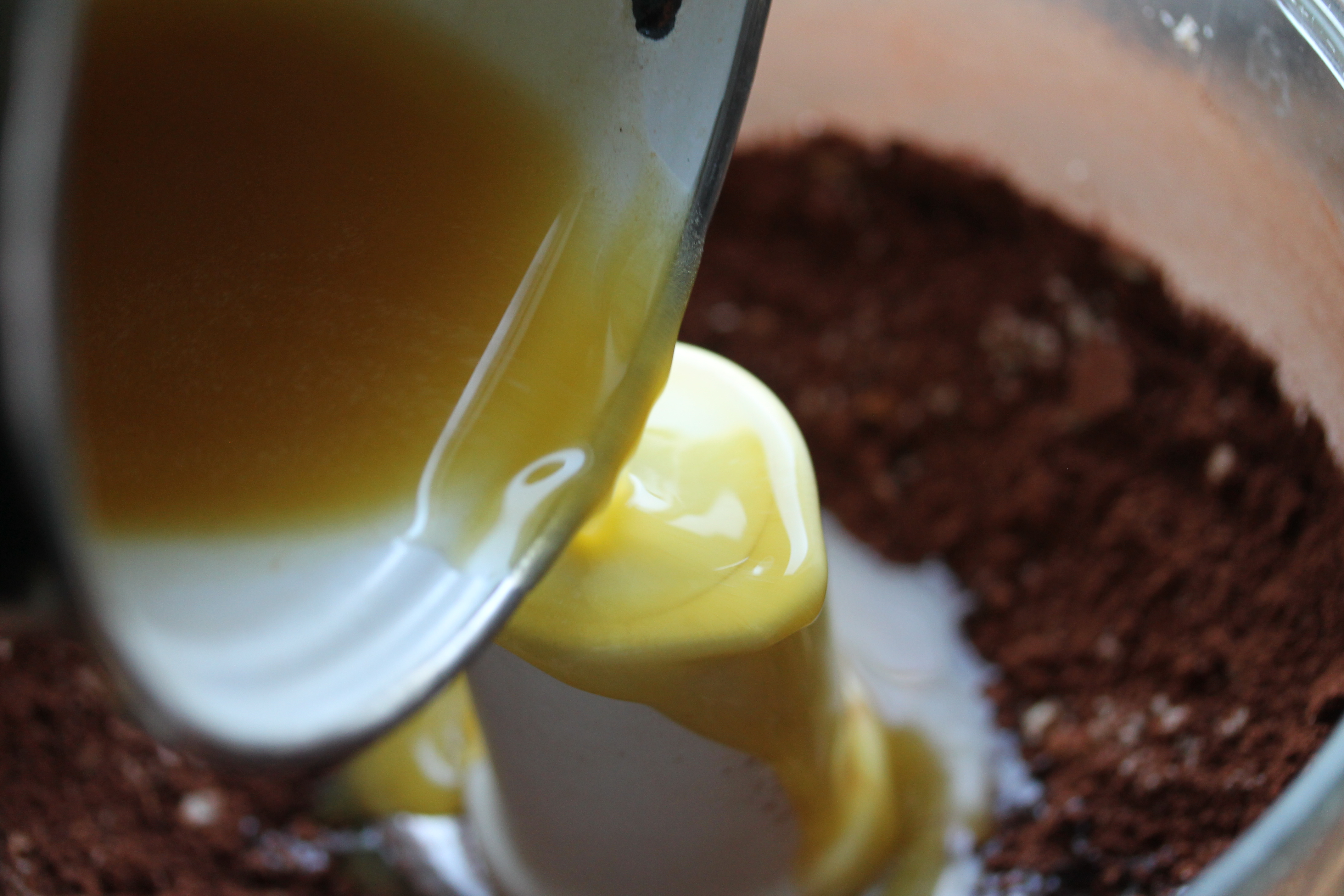 Á meðan bræddi ég kakósmjör og smjör saman í potti við vægan hita, tók það um leið og það var bráðið, hrærðin vanillunni saman við og hellti þessu svo yfir hnetublönduna og hrærði saman í vélinni.