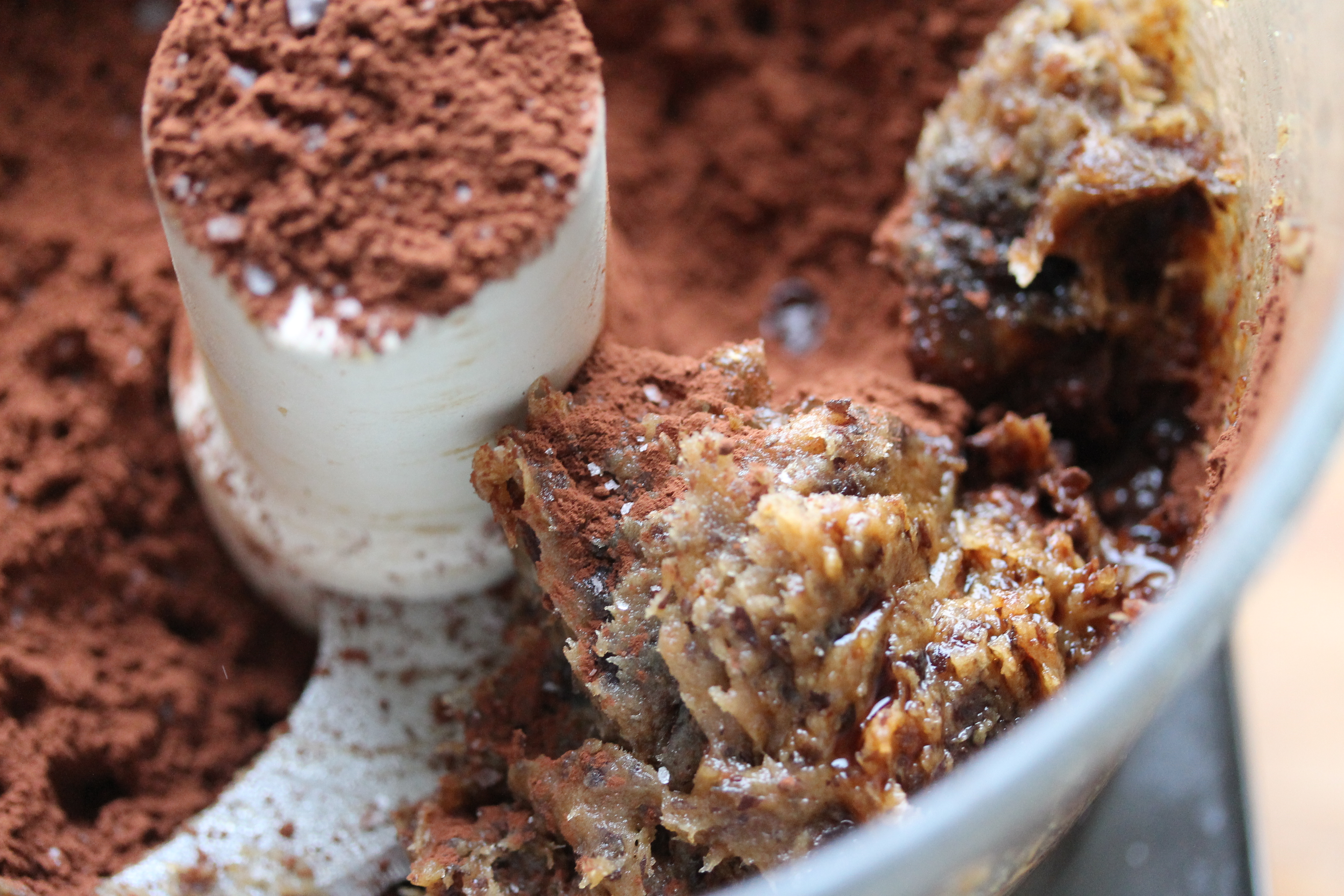 Ég setti möndlurnar og pekanhneturnar í matvinnsluvélina og malaði þær, ekki neitt rosalega fínt. Svo setti ég kakóduftið út í og þeytti því saman við.