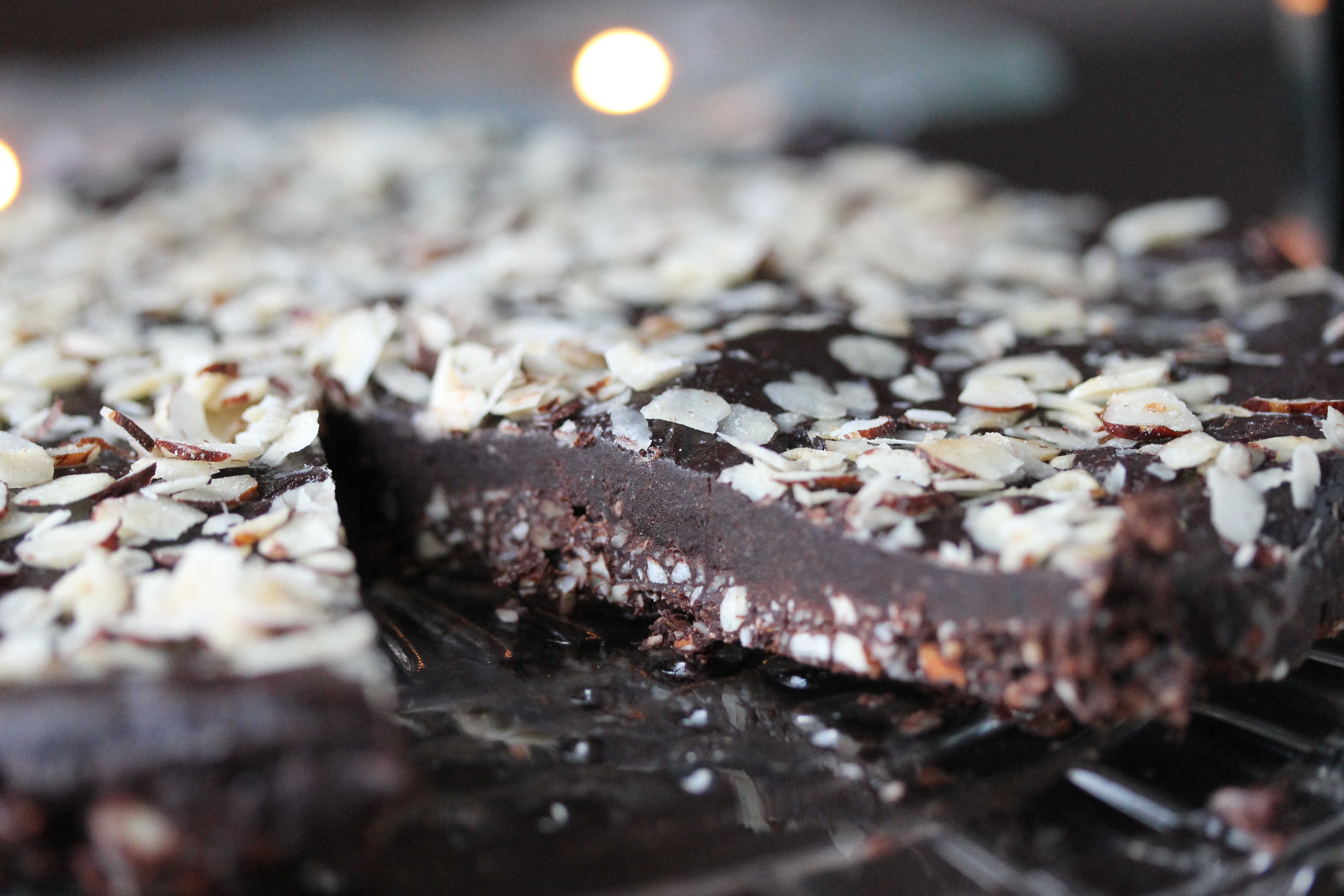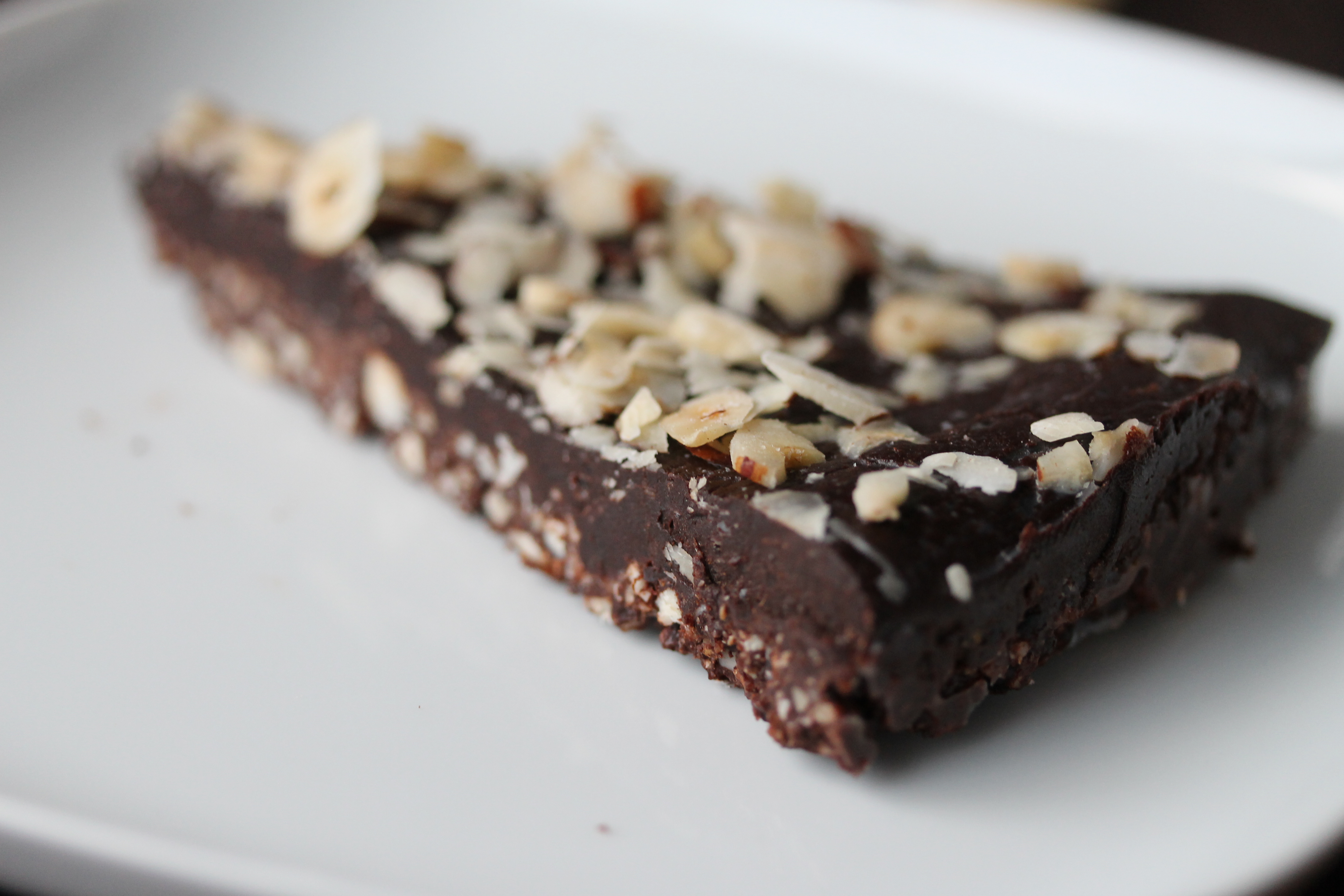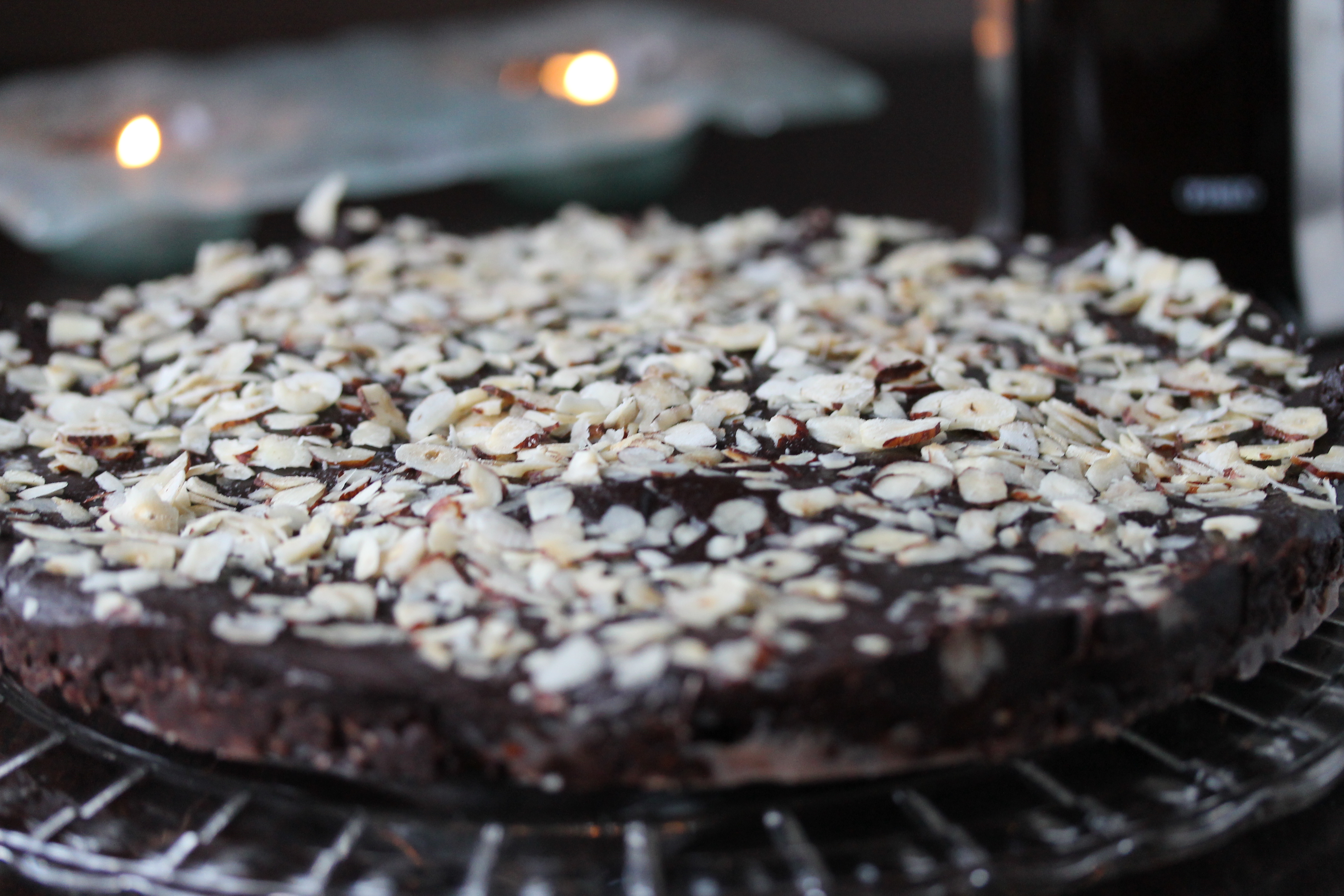 Ég stráði svona 2 msk af heslihnetuflögum (má líka nota t.d. möndluflögur) yfir og kældi svo kökuna vel í ísskáp – það má líka stinga henni smástund í frysti ef maður er að flýta sér.