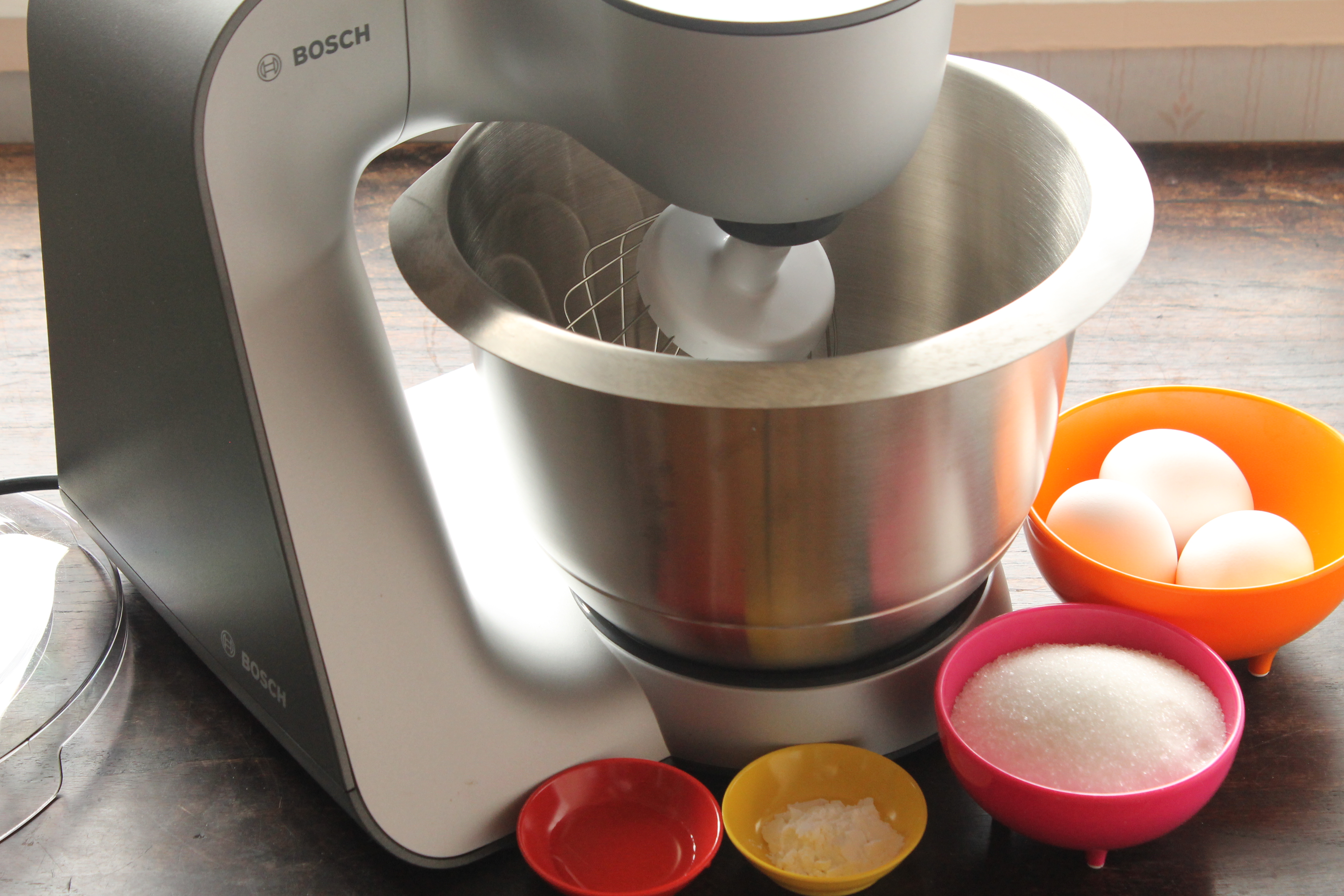 Ég aðskildi eggin og gætti þess vel að ekki færi minnsta arða af rauðu með hvítunum. Setti þær í hrærivélarskálina og byrjaði að þeyta. Ekki setja sykur út í strax í upphafi, það gæti tvöfaldað þann tíma sem þarf til þeytingarinnar.