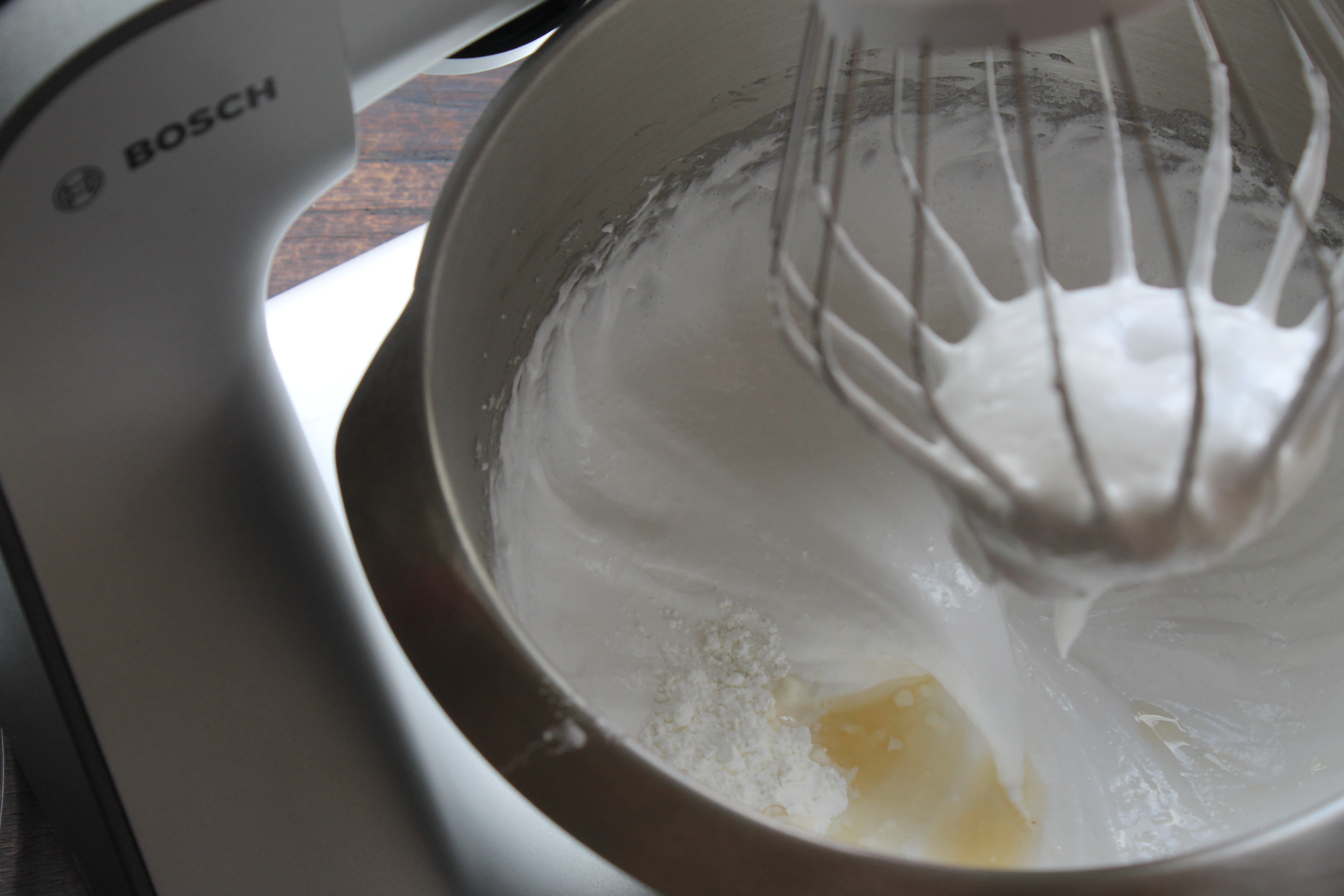 Ég þeytti hvíturnar þar til komin var hvít froða sem myndaði mjúka toppa – það gæti hafa tekið svona mínútu (en það er misjafnt eftir hrærivélum reyndar, gamla Kenwoodvélin mín er vinnuhestur en hún var ívið lengur að þeyta hvíturnar).