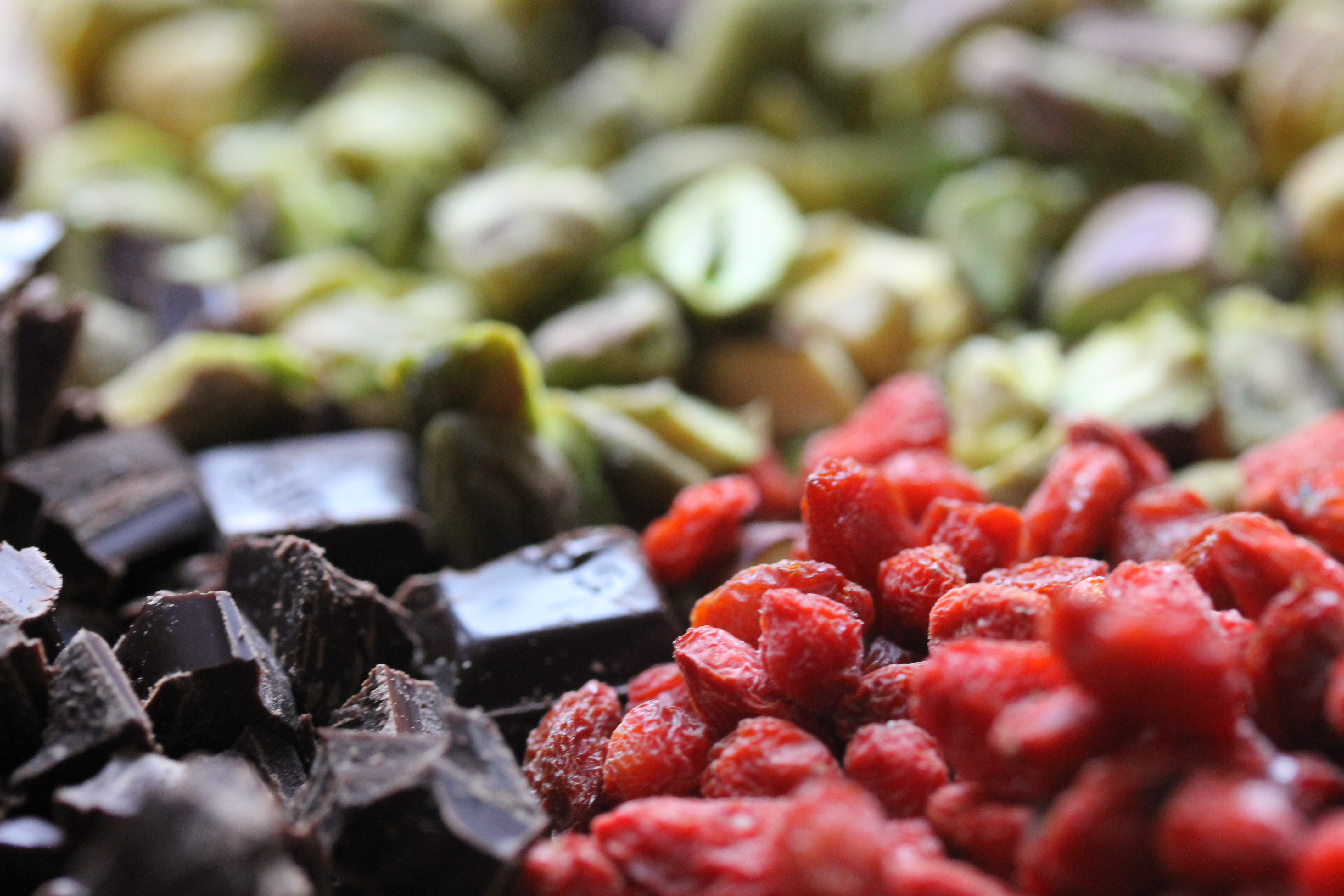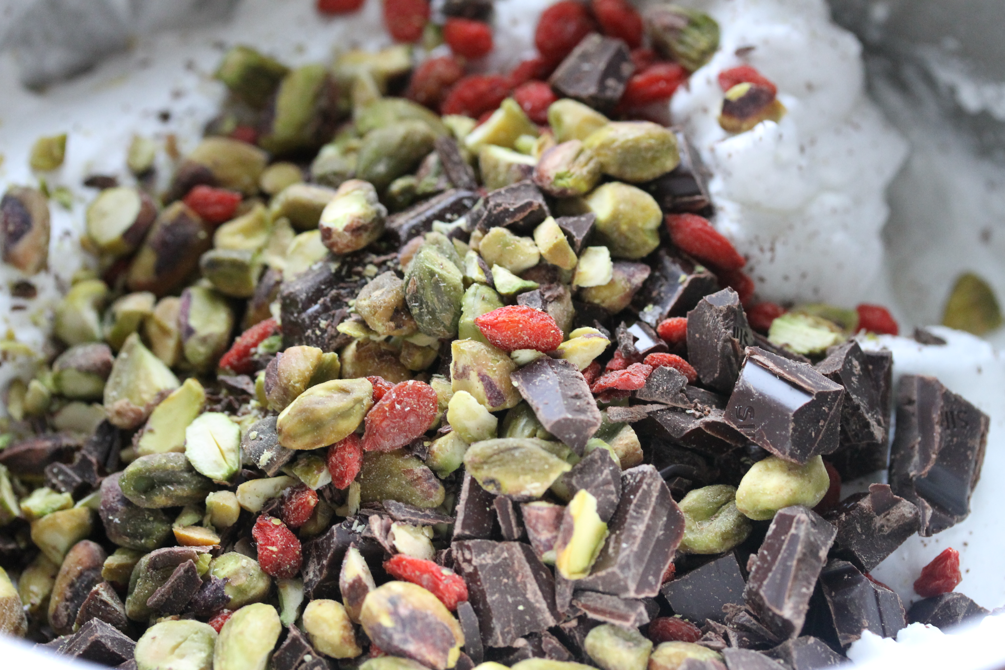 Ef þetta hefðu verið plein pavlovur hefði ég látið staðar numið hér, sett marensinn á plötu og í ofninn, en ég er litaglöð manneskja og hafði ákveðið að gera pavlovur í lit. Svo að ég tók til 70 g af pistasíuhnetum, 75 g af dökku súkkulaði og 35 g af gojiberjum (en það má sleppa þeim og láta hnetur og súkkulaði duga). Ég grófsaxaði hneturnar og súkkulaðið.