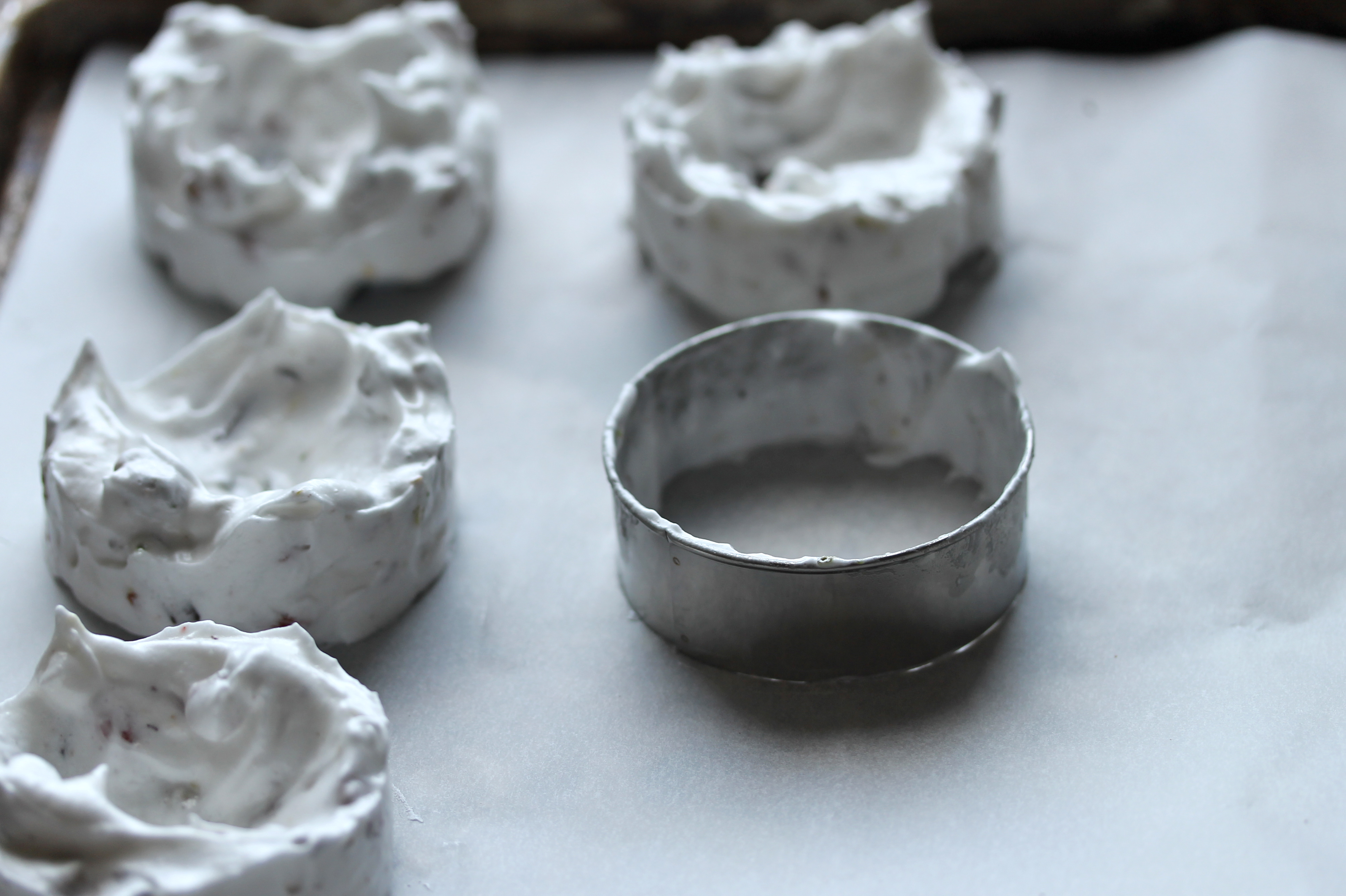 Ég setti svo bökunarpappír á plötu og gerði 12 marenskökur. Það má teikna hringi á pappírinn með blýanti og smyrja marensinum á þá en af því að ég vildi reglulega lagaðar og flottar litlar pavlovur notaði ég hring úr málmi sem er sirkabát 7 cm í þvermál – sama hringinn hvað eftir annað, maður þarf ekki tólf hringi – jafnaði marensinum í hann, gerði dálitla laut í miðjuna og lyfti svo hringnum og gerði næstu köku.