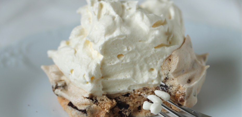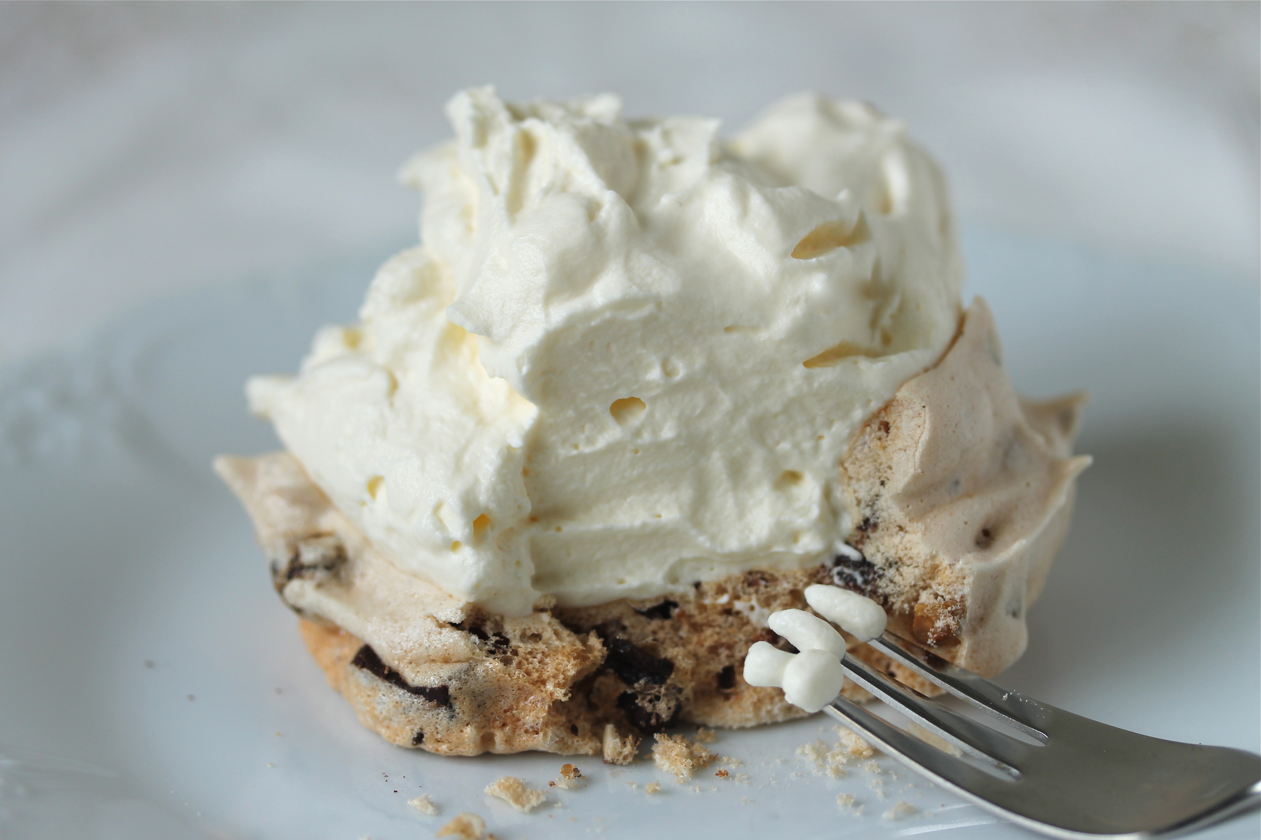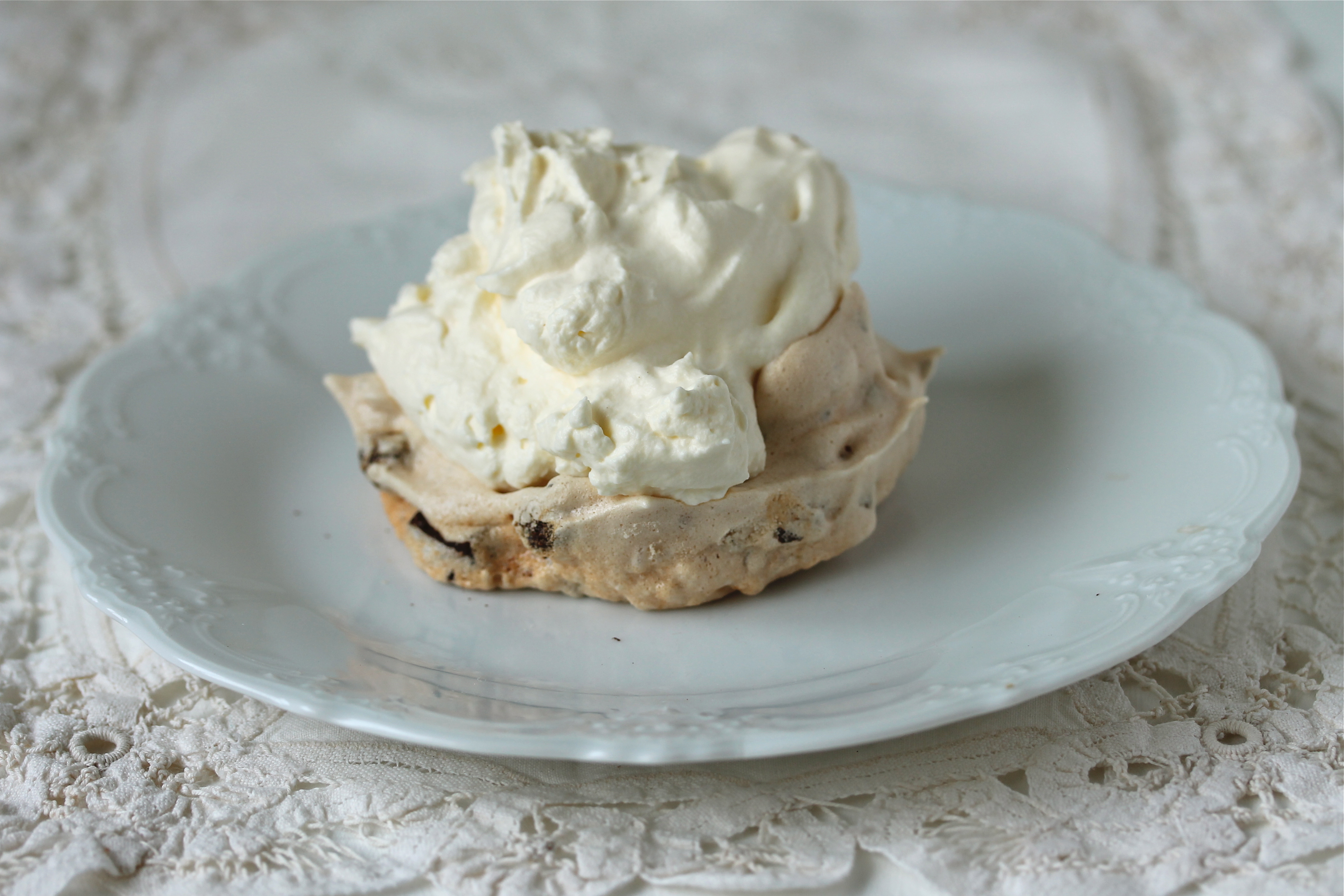 Ég notaði 3 eggjahvítur, 150 g sykur, 2 tsk af maíssterkju (maizenamjöli) og 1 tsk af hvítvíns- eða eplaediki. Hvíturnar þeytast best ef þær eru við stofuhita svo að það er best að taka eggin úr ísskápnum 20-30 mínútum áður en á að nota þau (ef liggur á má setja þau í skál með ylvolgu vatni í nokkrar mínútur til að flýta fyrir). Aldur eggjanna skiptir líka máli, eldri egg þeytast betur en nýorpin.