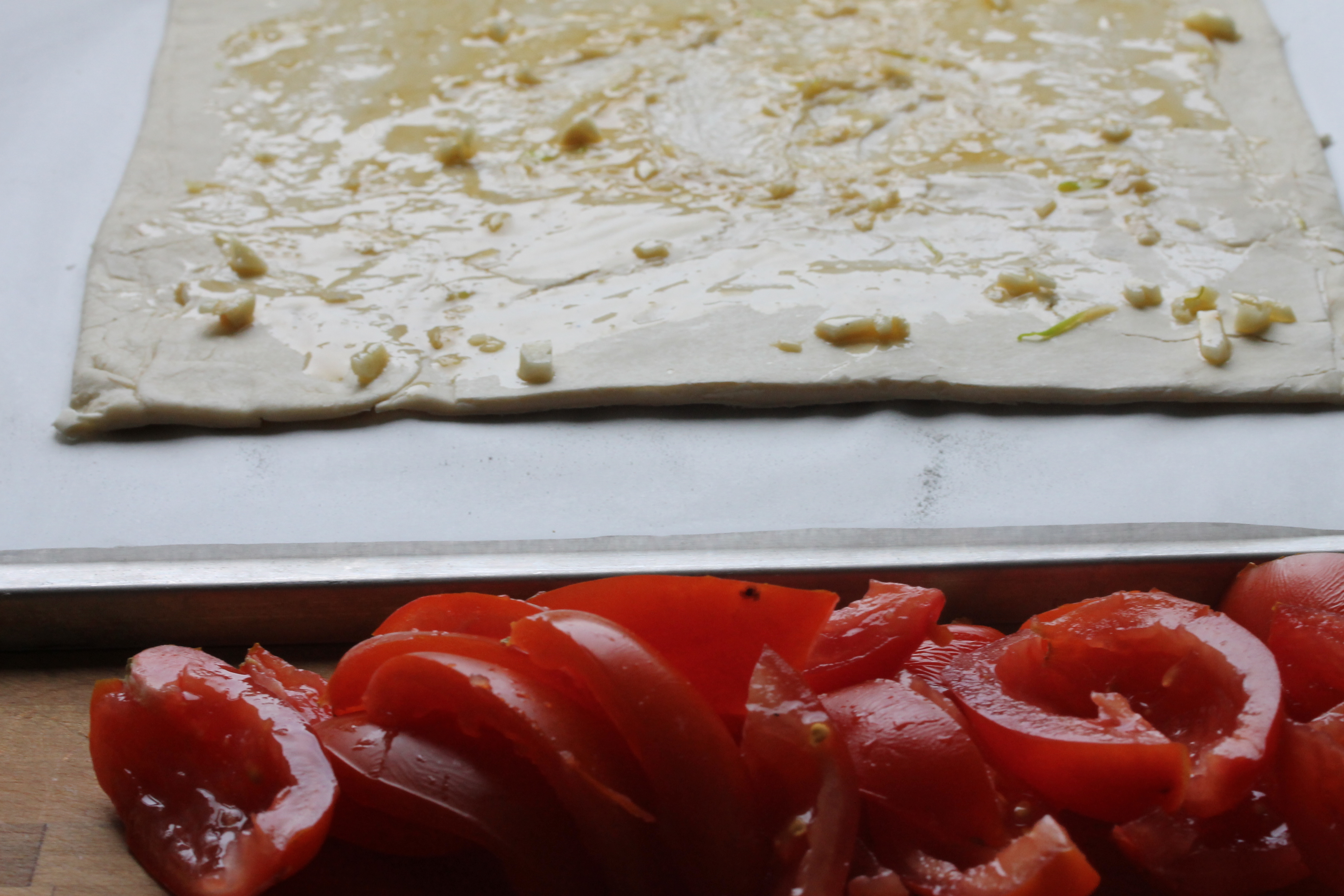 Ég tók svo smjördeigsplöturnar, sem voru þiðnaðar, lagði þær á hveitistráð borð þannig að þær sköruðust aðeins, þrýsti brúnunum saman með fingurgómunum og flatti deigið út í ferhyrning, um 25×25 cm. Snyrti brúnirnar með beittum hníf og setti deigið á pappírsklædda bökunarplötu. Penslaði það með hvítlaukssmjörinu, ekki alveg út á brúnir.
