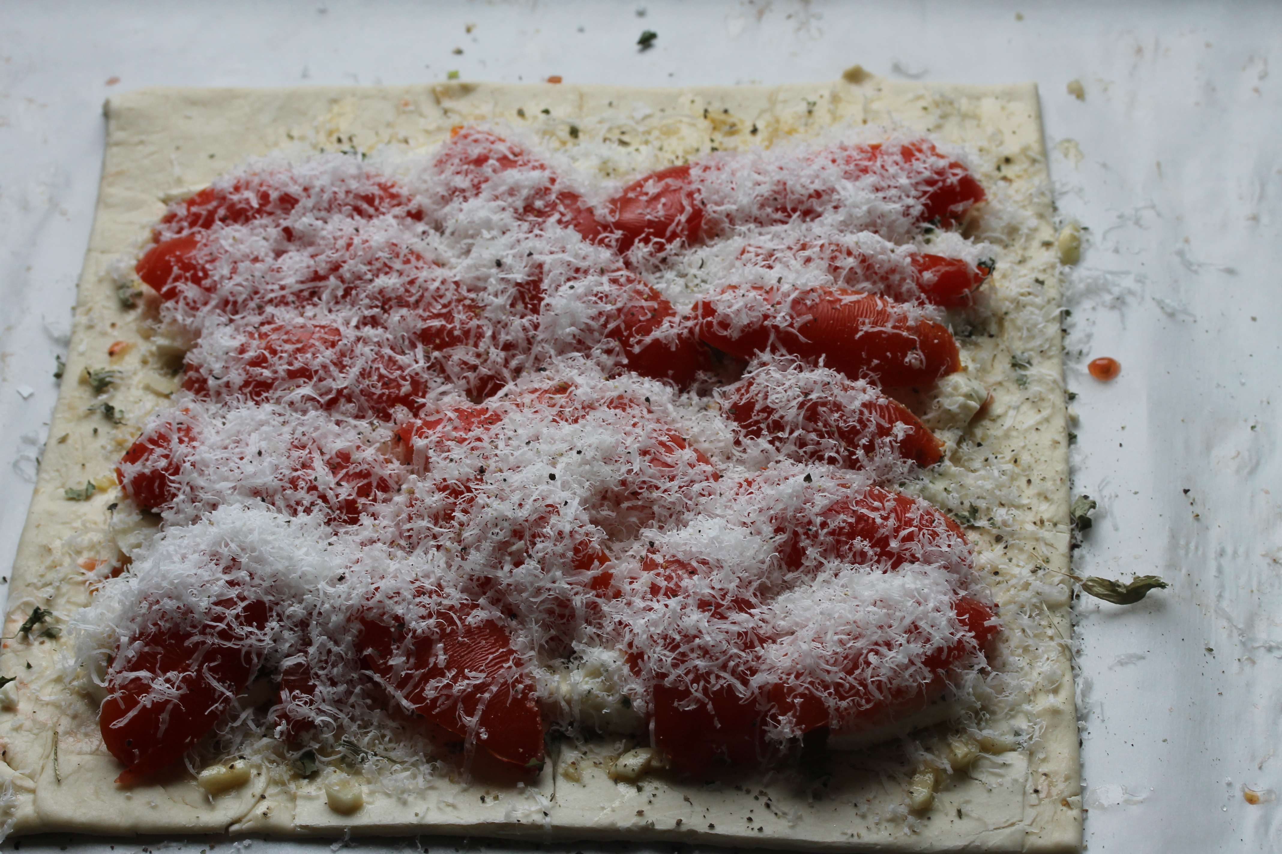Ég skar svo tómathelmingana í báta og raðaði þeim ofan á. Stráði meiri parmesanosti yfir og malaði svartan pipar yfir allt saman. Setti bökuna í miðjan ofninn og bakaði í um 30 mínútur.