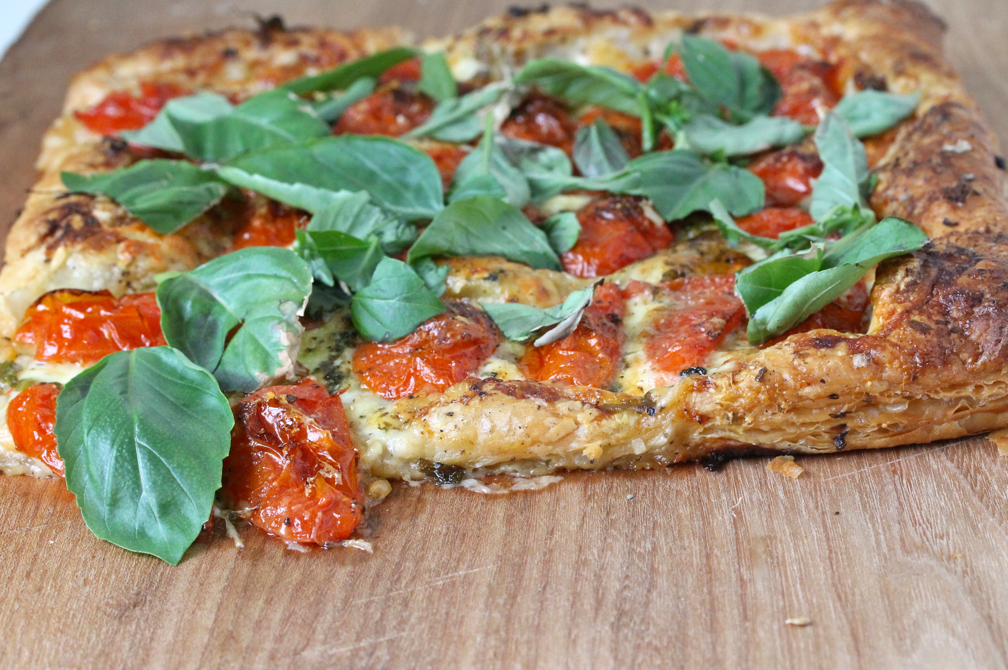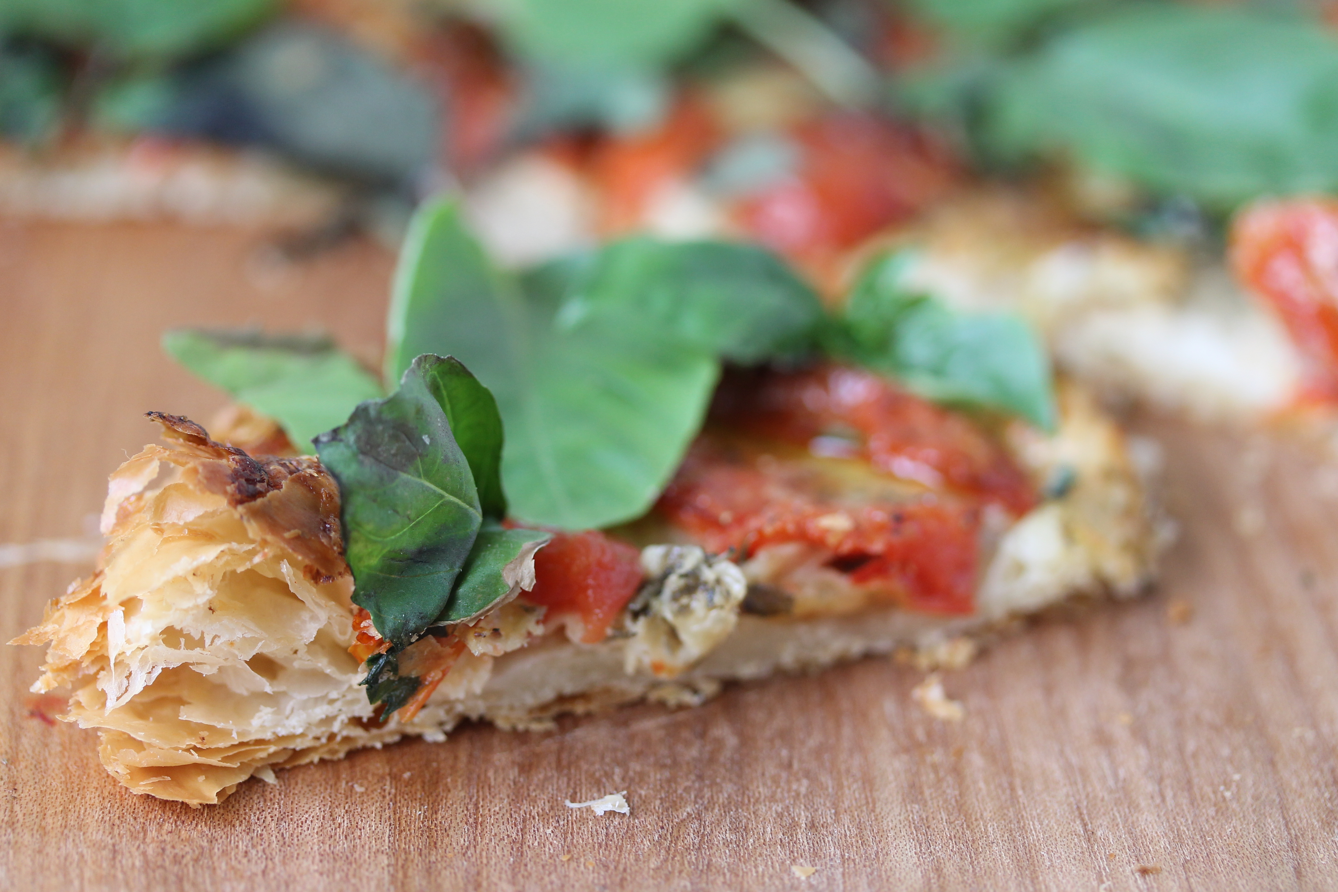En á meðan ég bíð set ég hér uppskrift að – nja, ekki pítsu, frekar böku. Ég var reyndar ekki að gera hana núna, þetta er síðan í haust og kannski er hún ekki nógu vetrarleg en það er nú ágætt að láta tómata og basilíku minna sig á sumarið … Svo er þetta frekar fljótlegt og einfalt því ég notaði bara frosið smjördeig í botninn. Þetta gæti alveg verið máltíð með salati eða súpu en ég hef reyndar líka haft svona böku sem meðlæti, til dæmis með ýmsu kjöti.