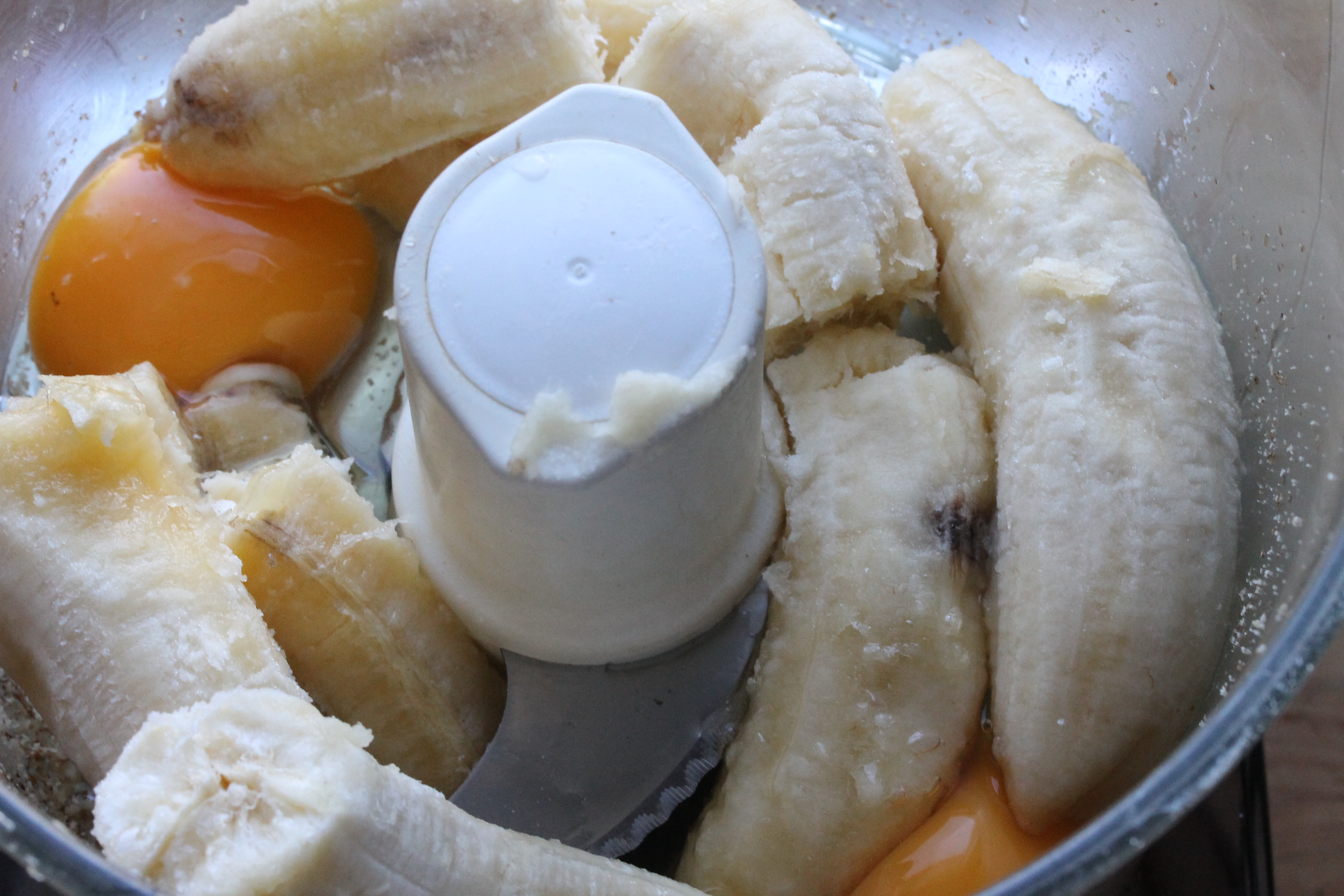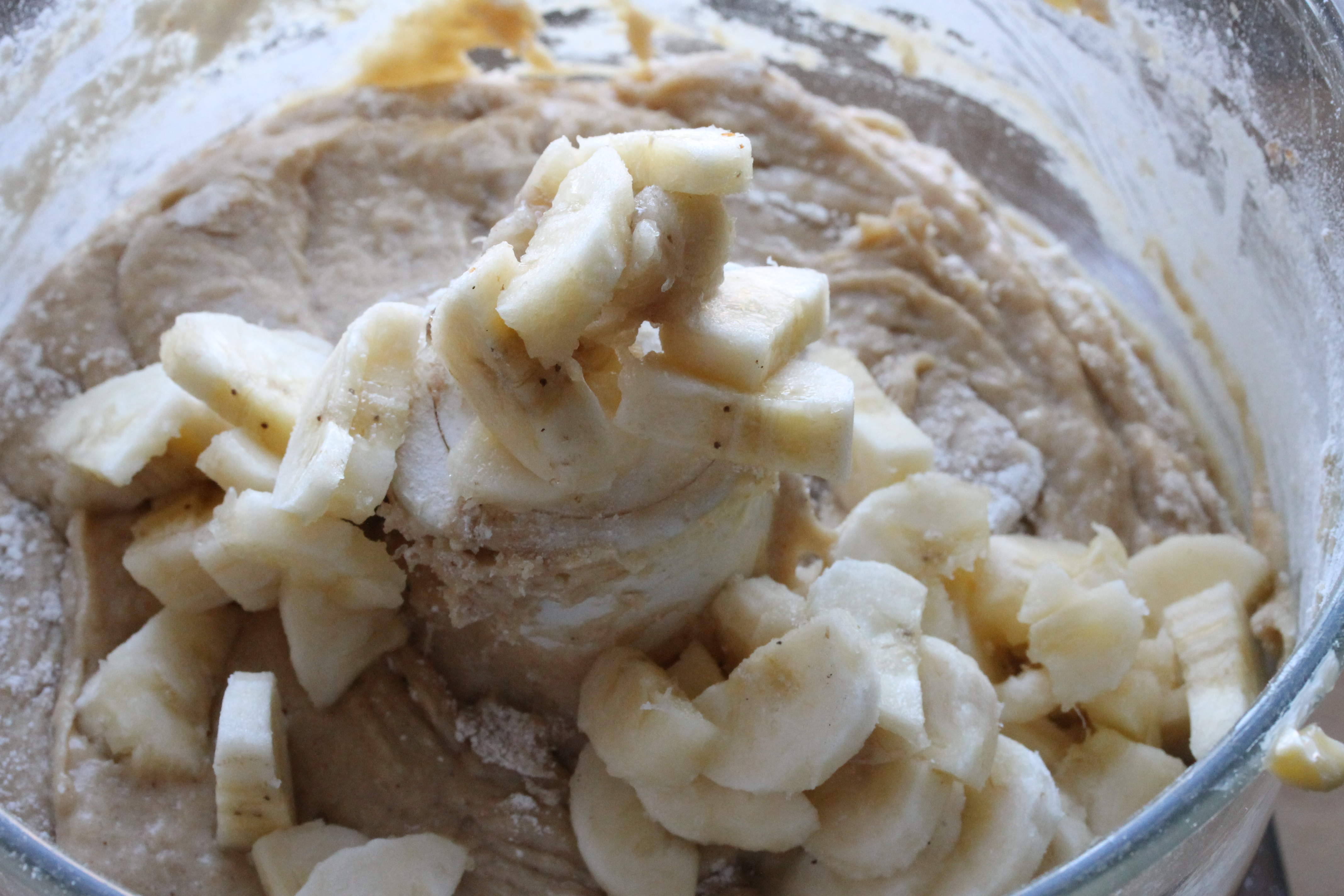 Svo blandaði ég saman 275 g af hveiti, 2 tsk af lyftidufti, 1/4 tsk af matarsóda, 1/2 tsk af salti og 1/2 tsk af kanel og hrærði saman við; best er þó að hræra deigið sem allra minnst. Að lokum skar ég bananann sem eftir var í fremur litla bita og blandaði saman við með sleikju – ekki nota hnífinn í vélinni, þá fer banannin bara í mauk.