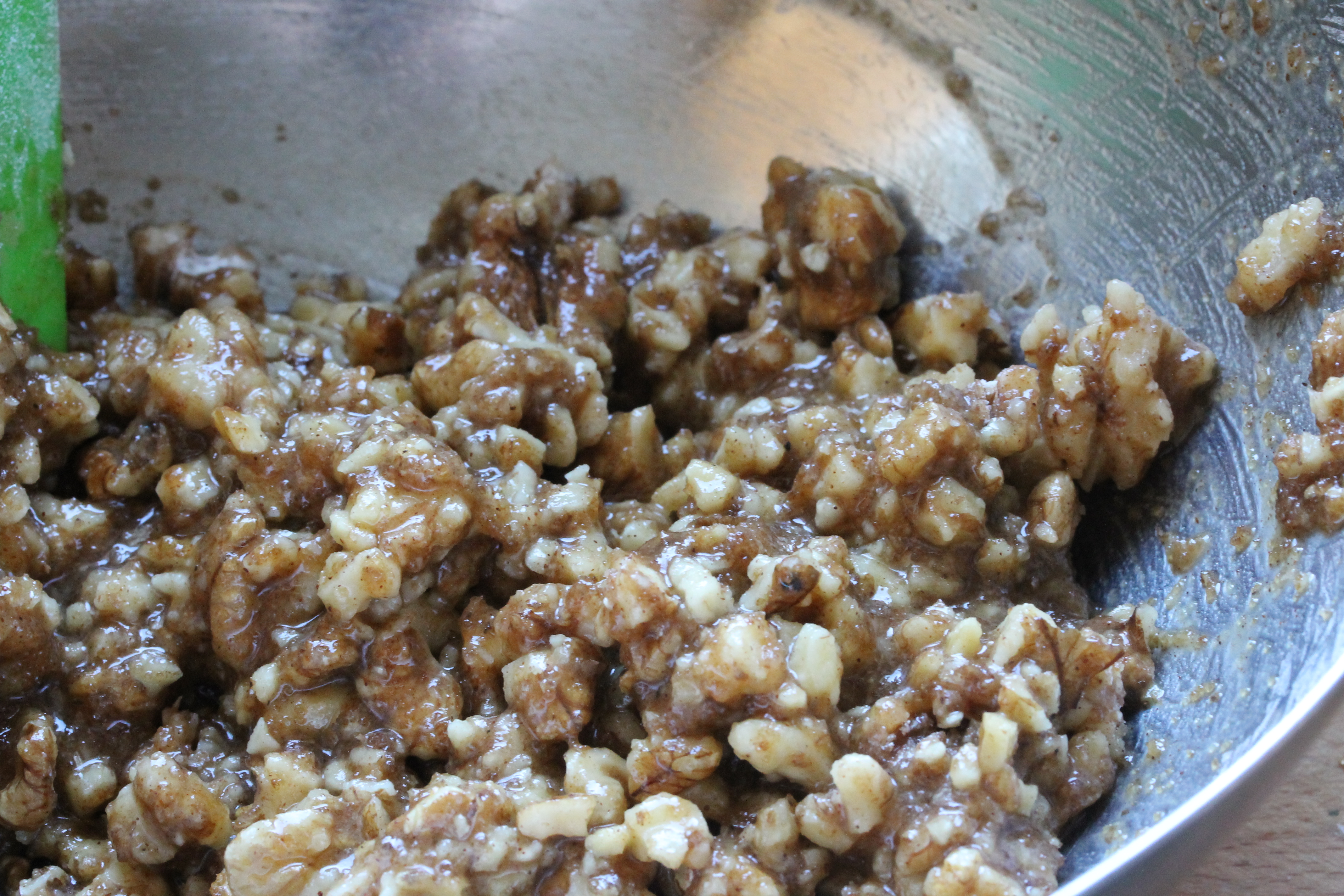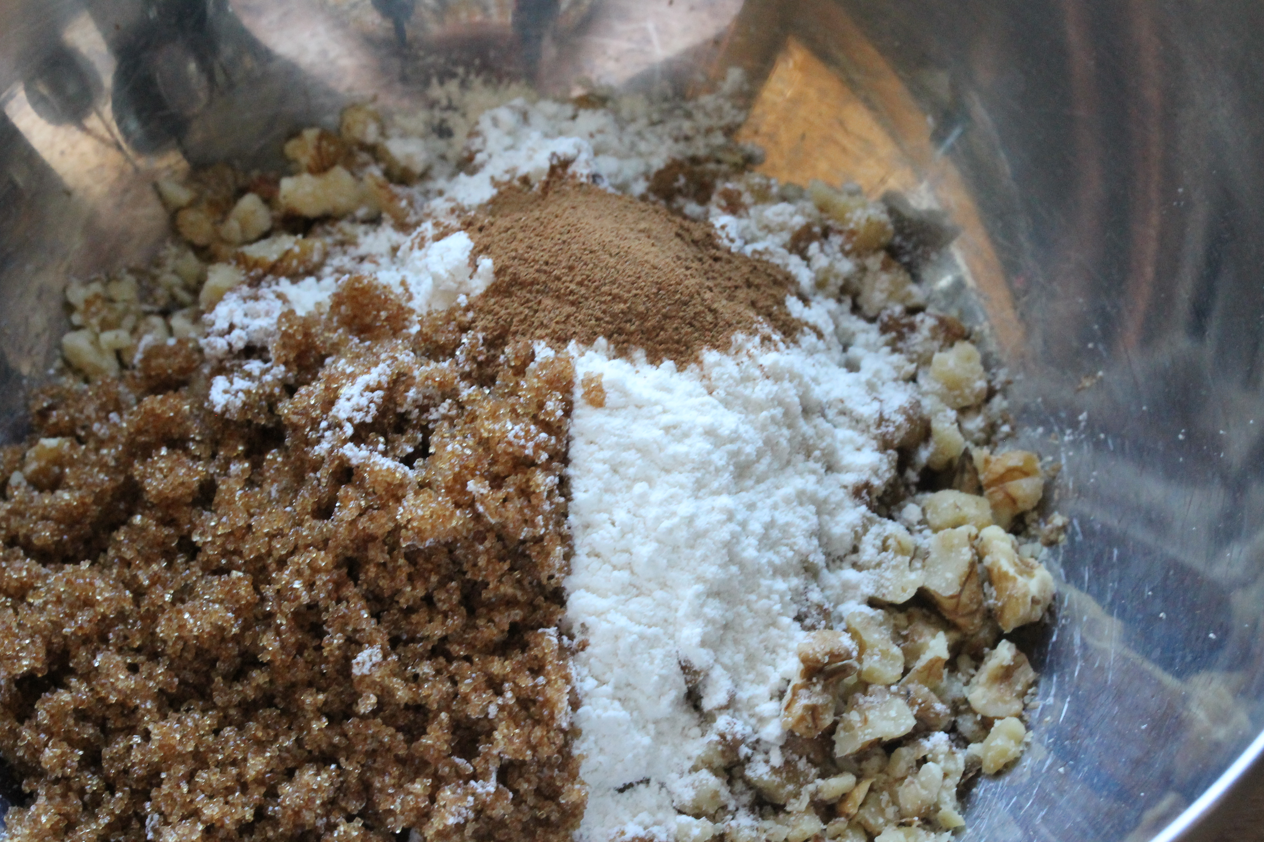 Þá var það mulningurinn ofan á: Ég setti 50 g af smjöri í lítinn pott og bræddi það. Setti valhneturnar sem ég var búin að mylja í skál ásamt 3 msk af hveiti, 3 msk af púðursykri og 1/2 tsk af kanel og blandaði saman.