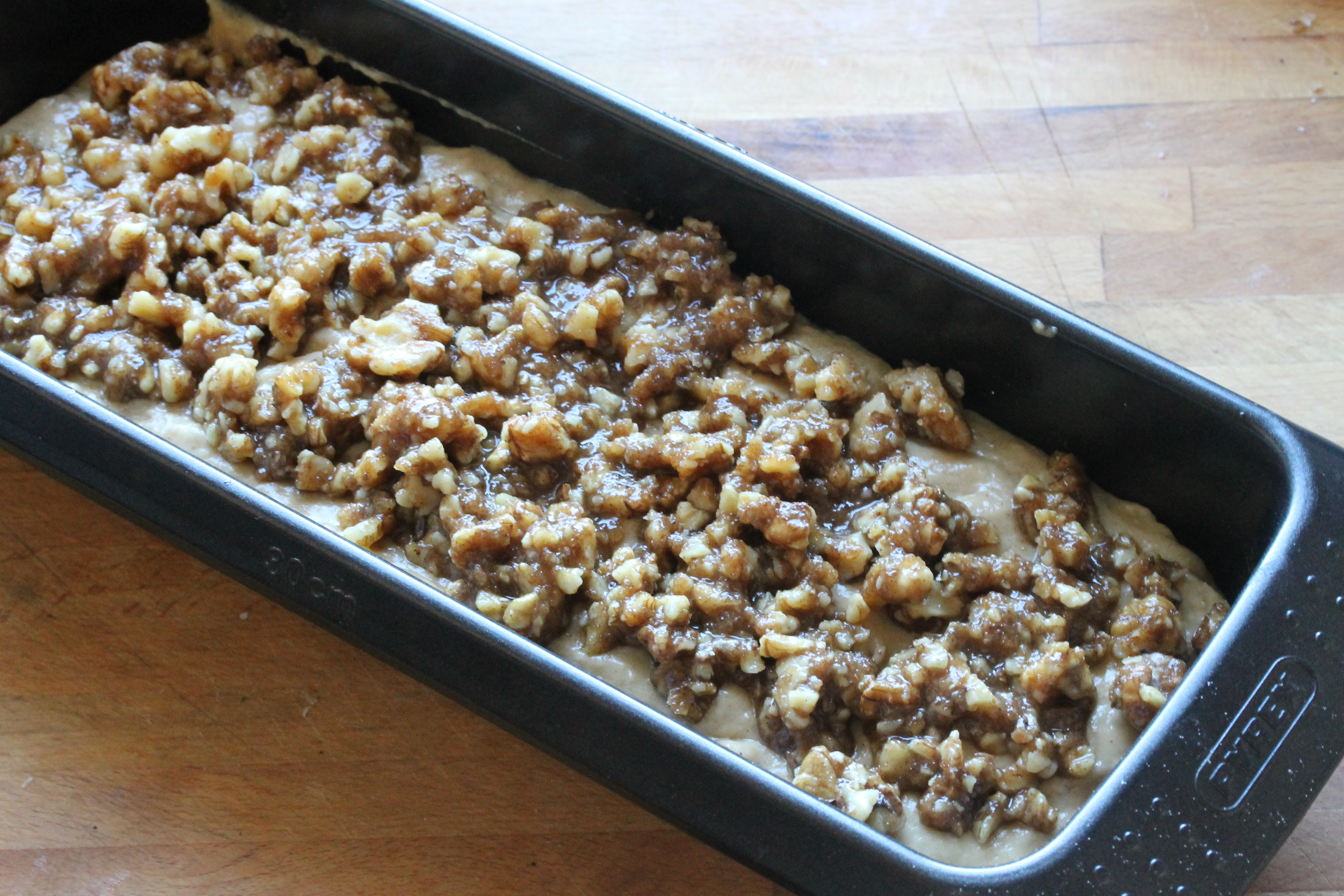 Og dreifði hnetumulningnum jafnt yfir deigið í forminu. Setti það svo í ofninn á neðstu rim og bakaði í 45-55 mínútur, eða þar til prjónn sem stungið var í miðja kökuna kom hreinn út.