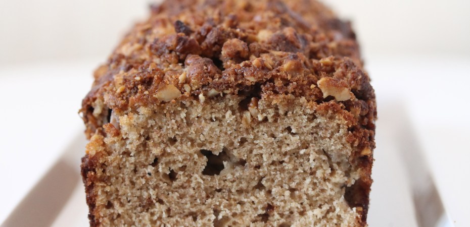 Ég lét bananabrauðið kólna í nokkra stund í forminu en losaði það svo gætilega úr (ekki hvolfa því með látum, þá er hætt við að töluvert af hnetumulningnum hrynji af) og lét það kólna alveg á grind.