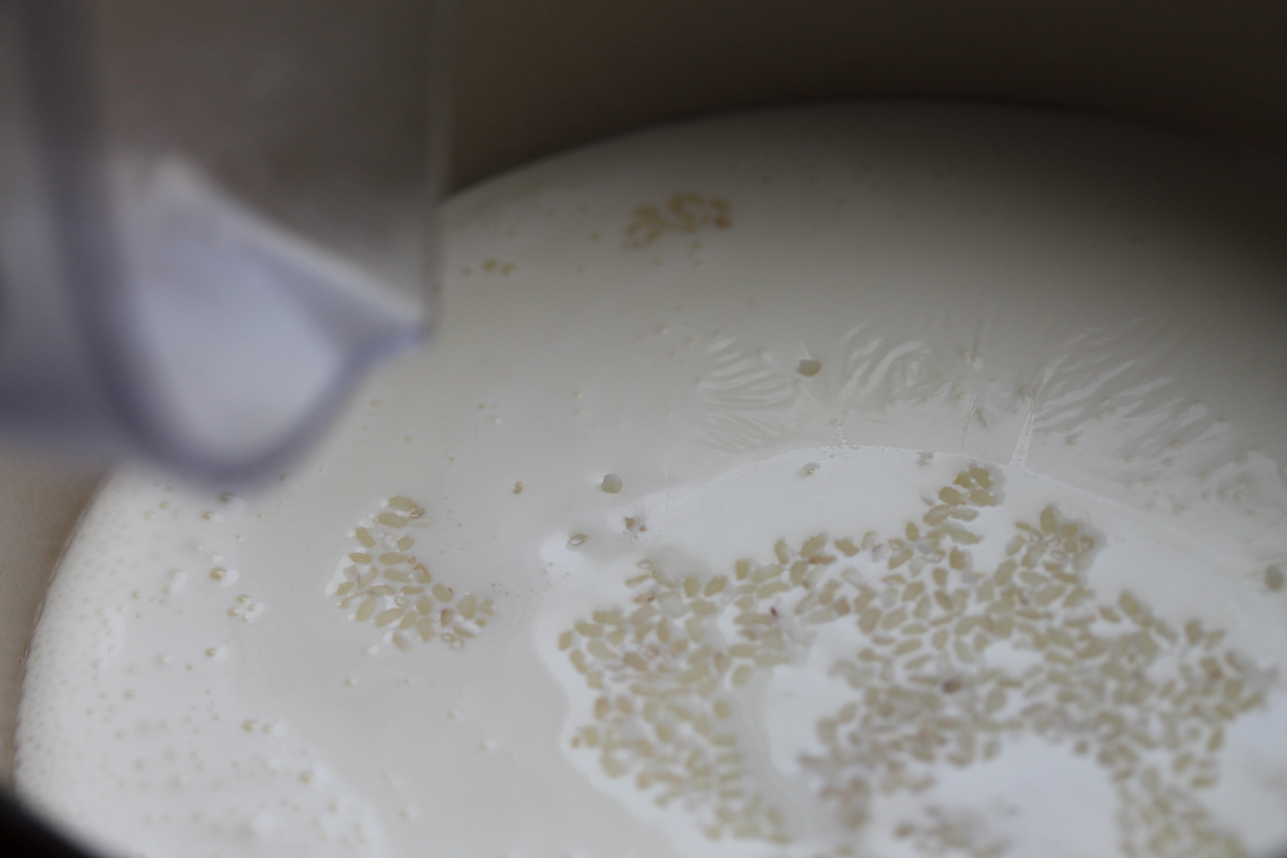 Ég byrjaði á að setja 600 ml af mjólk (þetta er skammtur fyrir 4-6) í þykkbotna pott með þéttu loki og hitaði hana rólega. Svo vigtaði ég 90 g af grautargrjónum, hellti þeim smátt og smátt út í og hrærði á meðan.