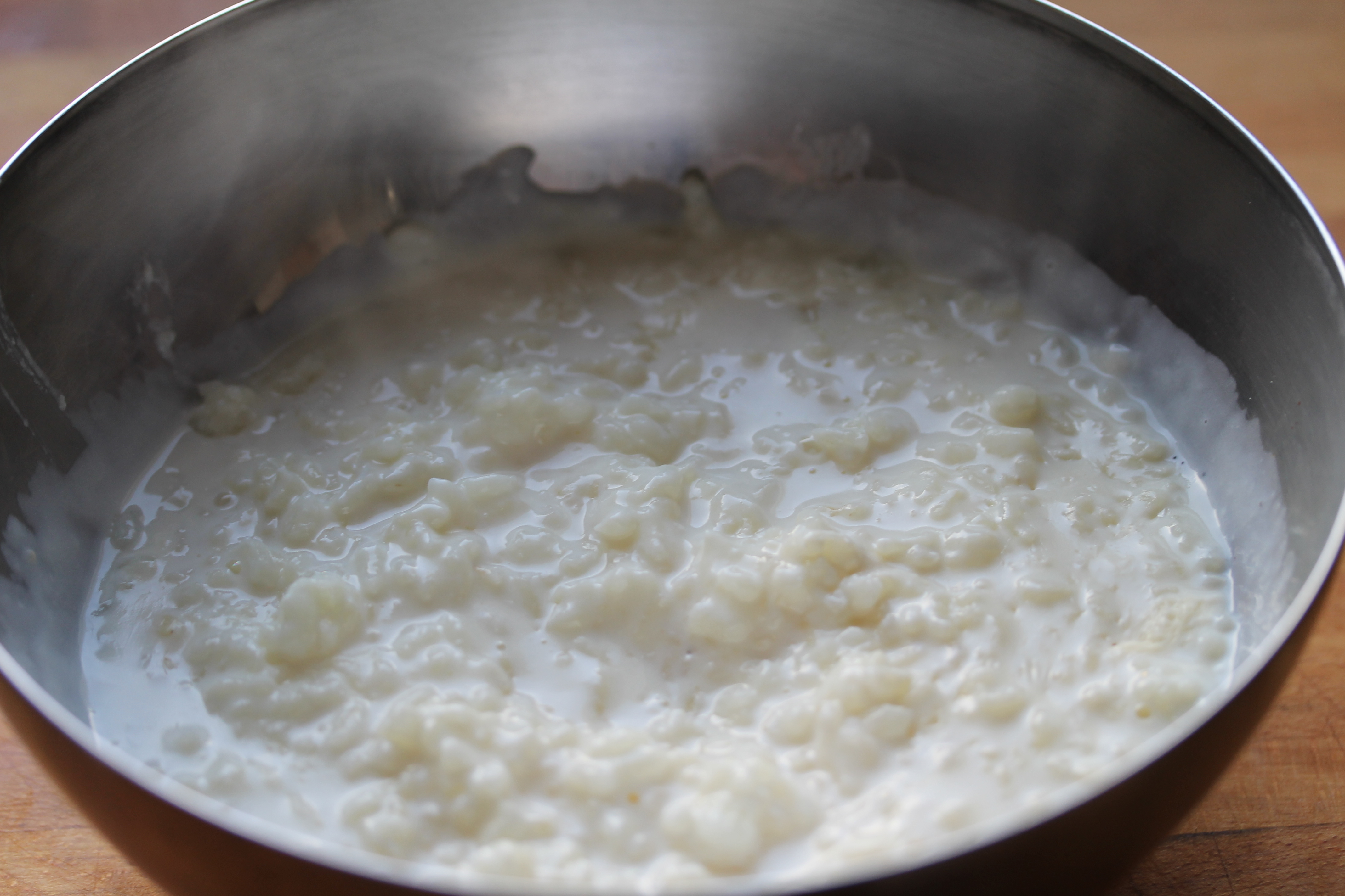 Ég setti lokið á pottinn þegar mjólkin fór að sjóða, lækkaði hitann eins og mögulegt var og lét þetta malla mjög rólega í 45−60 mínútur, eða þar til kominn er þykkur grautur. Það er ágætt að hræra nokkrum sinnum á meðan en mér finnst þess þó ekki þurfa. Það getur verið að grauturinn festist aðeins við botninn og þar sjáist svolítið í gulbrúnan lit en það er allt í lagi, maður þarf þá bara að passa að hræra ekki (eða skafa þegar grautnum er hellt úr) svo að grjónin sem aðeins hafa breytt lit fylgi ekki með.