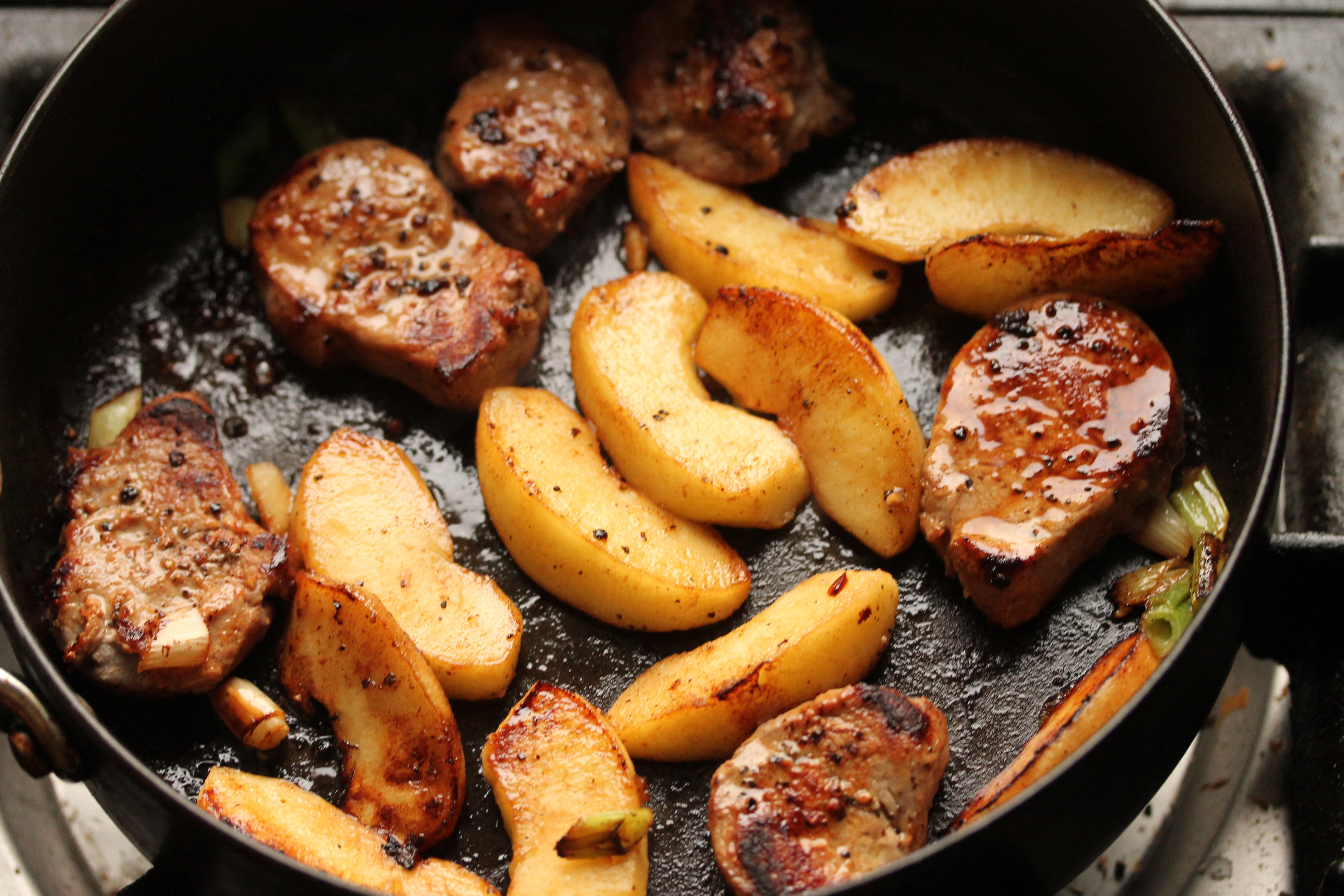 Bræddi svo smjörið á fremur stórri pönnu, raðaði kjötsneiðum og eplabátum á hana og stráði hvíta og ljósgræna hlutanum af vorlauknum yfir.