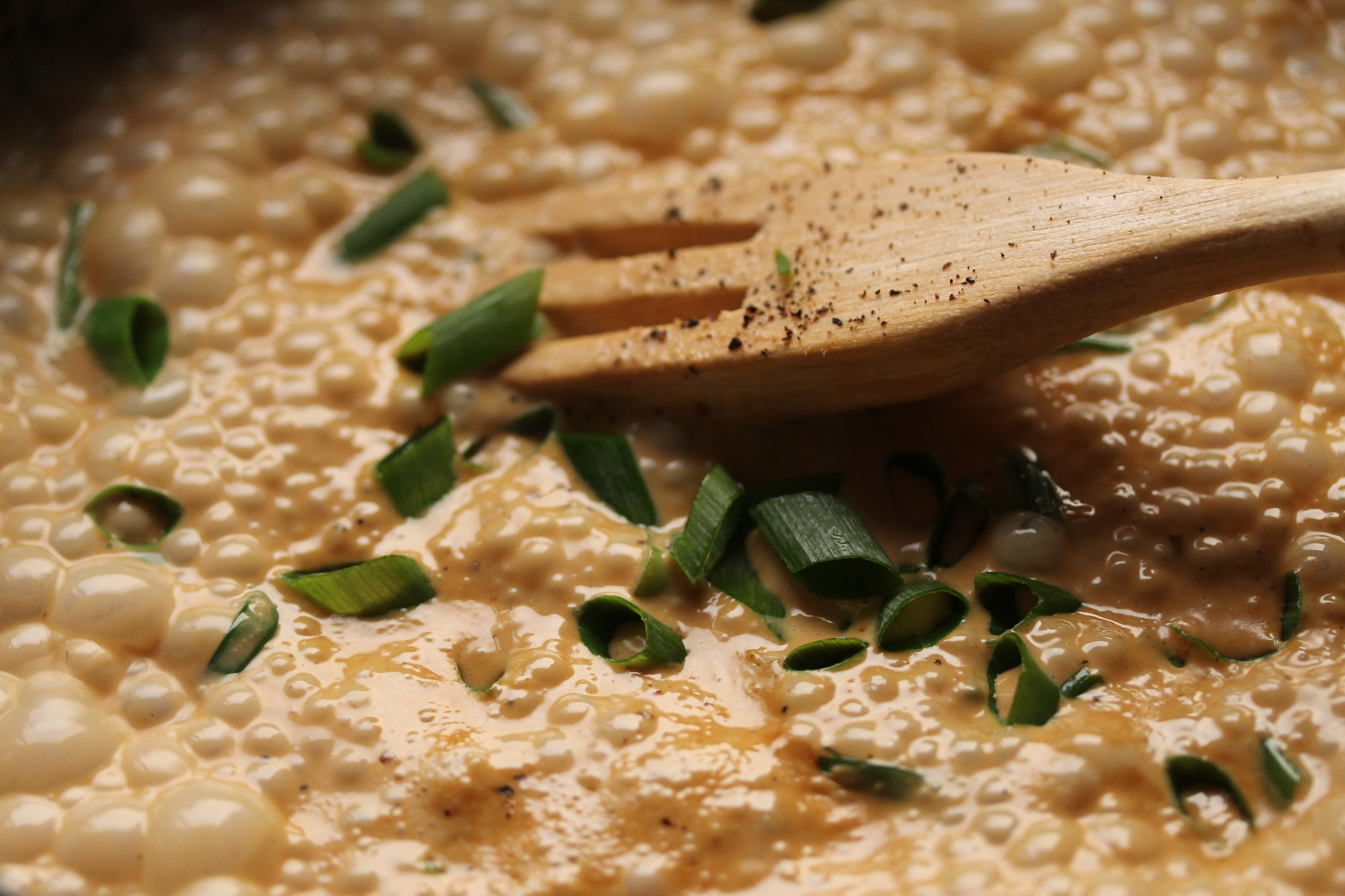 Ég hellti rjómanum á pönnuna, hrærði sinnepinu saman við ásamt grænu blöðunum af vorlauknum og lét krauma í 2-3 mínútur. Sósan á að vera frekar þunn, ef hún þykknar um of má þynna hana með ögn af vatni. Ég smakkaði hana svo og bragðbætti með pipar og salti eftir þörfum.
