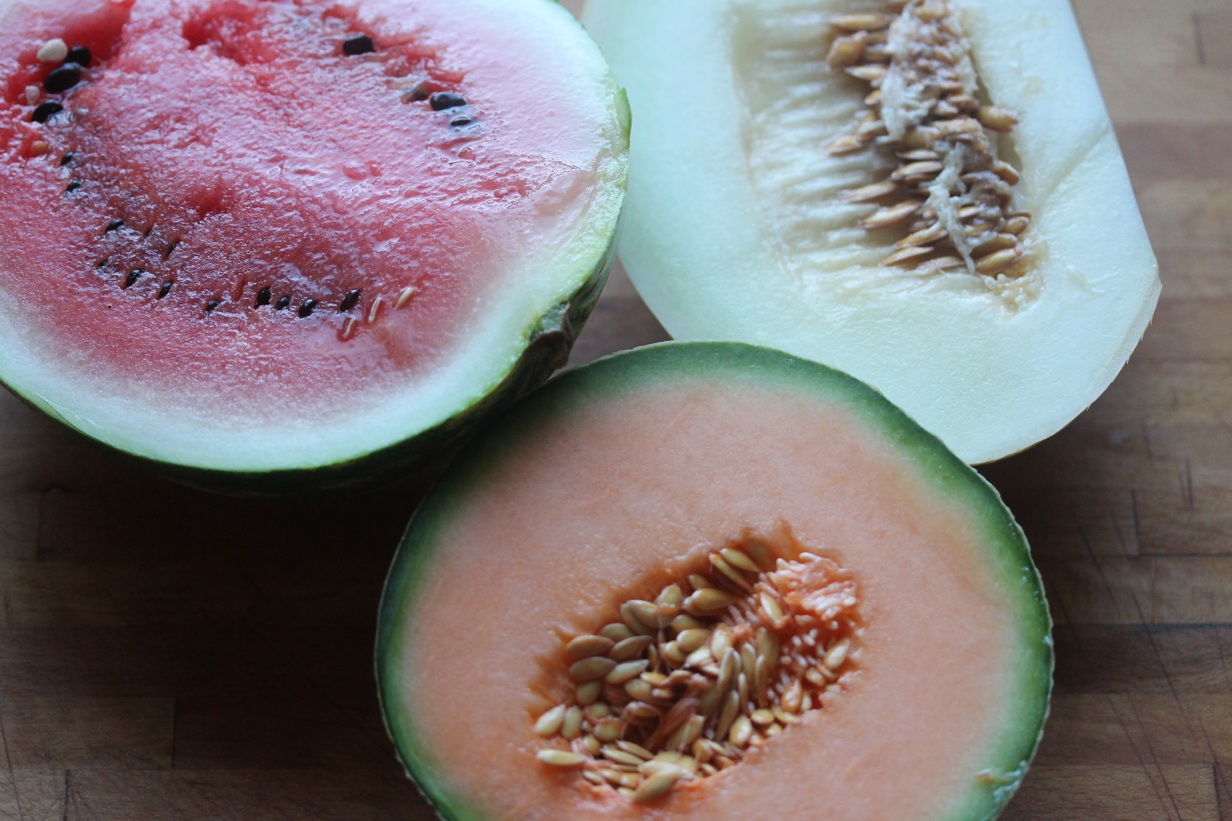 Það má líka nota bara eina eða tvær melónutegundir en mér finnst flottast að hafa nokkrar mismunandi litar. Þetta var semsagt hálf lítil vatnsmelóna, hálf hunangsmelóna og hálf gul melóna – sú síðasttalda var aðeins farin að skemmast í kantinn öðrum megin svo ég skar bara af henni. Svo skóf ég fræin úr henni og hunangsmelónunni með matskeið en lét vatnsmelónuna eiga sig, það er meira vesen að plokka fræin úr henni. Maður reynir þá frekar að tína fræin úr jafnóðum.