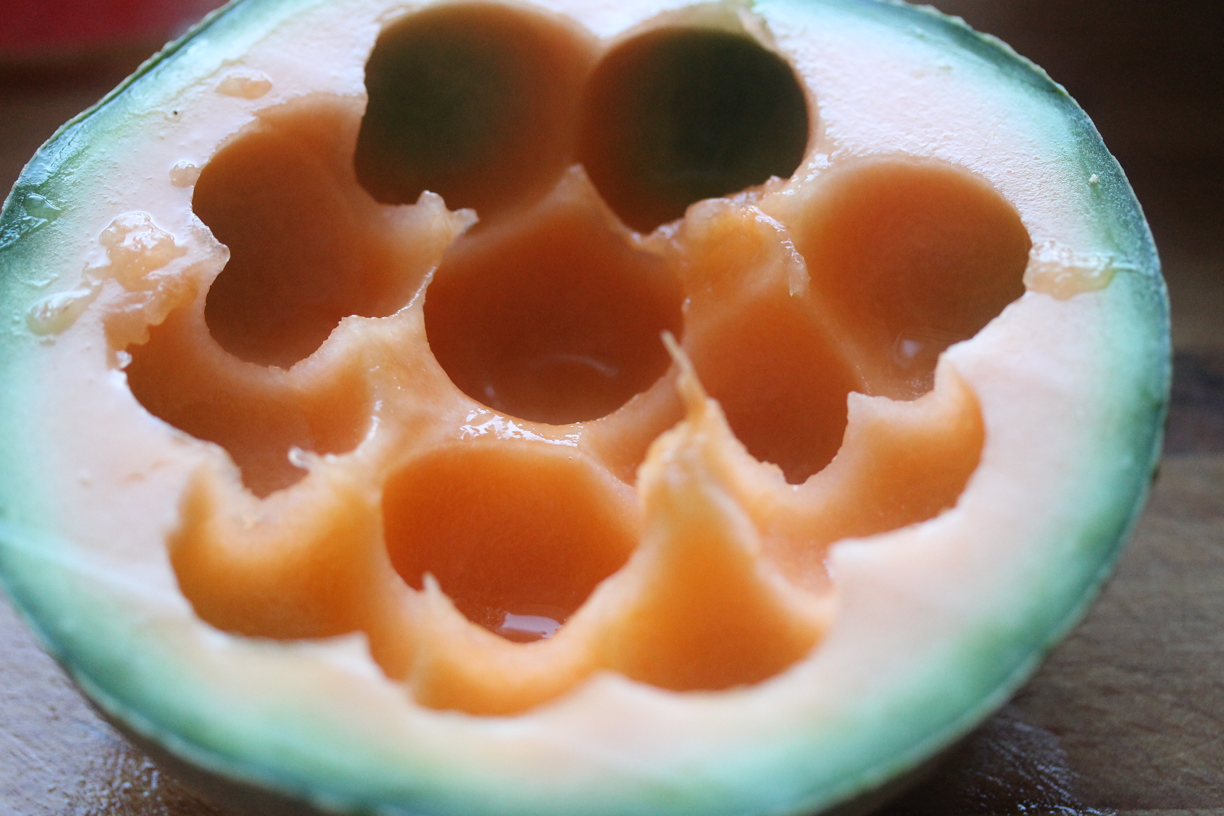 Best er að stinga járninu djúpt og fremur þétt og reyna að hafa kúlurnar eins kúlulaga og mögulegt er – en það verður auðvitað alltaf einhver sléttur flötur (eða hrufóttur, allavega ekki kúlulaga). Það sem eftir situr má svo skera úr hýðinu og mauka. Melónumaukið má nota í þeyting eða búa til ís og það er vel hægt að frysta það og nota seinna.