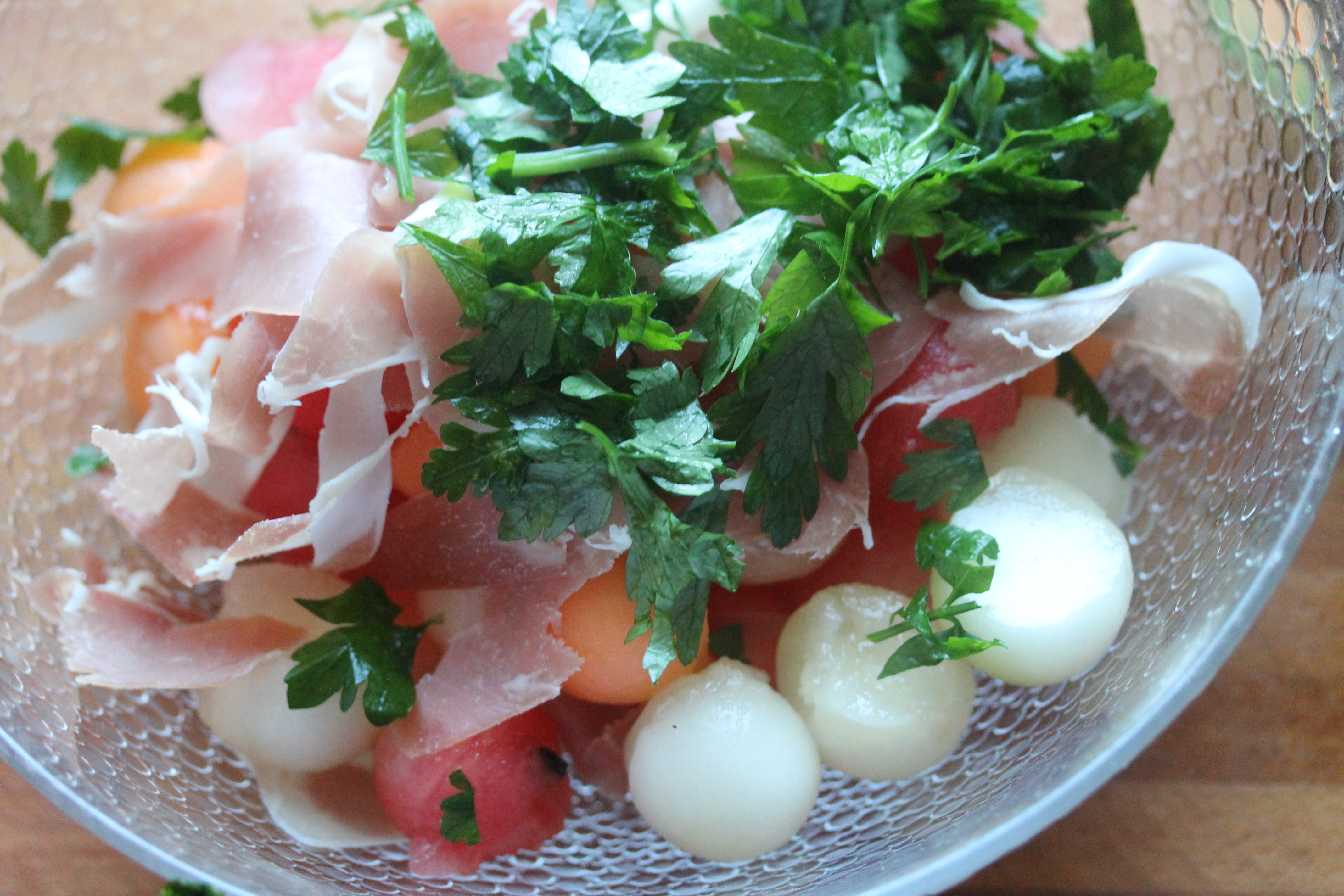 Ég á nefnilega ekki mikið af jólamatarmyndum, þegar maður er að elda sjálfan jólamatinn er myndataka kannski ekki það sem manni er efst í huga og það sem ég geri fyrirfram og í góðu tómi er kannski helst gert á kvöldin og þá tek ég nú ekki mikið af myndum. En nú var bjart – eða eins bjart og getur orðið um miðjan desember – og ósköp jólalegt svo ég ákvað að gera eitthvað sem gæti sómt sér á jólaborðinu. Og nota blessaðar melónurnar. Og svo átti ég hráskinku.