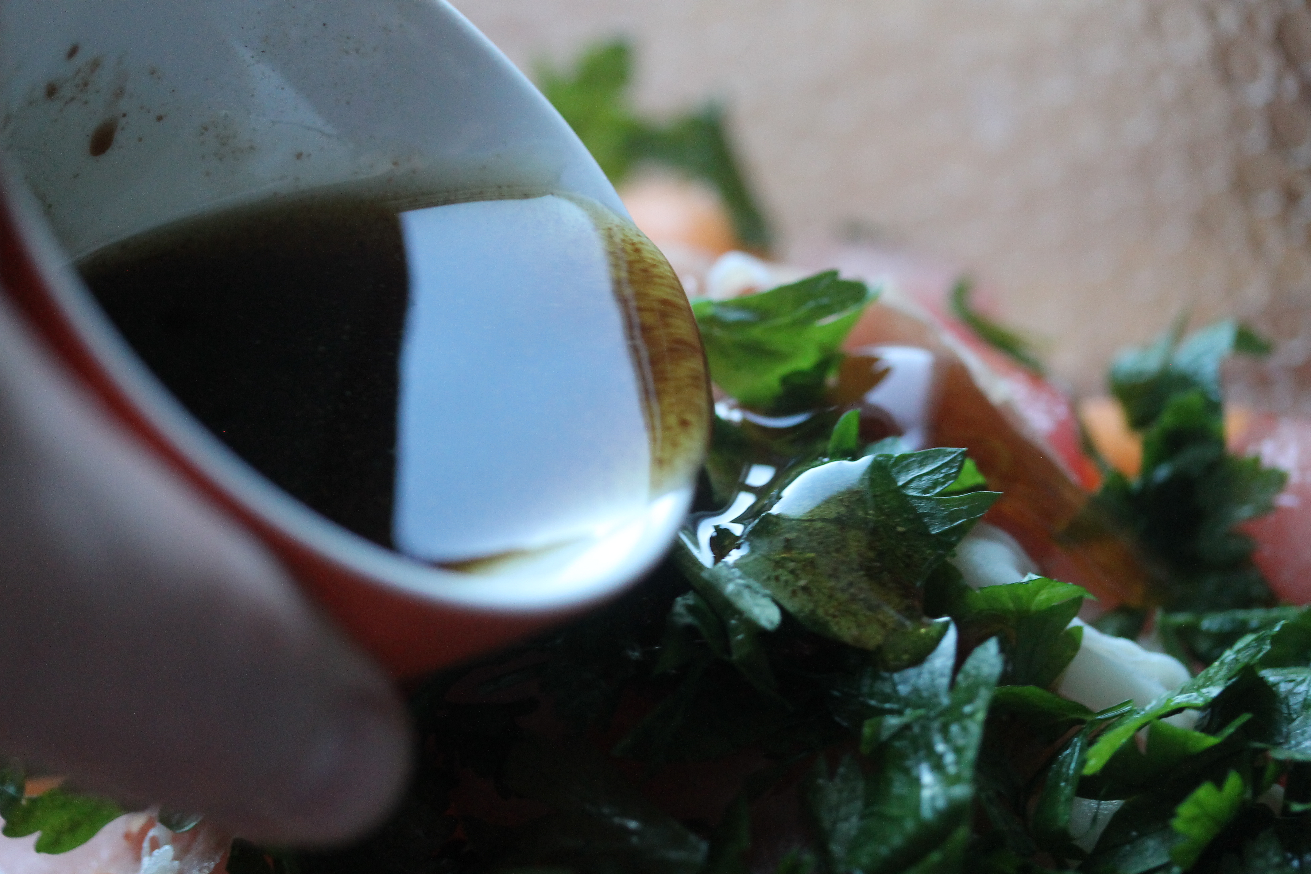 Setti 1 msk af balsamediki og 2 msk af góðri ólífuolíu í litla skál ásamt dálitlum pipar og salti, þeytti saman með gaffli, hellti yfir salatið og blandaði.