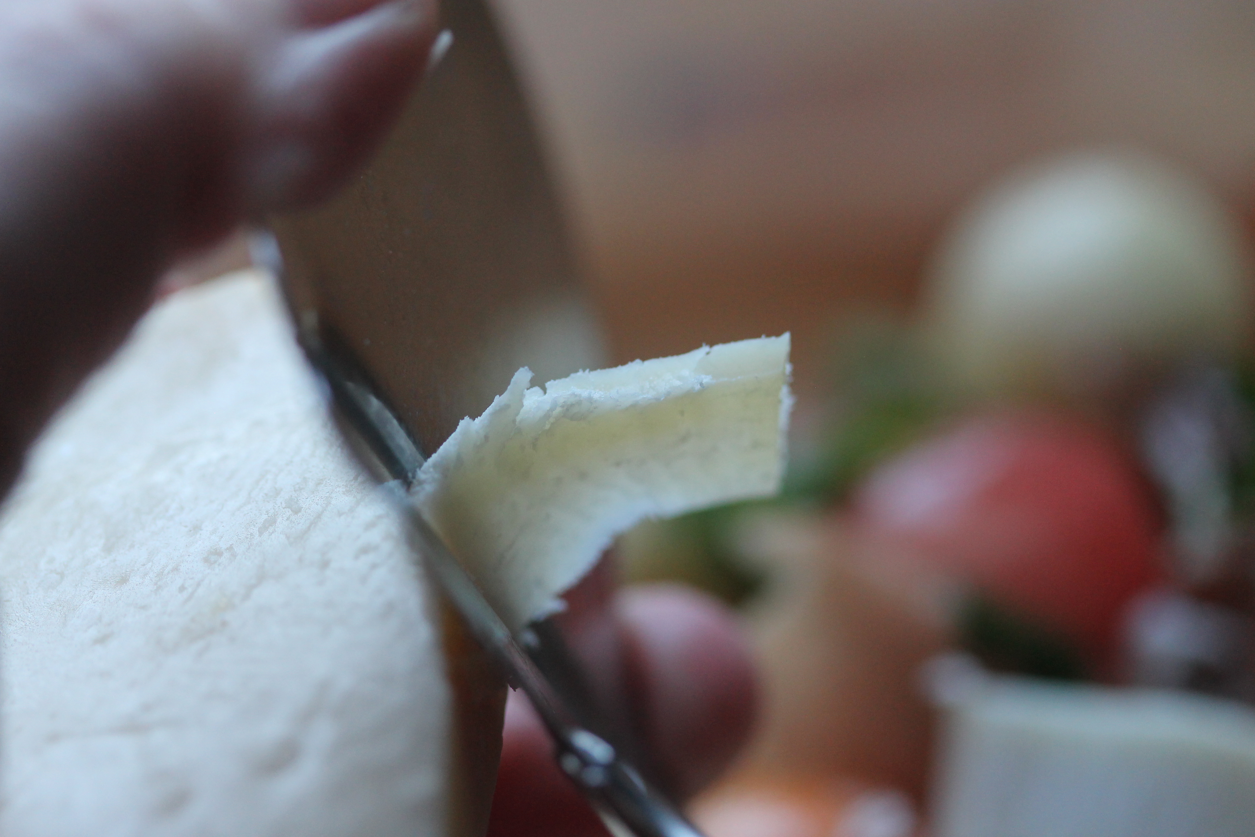 Ég setti svo salatið í skálina sem ég ætlaði að bera það fram í (það má alveg blanda það beint í skálinni en ég er svoddan subba að mér finnst snyrtilegra að nota aðra skál). Tók svo bita af parmesanosti og skar nokkrar þykkar sneiðar utan af honum með ostaskera beint yfir melónusalatið.